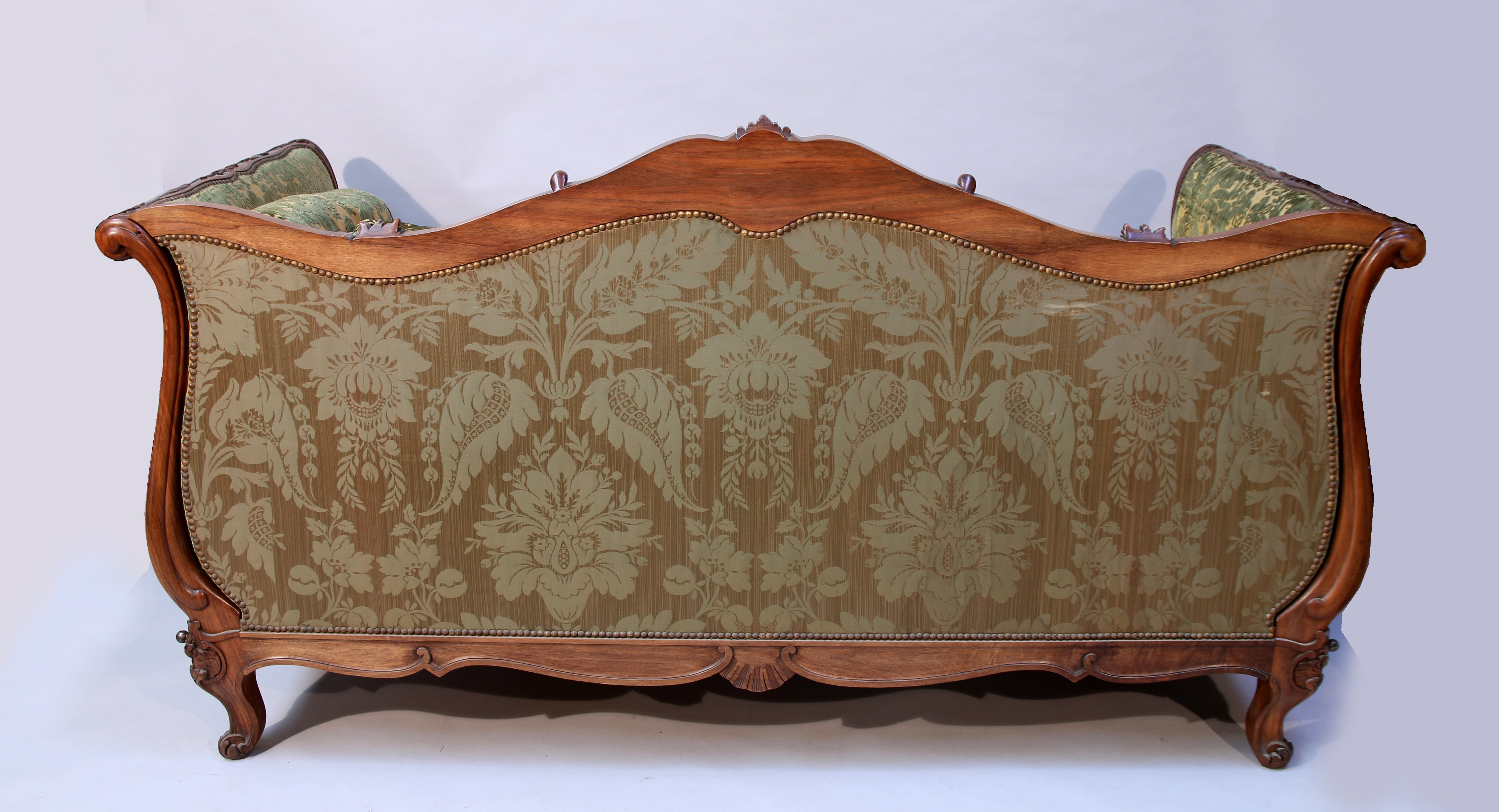 Le canapé en bois mouluré et sculpté de fleurettes et feuillages. Les chevets à crosses. La ceinture chantournée au cul de lampe orné de branchages. Reposant sur quatre pieds cambrés. Garni de coussins en velours vert (petits accidents).