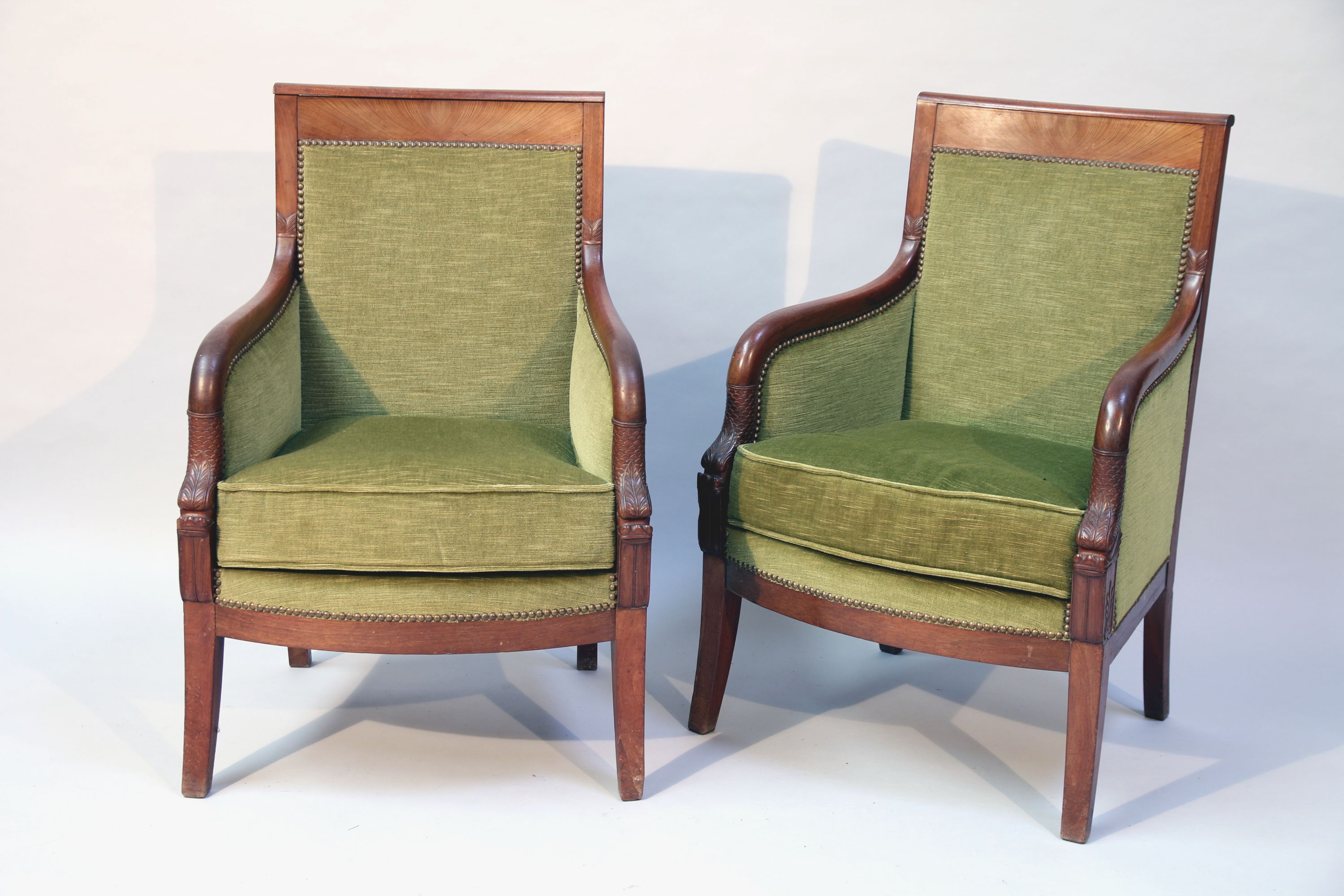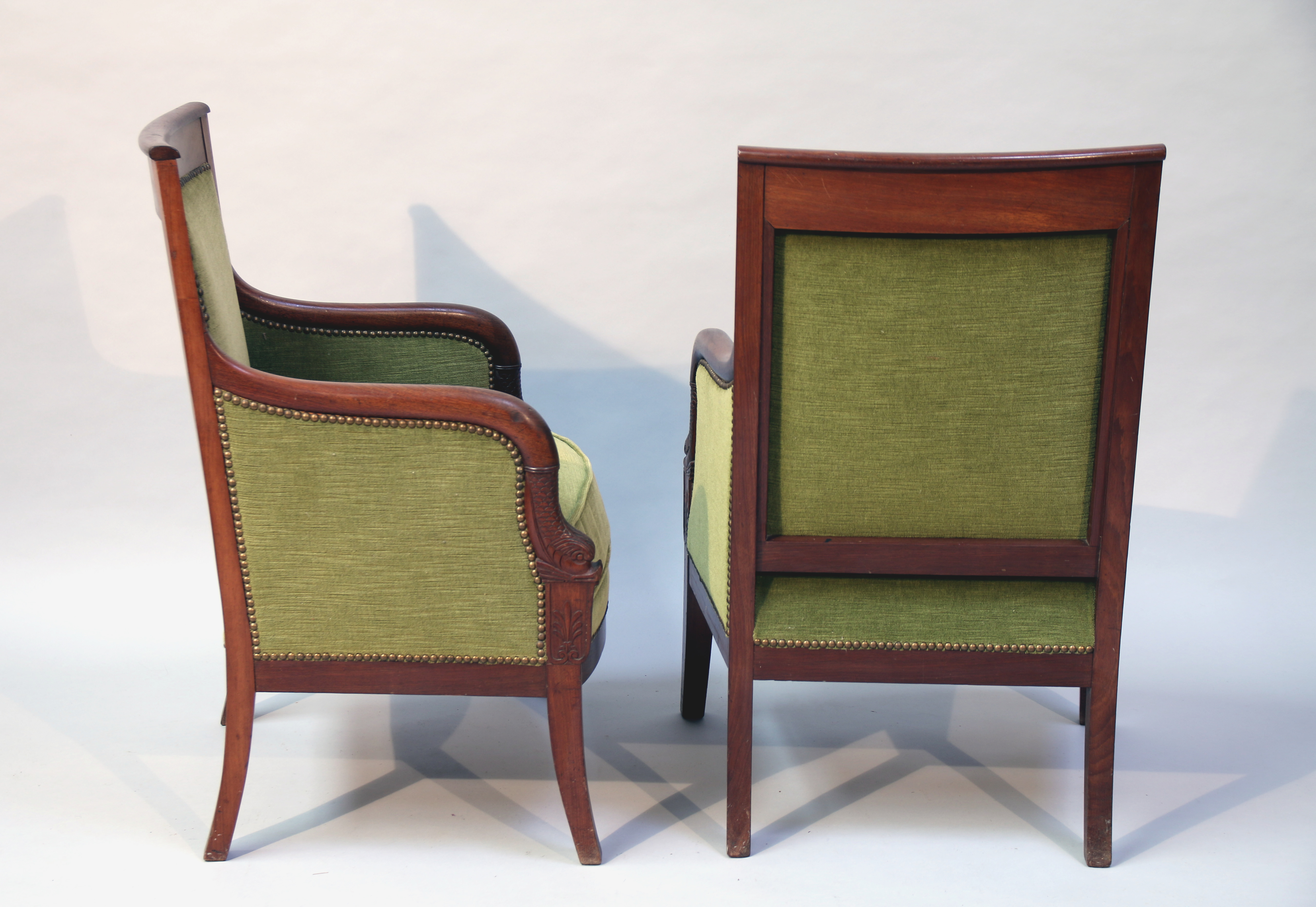en acajou et placage d'acajou. Consoles d'accotoirs sculptées à tête de dauphin. Dossiers légèrement incurvés. Elles reposent sur quatre pieds sabre.
