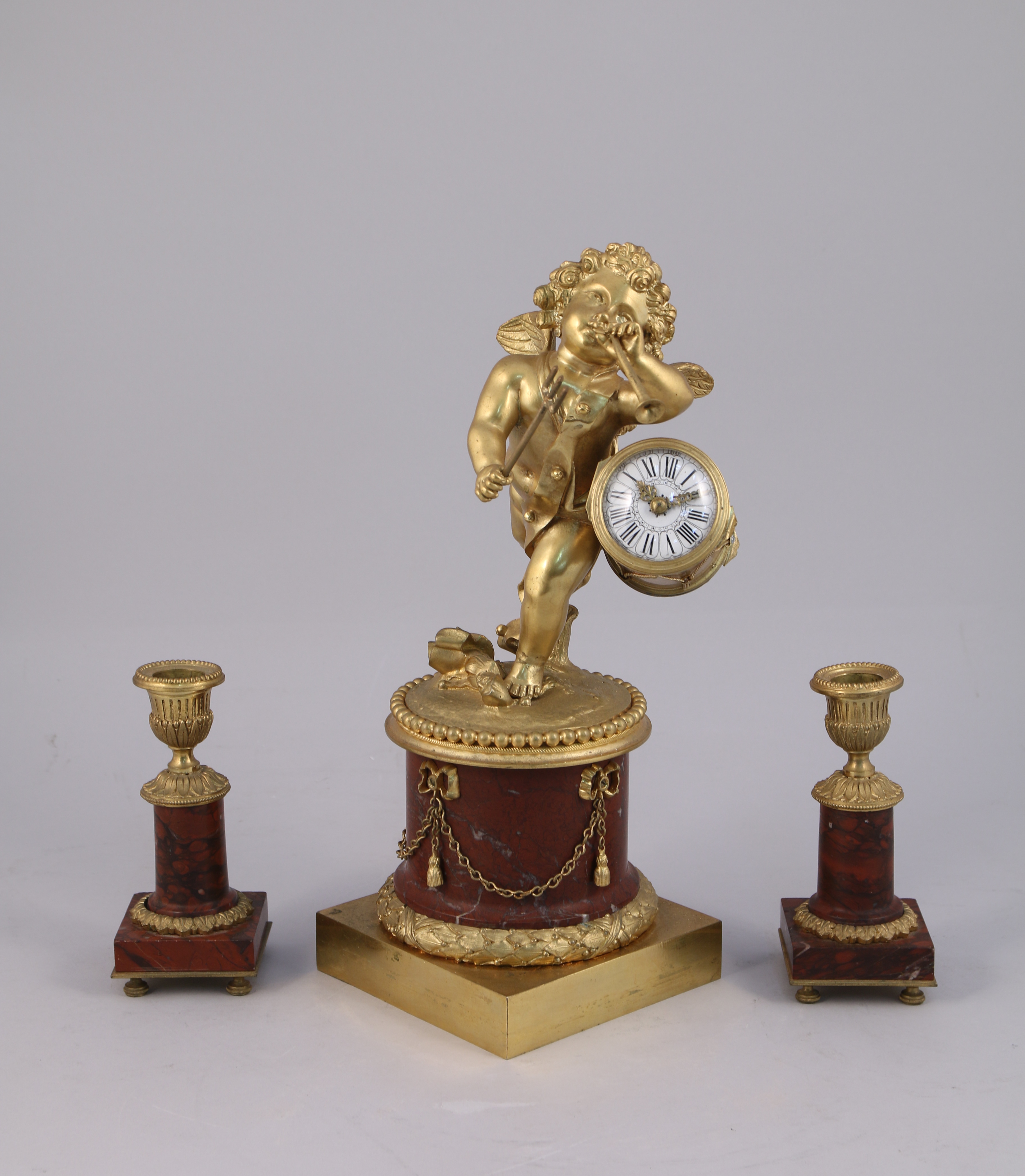 GARNITURE de CHEMINÉE en bronze ciselé et doré et marbre griotte rouge comprenant :