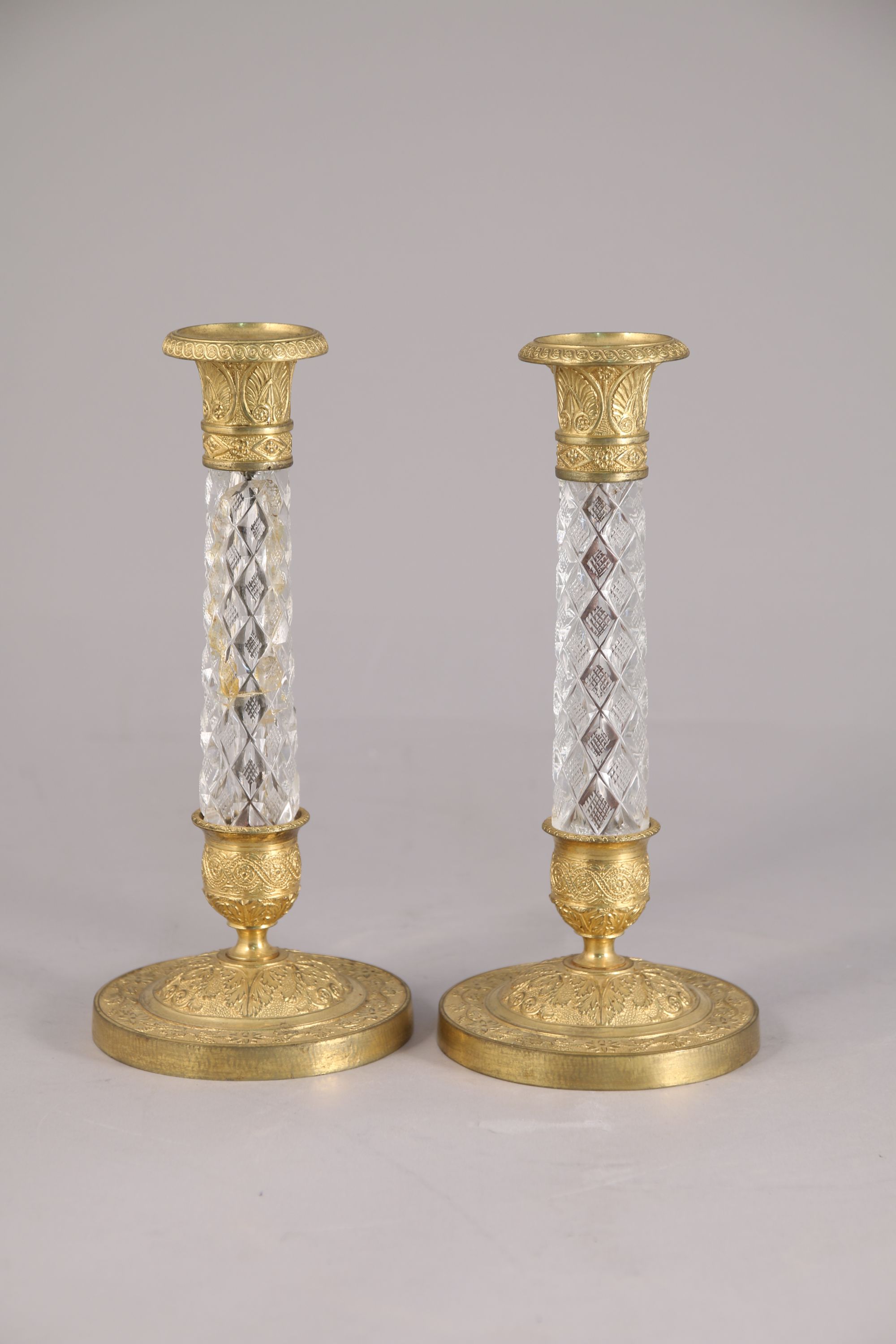 en bronze doré et fût en cristal taillé de losanges. Décor de palmettes, entrelacs, acanthes, volutes et fleurons.