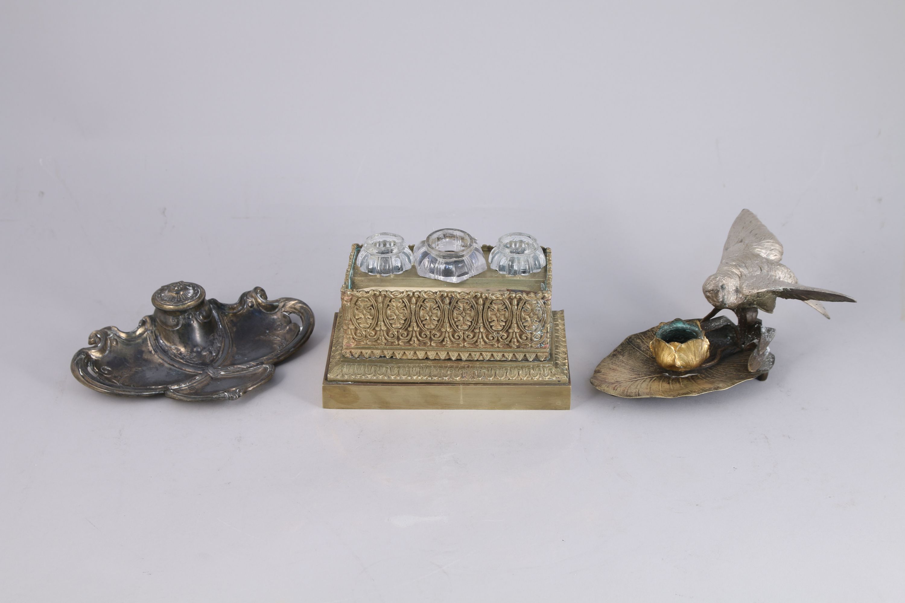 - ENCRIER trilobé de forme chantournée en étain à décor de feuillages stylisés. Vers 1900. Haut. 5, Long. 19 cm.