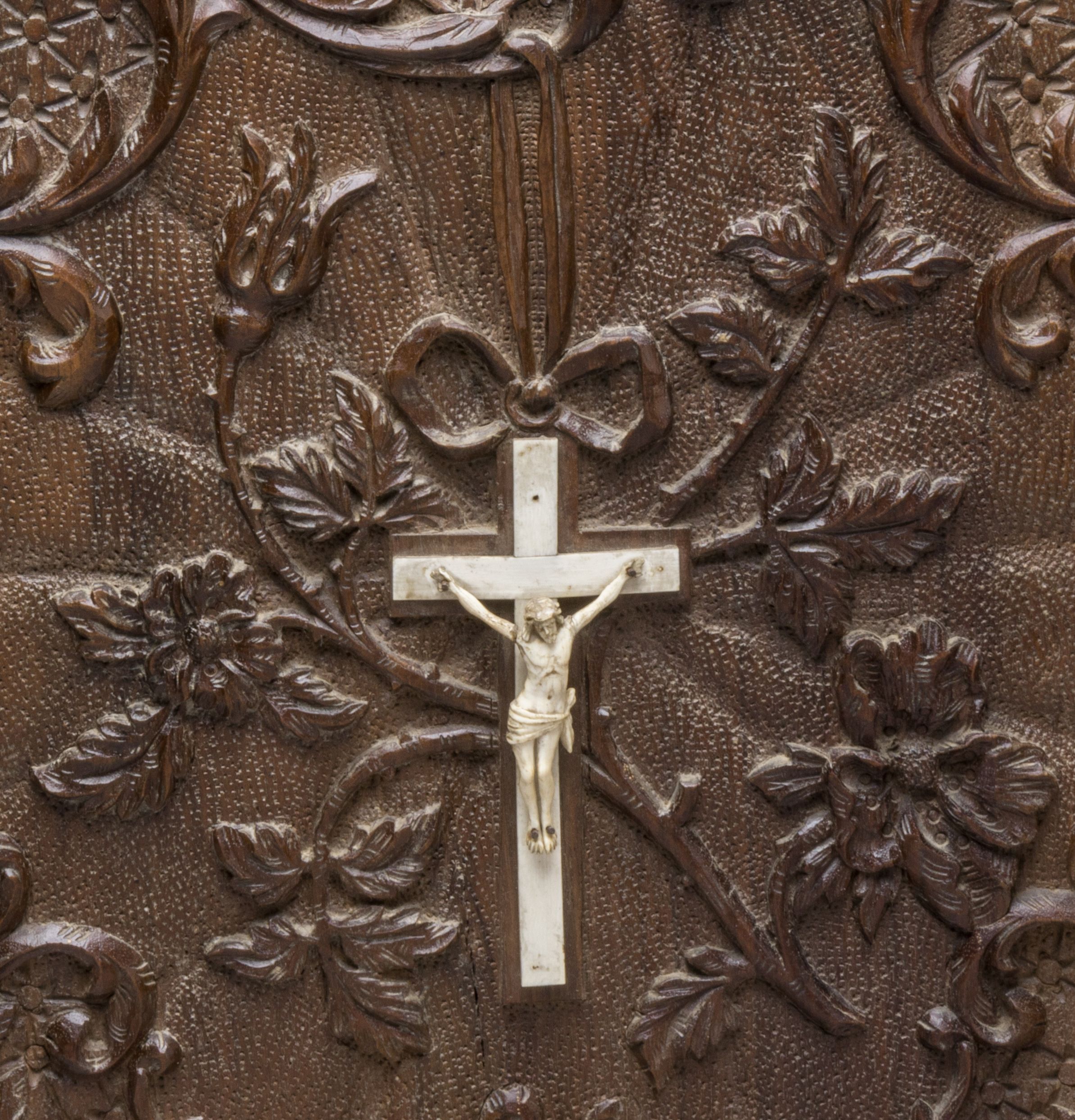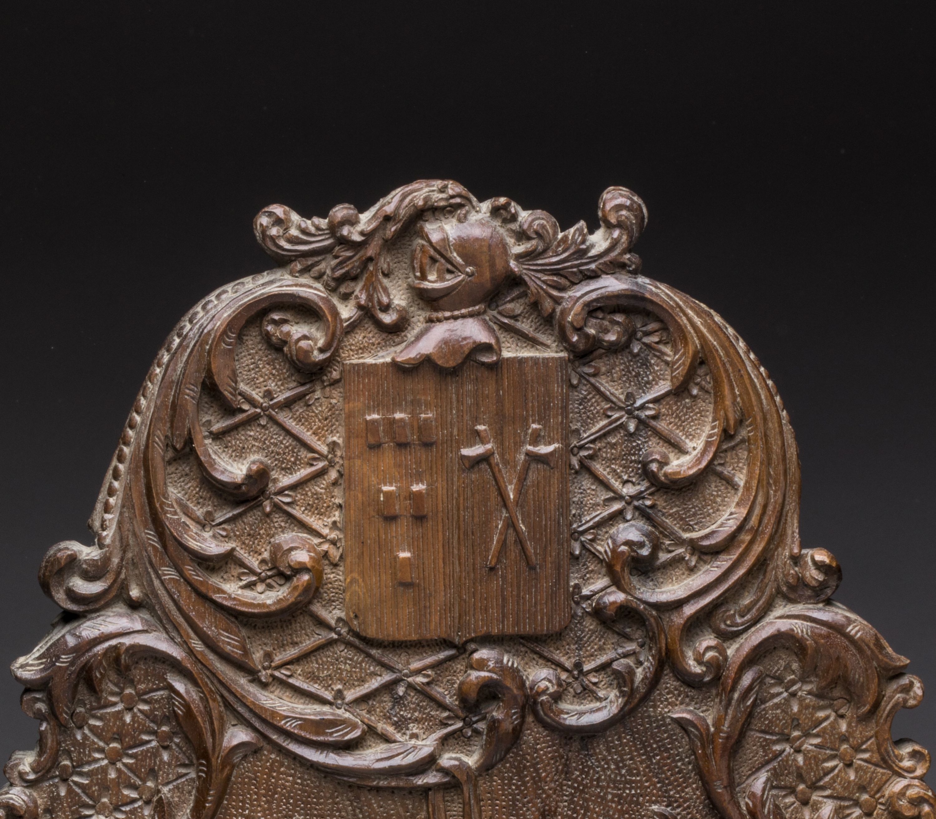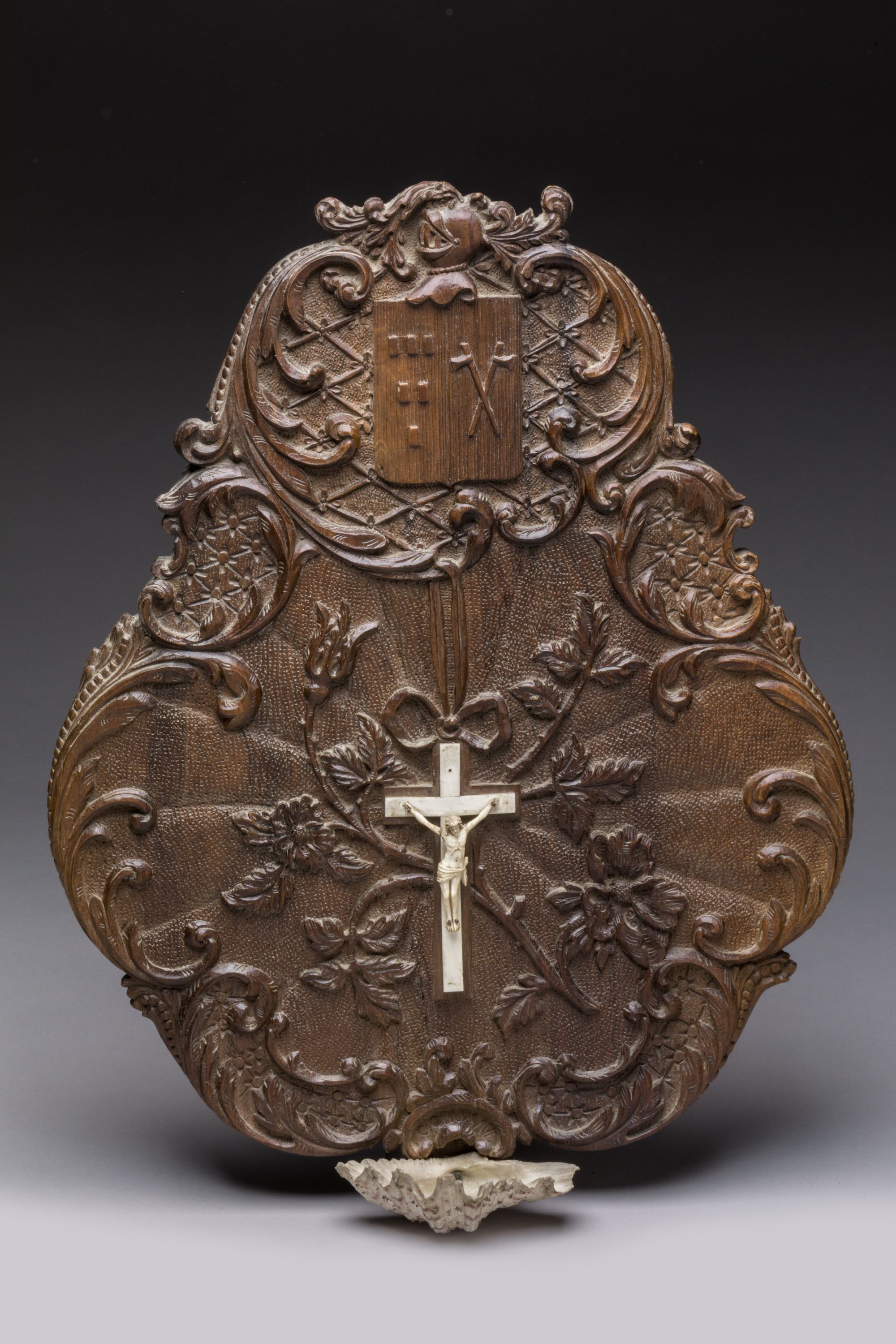 en bois finement sculpté à décor d'une branche de rosier fleurie et d'armoiries timbrées d'un heaume à lambrequins dans un encadrement d'agrafes feuillagées. Il est appliqué d'un crucifix en ivoire (elephantidae SPP) et agrémenté d'une coquille de bivalve.