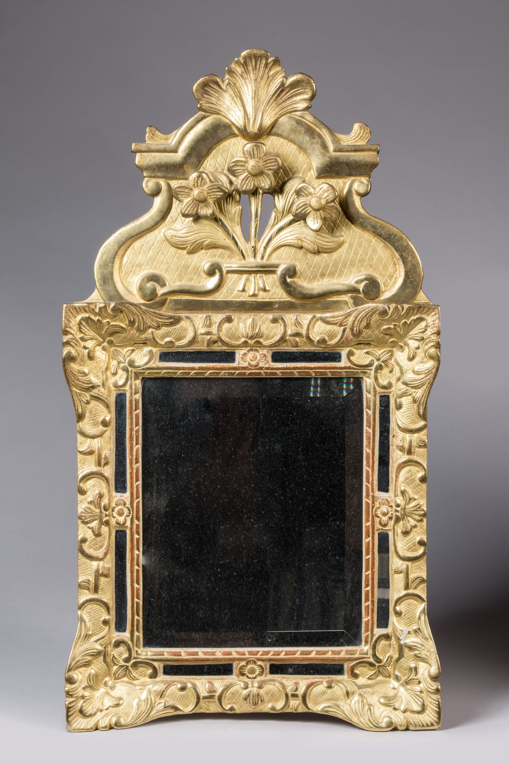 - Miroir à parecloses à fronton en bois sculpté, stuqué et redoré. Encadrement de glace à décor de fleurons, agrafes feuillagées et acanthes. Fronton ajouré orné de trois fleurettes et sommé d'une palmette. Haut. 78, Larg. 42 cm. (glace remplacée, restaurations)