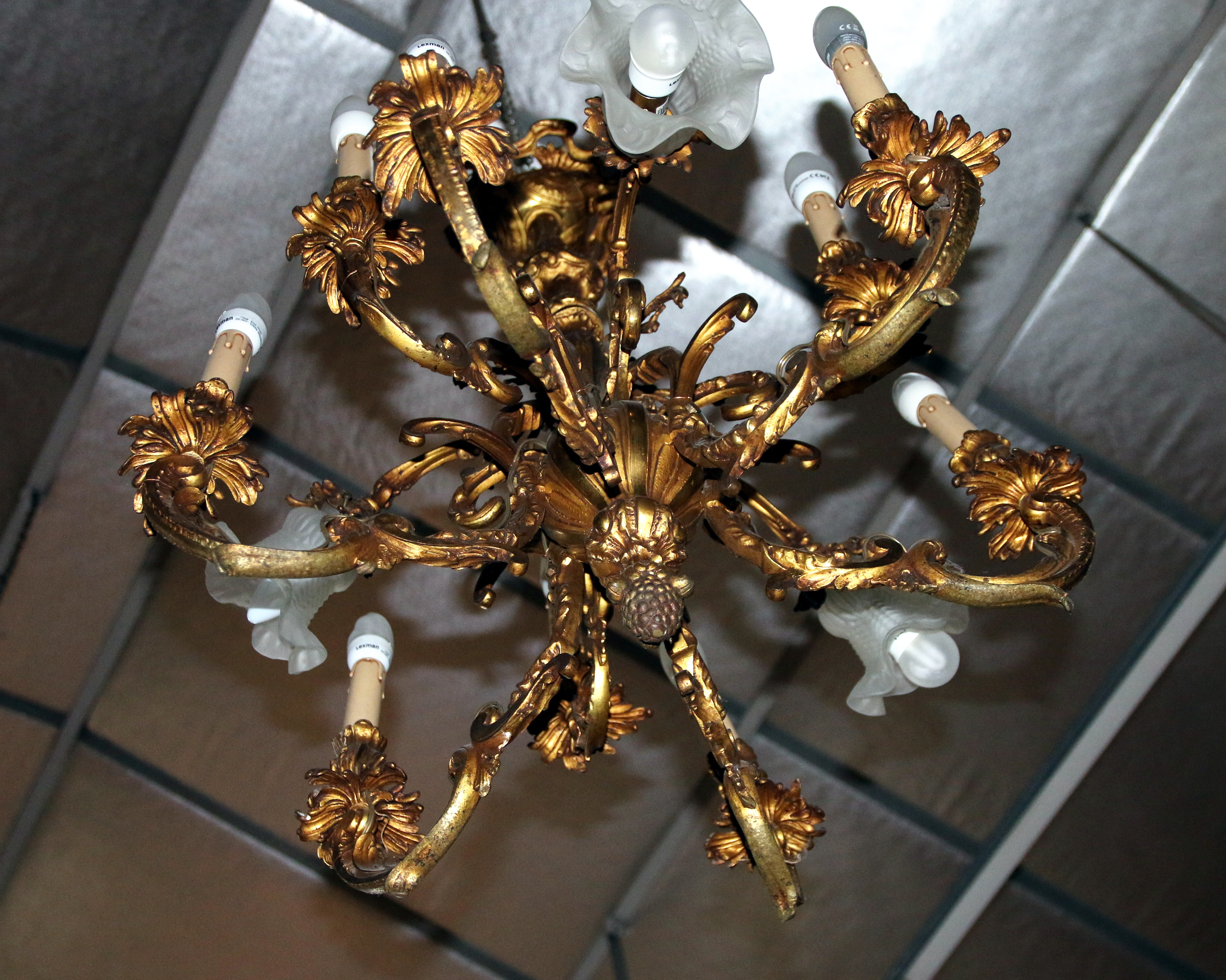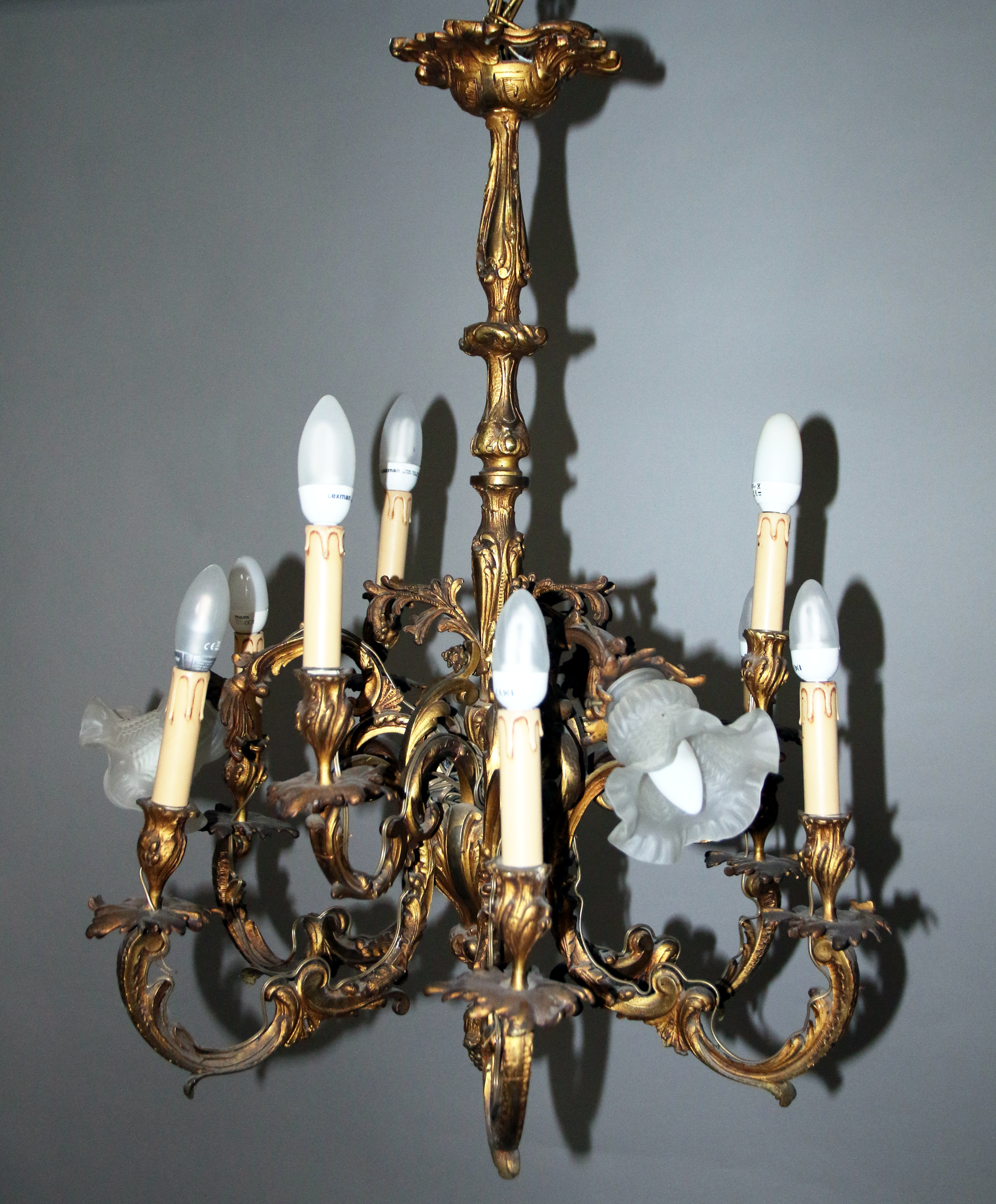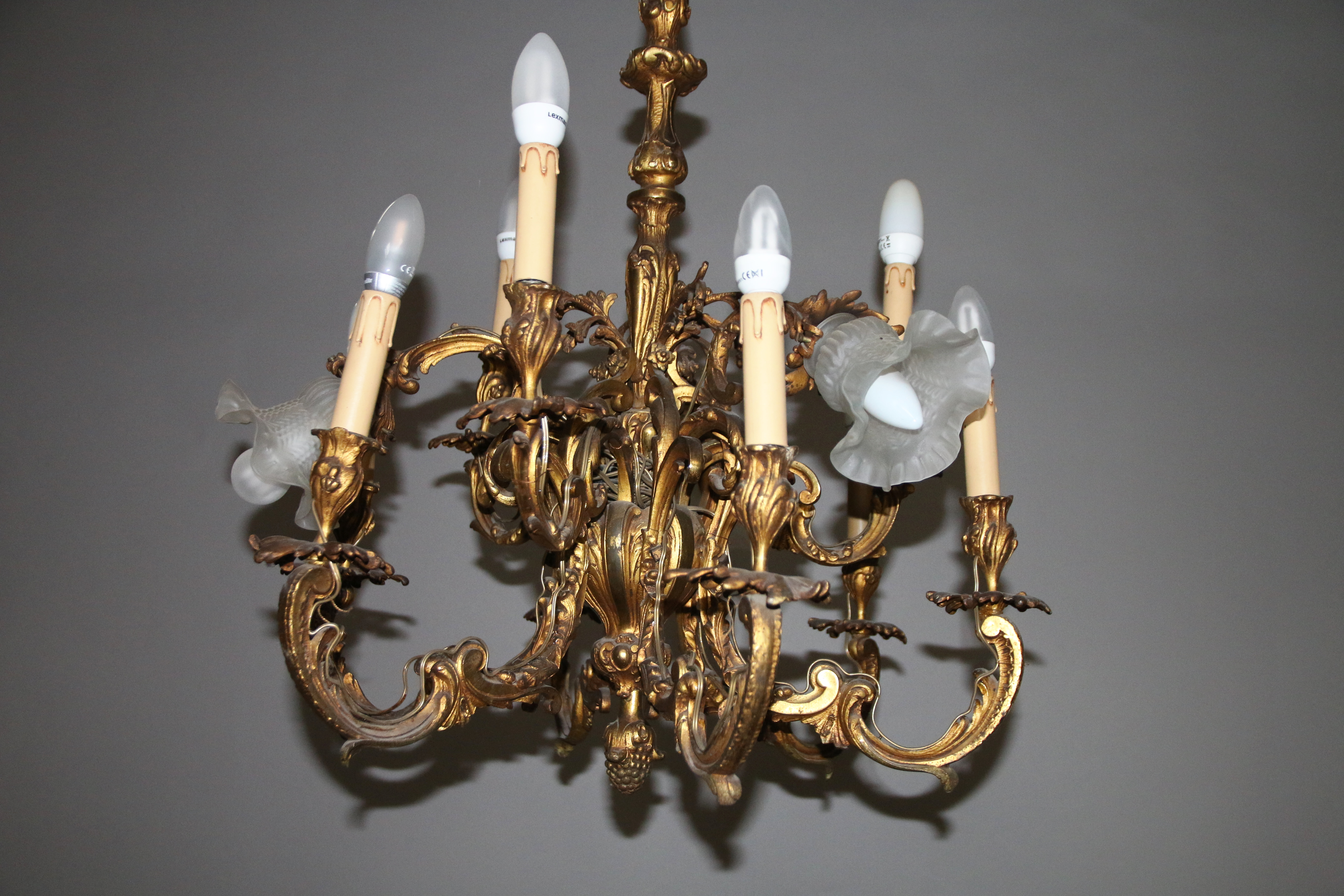 à neuf bras de lumière et trois tulipes en verre sablé. Riche décor d'agrafes feuillagées, enroulements et acanthes. Une graine à l'amortissement.