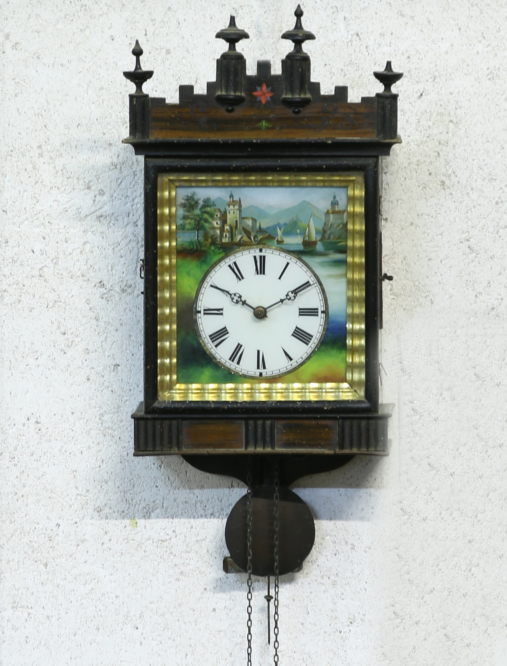 de forme rectangulaire. Caisse en bois teinté et peint à la façon du palissandre sommée d'un chapiteau présentant quatre toupies à l'amortissement (deux cassées). Le cadran blanc de forme ronde s'inscrit dans un fixé sous verre figurant une scène lacustre. Mouvement à balancier.