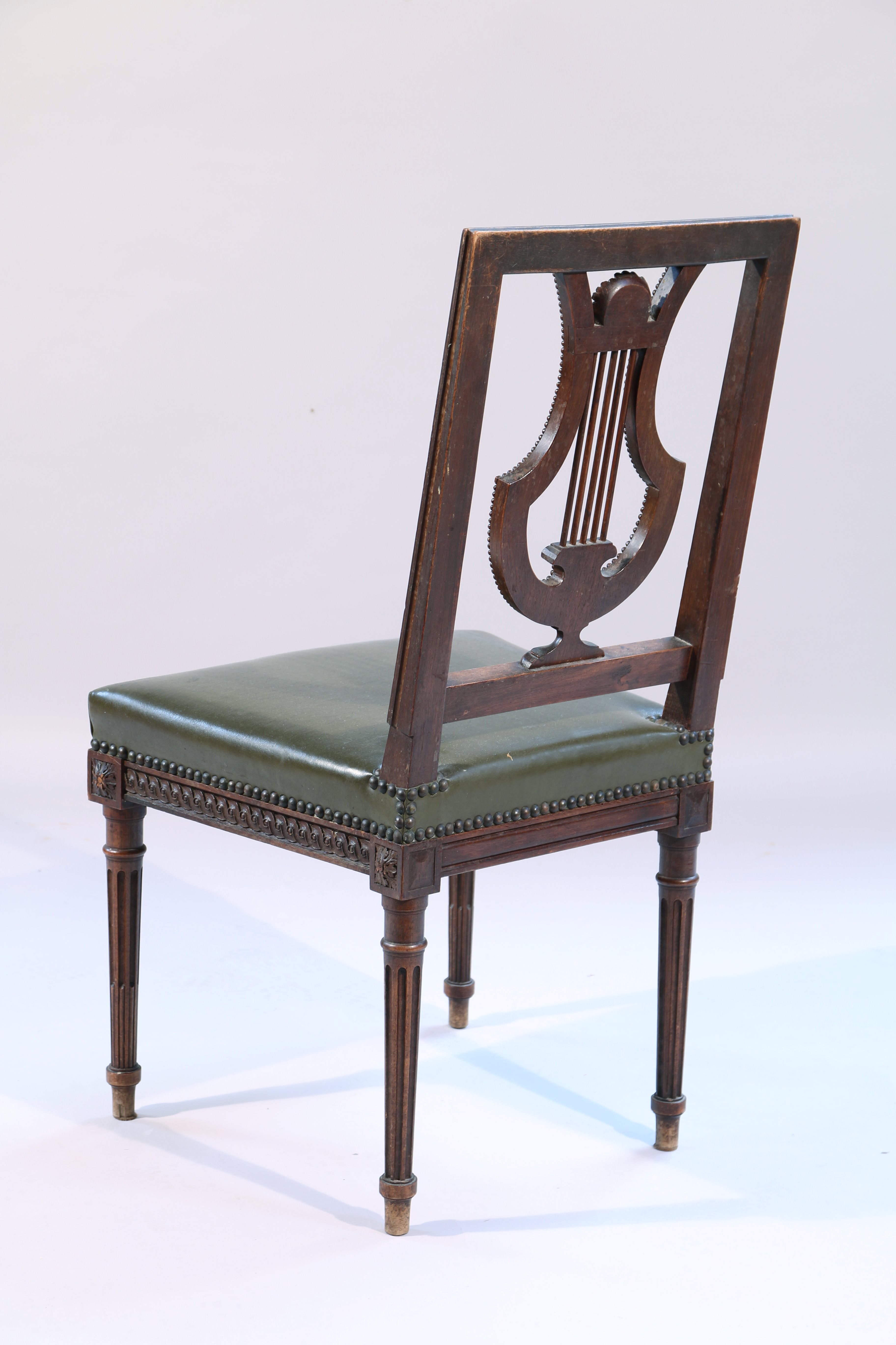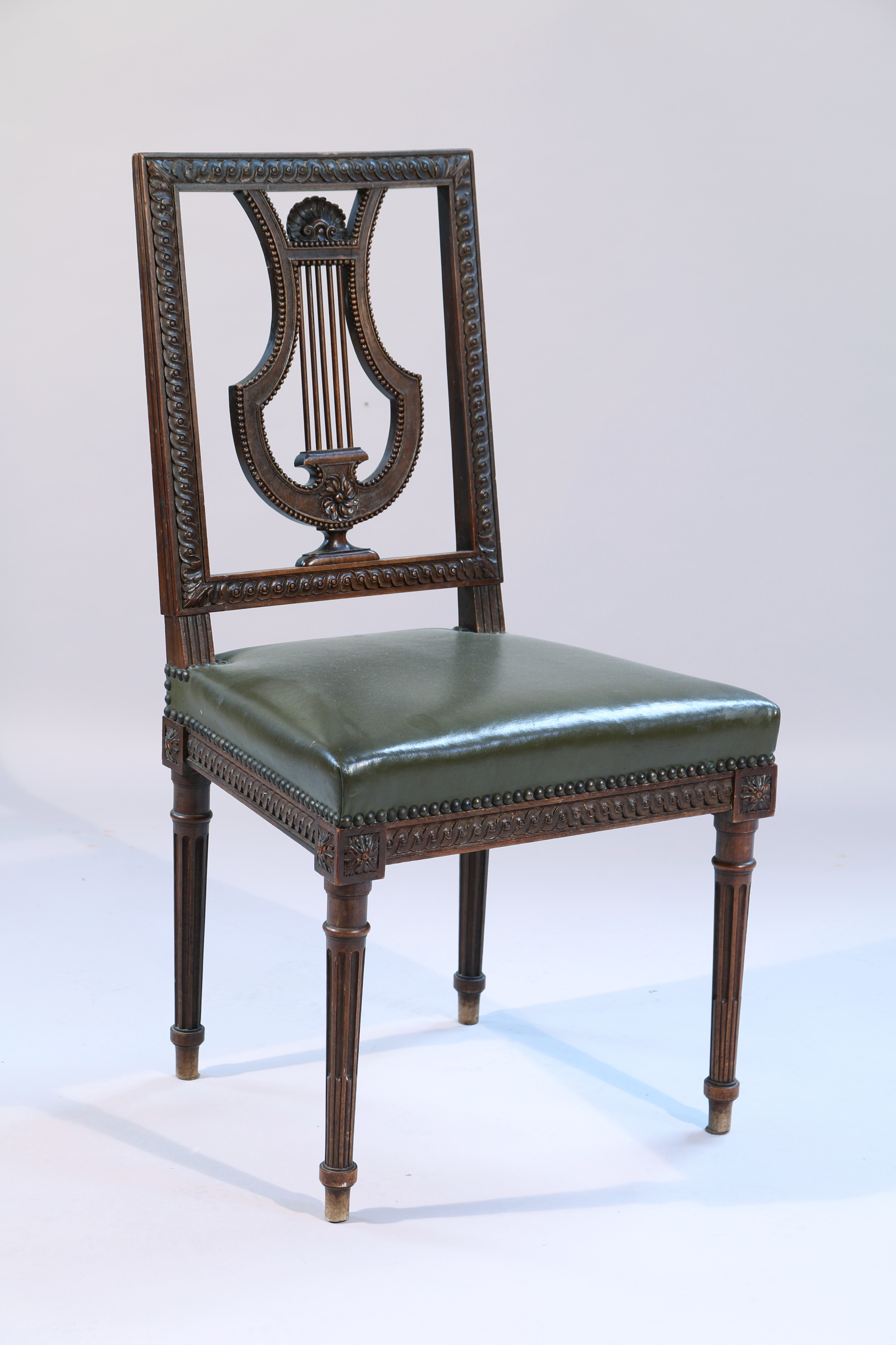 Le dossier ajouré d'une lyre enrichie de rais de perle, fleuron et coquille. Le dossier et la ceinture ornés de frises d'entrelacs. Dés de raccordement à fleurons. Elles reposent sur quatre pieds fuselés, cannelés et rudentés.