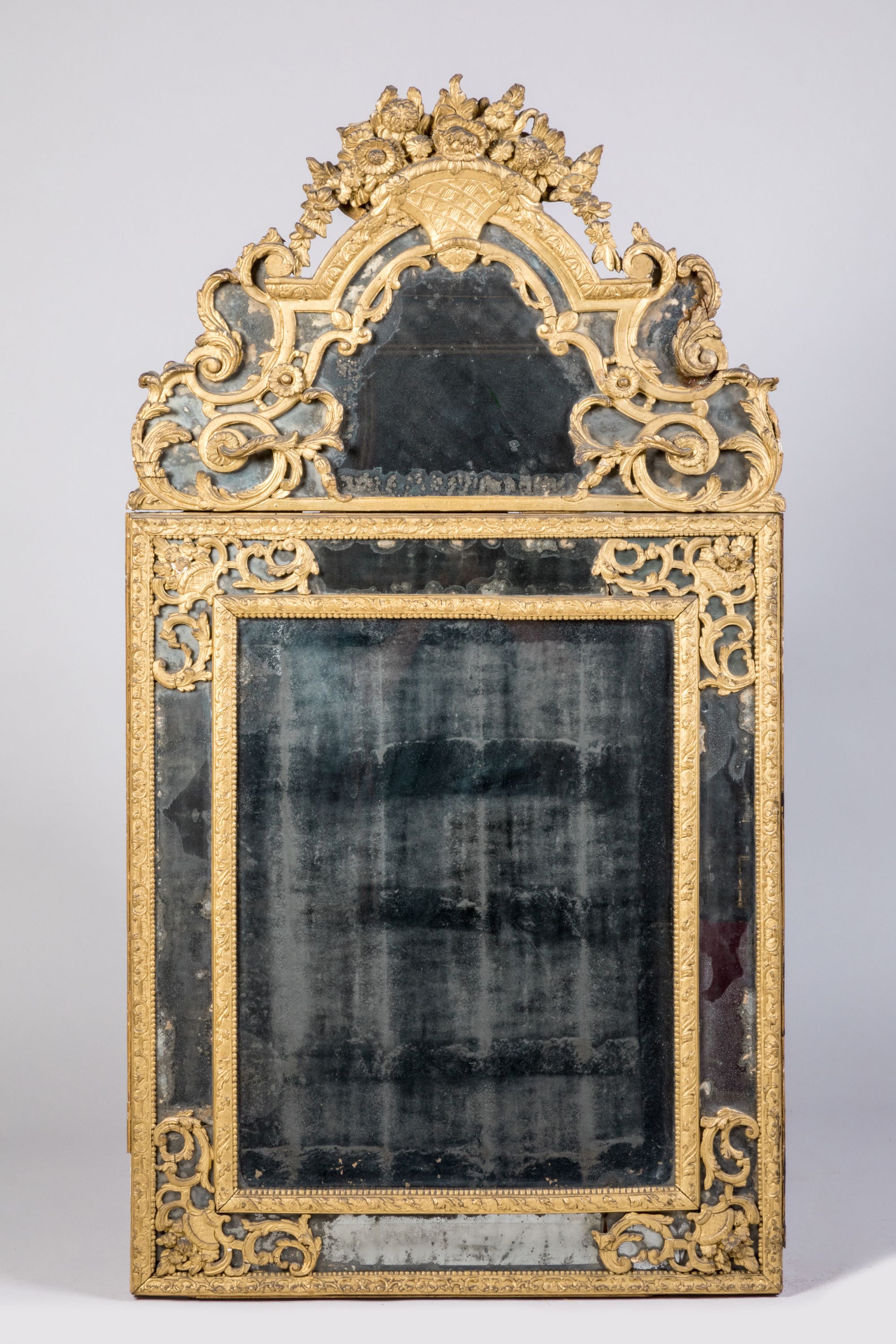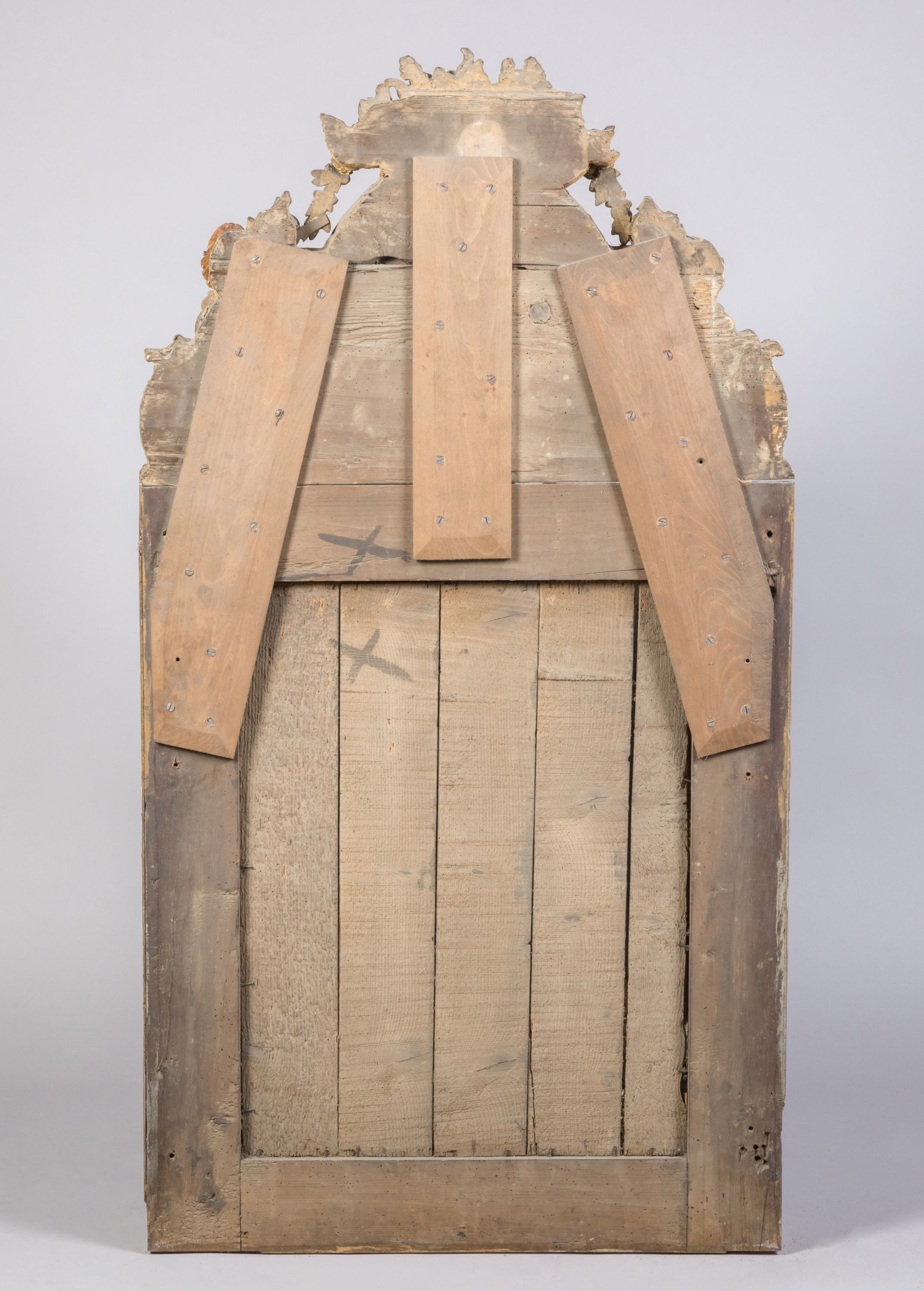 en bois sculpté, stuqué et repeint or. Il reçoit un riche décor de paniers fleuris, enroulement et acanthes.