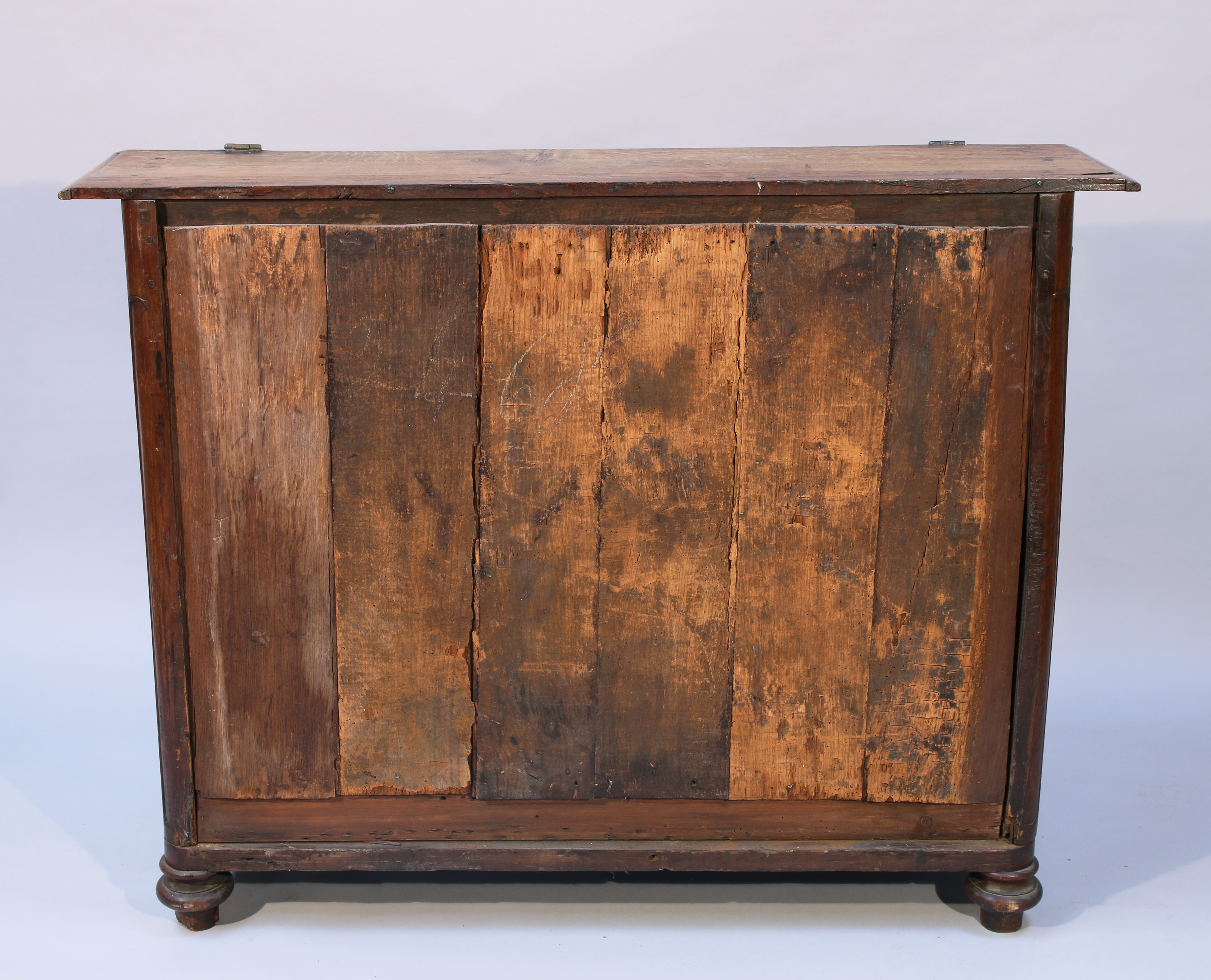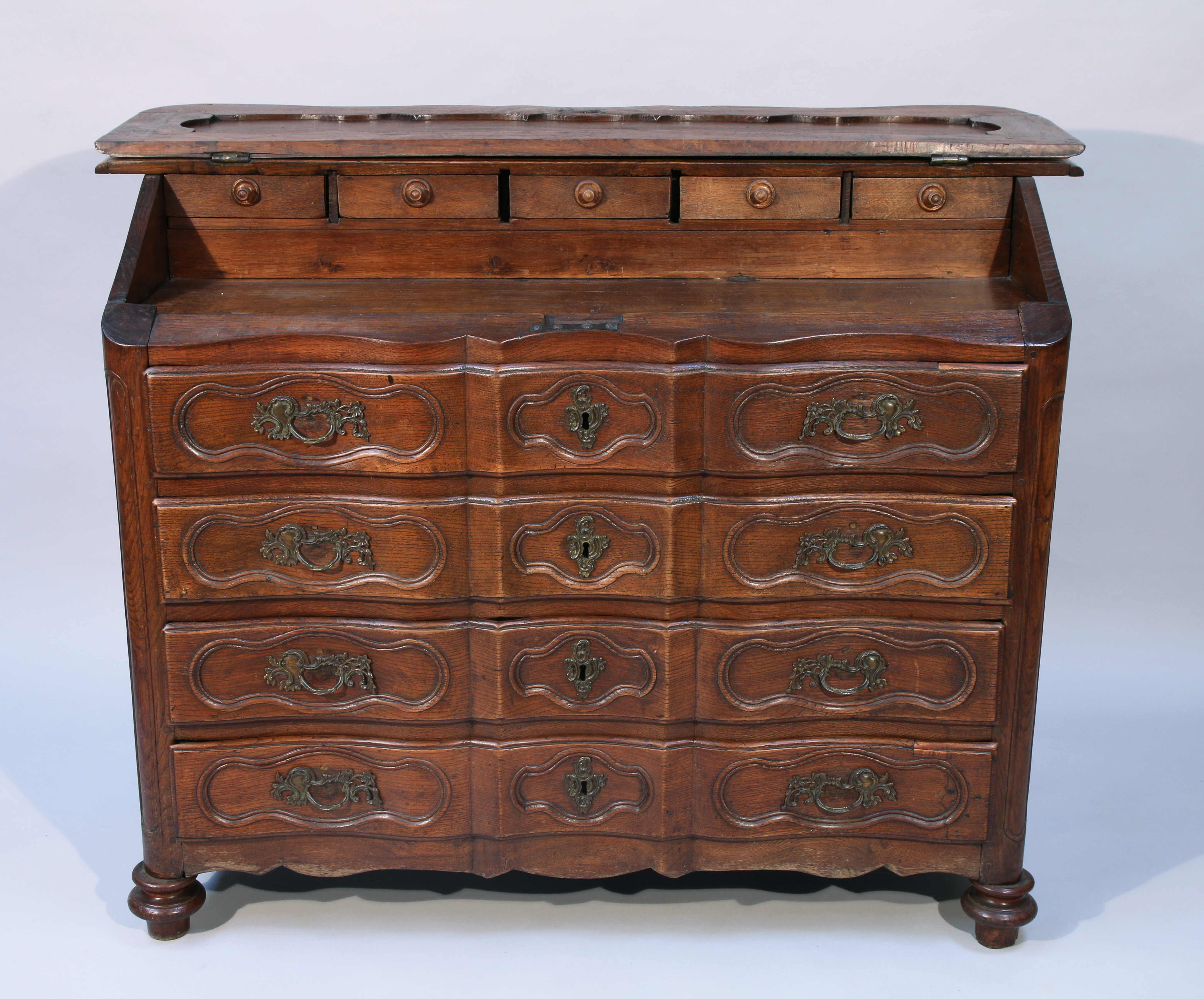 La façade en arbalète ouvrant par quatre tiroirs surmontés d'un abatant brisé au panneau mouluré. Piètement en boule aplatie. Poignées de tirages et entrées de serrures en bronze de style rocaille.