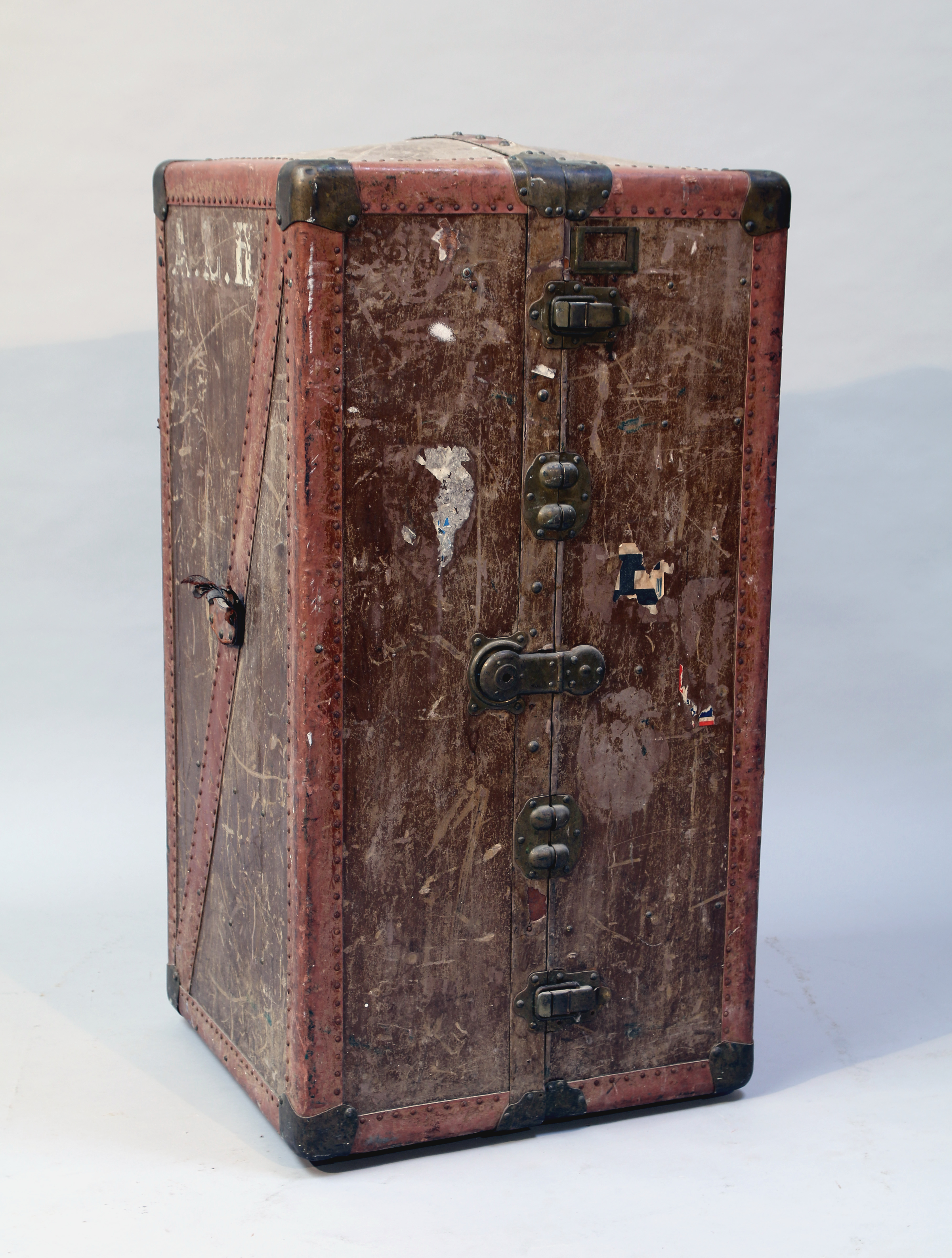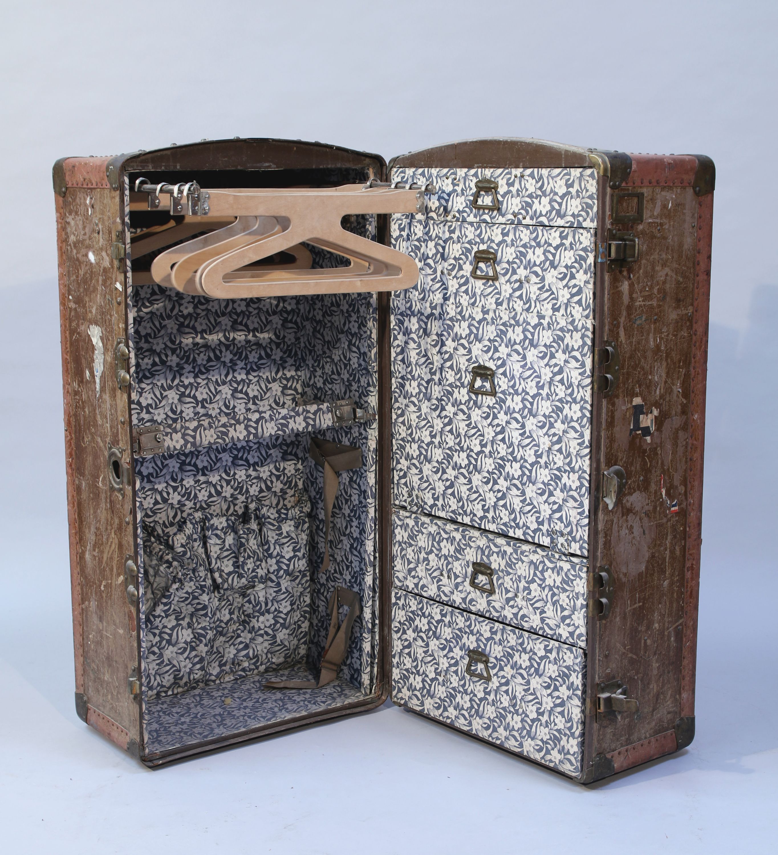 MALLE-CABINE dite "WARDROBE" de voyage transatlantique. Âme en bois gainée de cuir, pentures en fer garnis de clous en laiton bombés. Elle ouvre sur un côté à portants présentant dix cintres garnis de tissu et des rangements à chaussures, et sur l'autre par cinq tiroirs de dimensions différentes dont un tiroir à incliner.