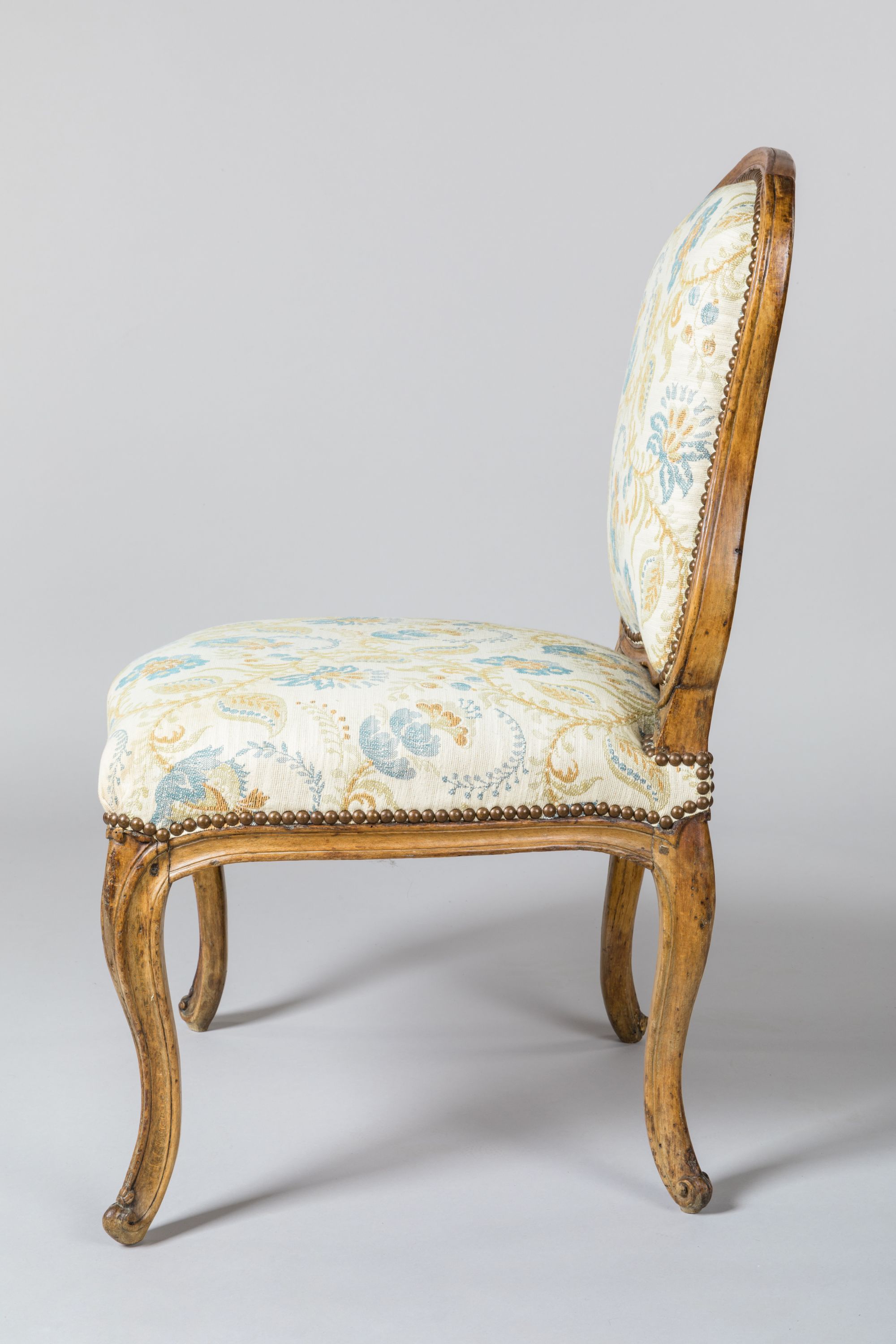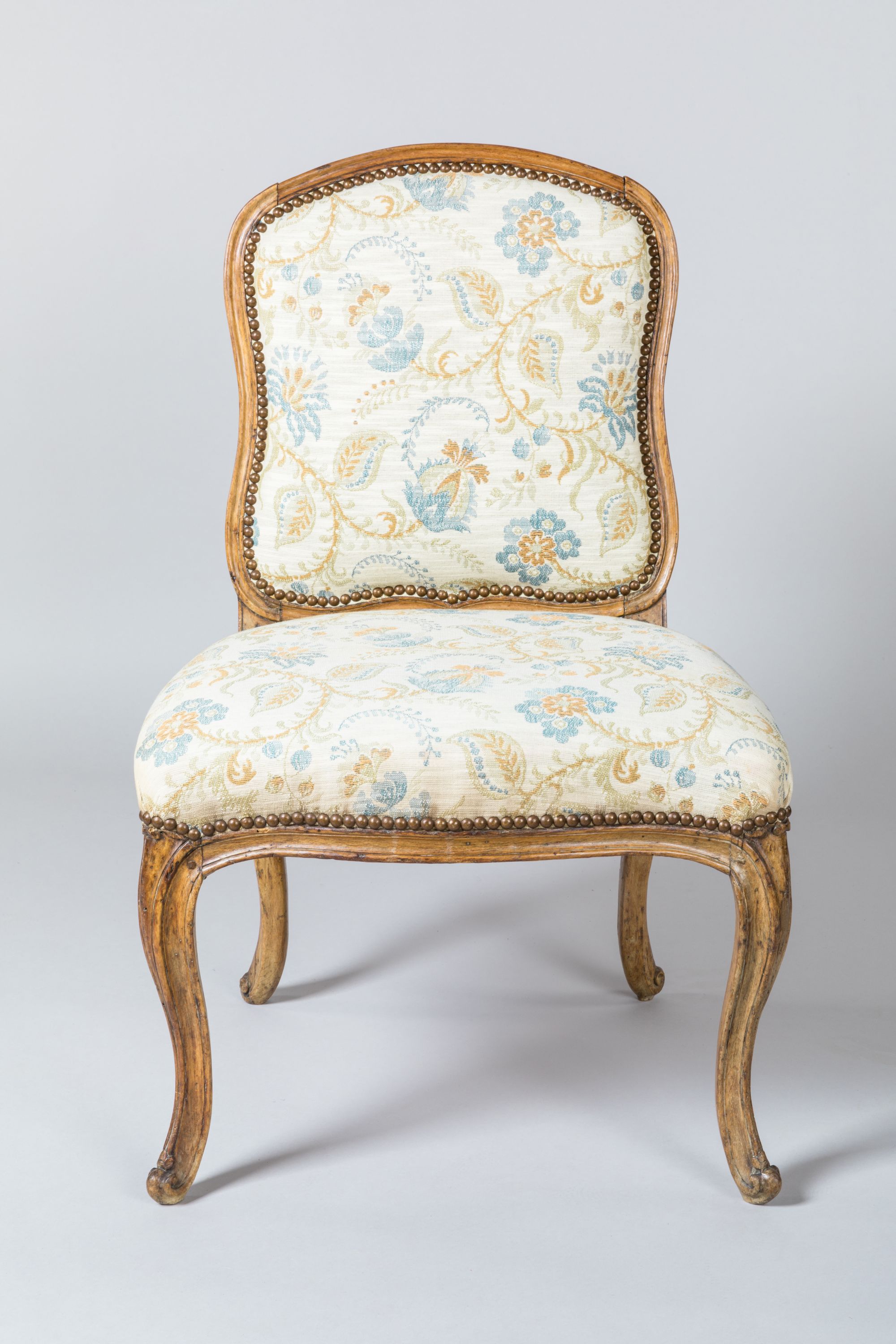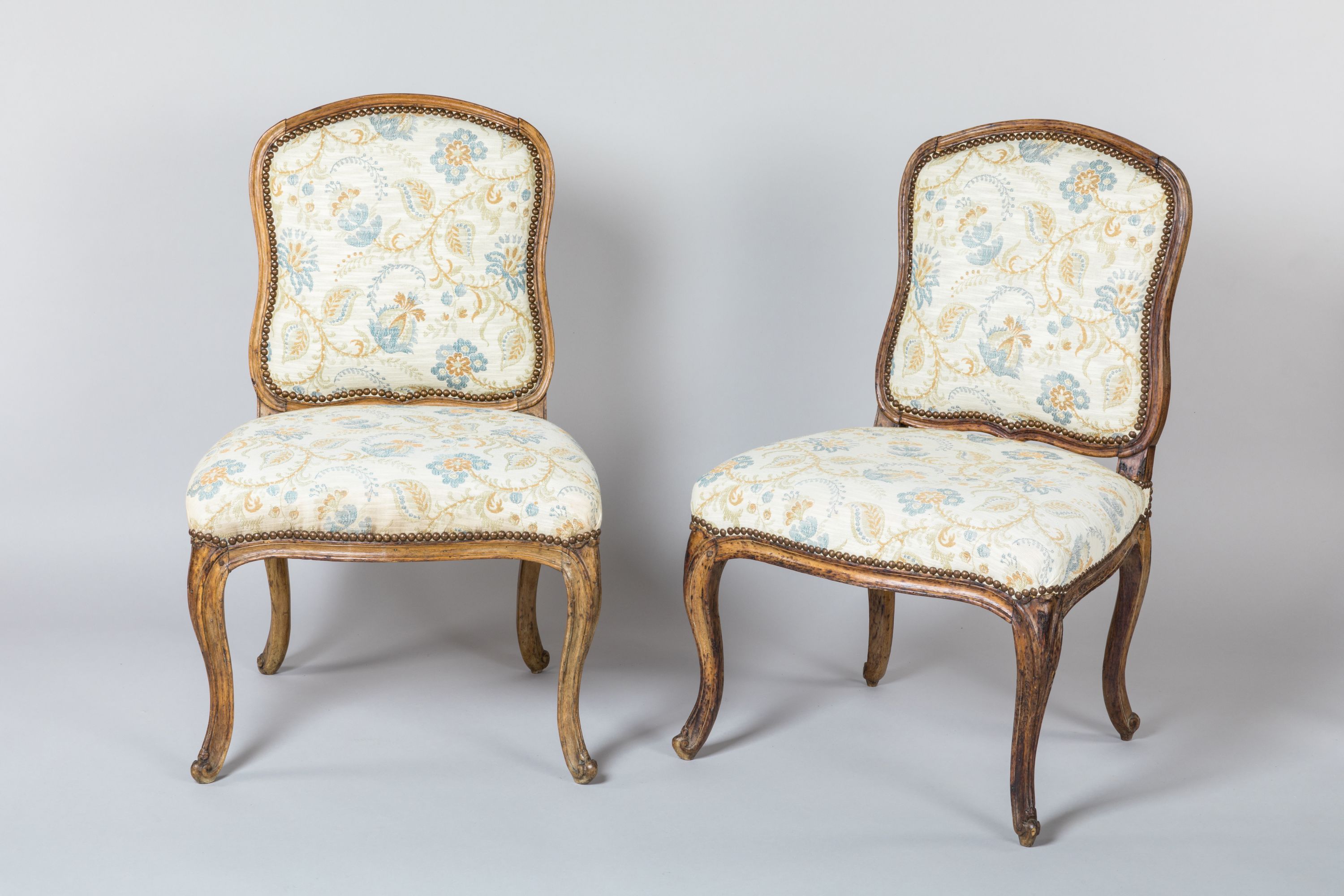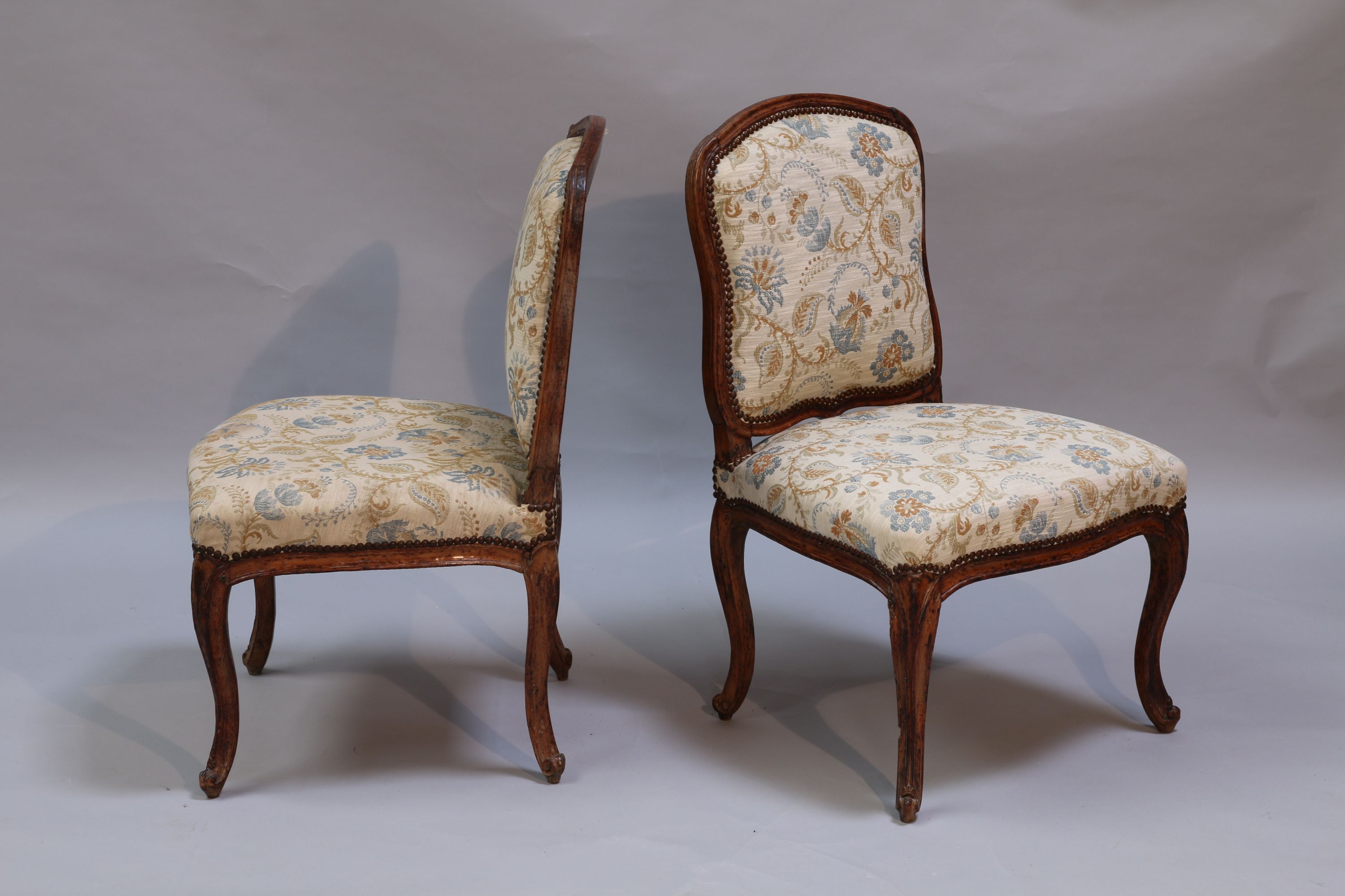 SUITE de QUATRE CHAISES à dossier à la reine, en hêtre mouluré et sculpté. Garniture à motifs de fleurs indiennes. Elles reposent sur quatre pieds cambrés à enroulement.