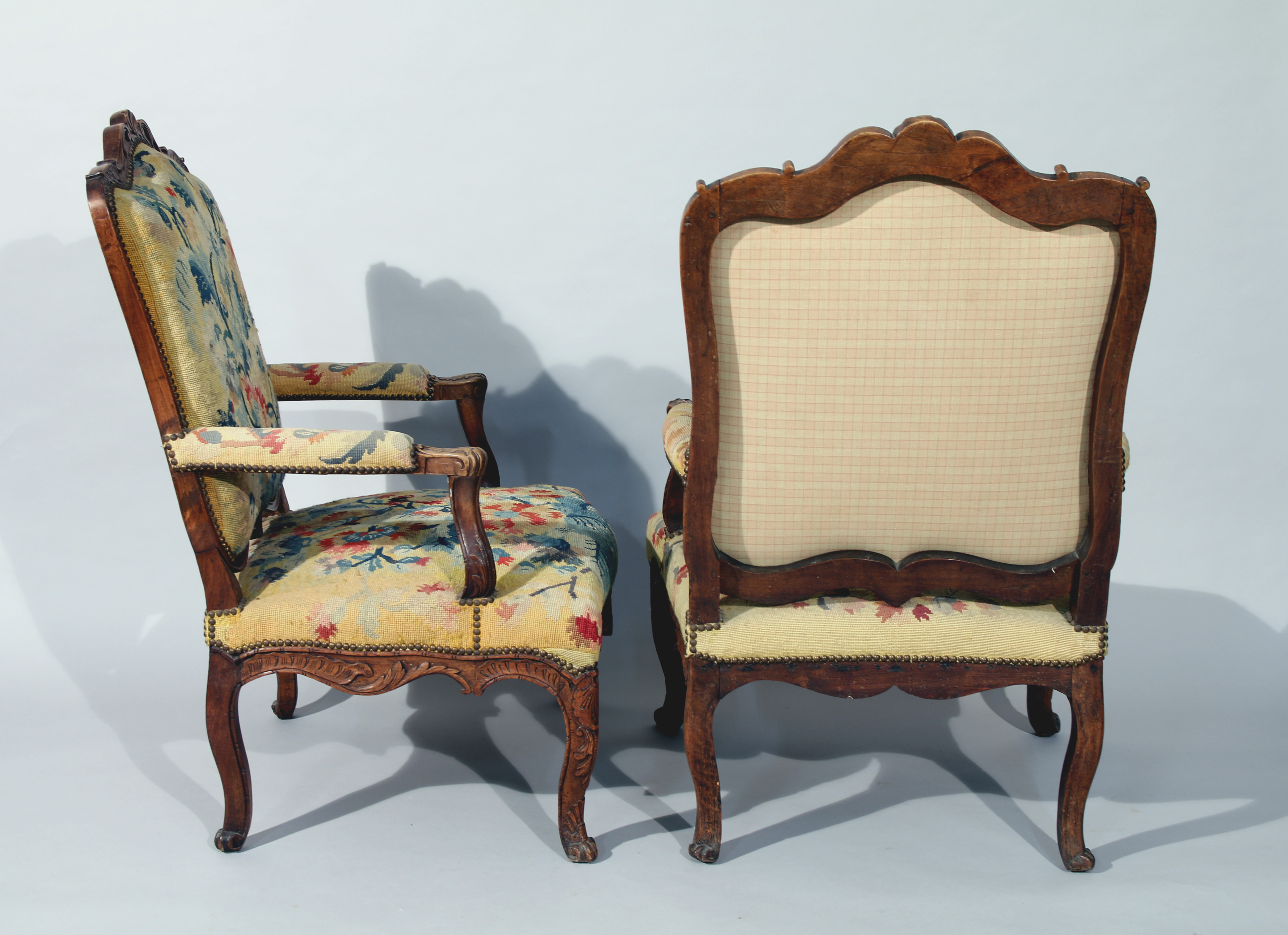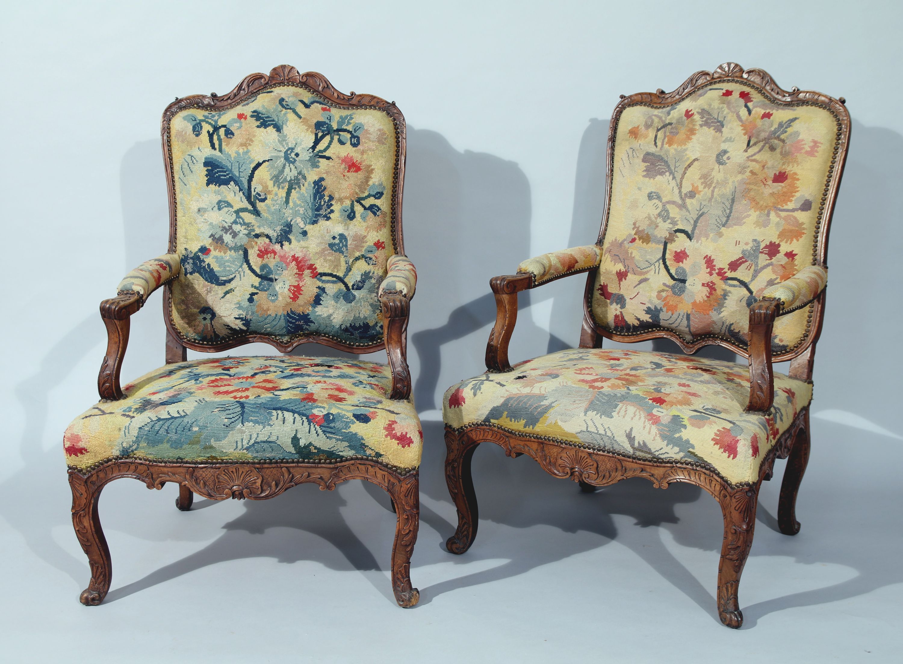 Paire de FAUTEUILS à la REINE en bois naturel mouluré et richement sculpté de coquilles, acanthe et motifs rocaille sur fond de croisillons. Ils reposent sur quatre pieds à enroulements feuillagés.