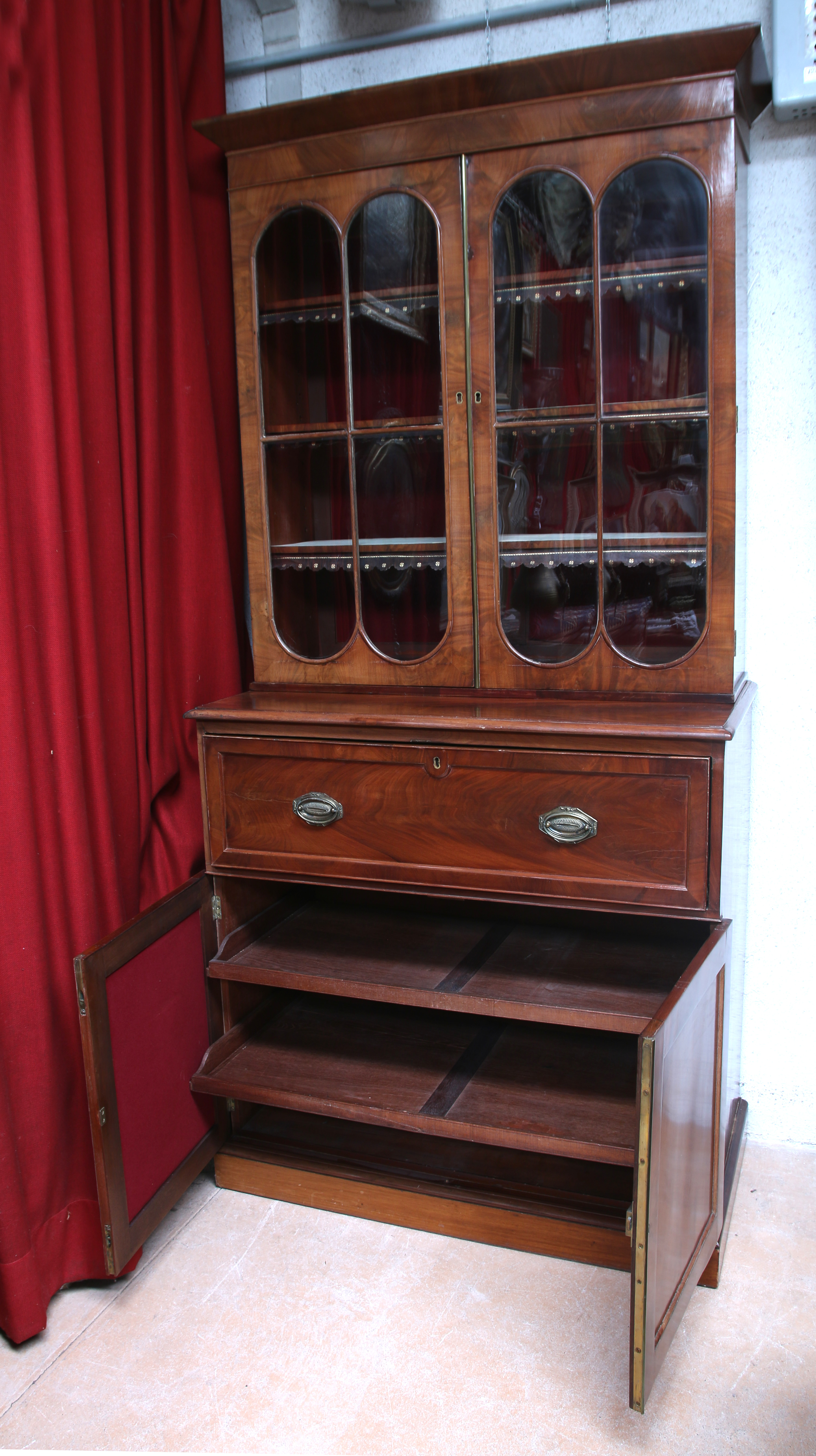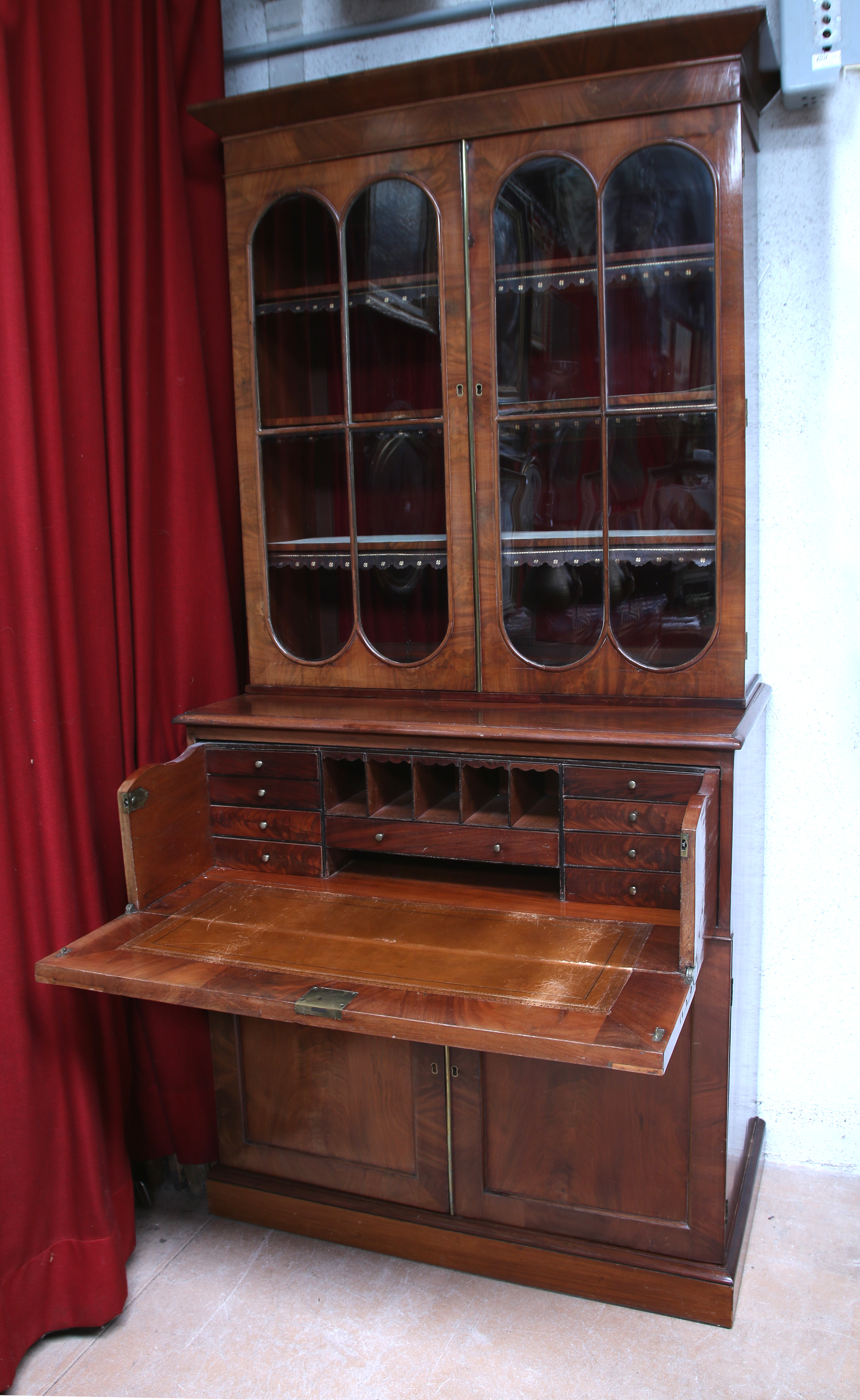à abattant de forme rectangulaire. Il ouvre à deux portes dans le corps supérieur et deux portes dans la partie basse, est muni d'un abattant en ceinture découvrant un pupitre gainé de cuir, un tiroir central et huit tiroirs latéraux. Le corps supérieur présente des vitres en arc bilobé séparées par un croisillon, découvrant trois étagères décorées d'un cuir chantourné de lobes et gaufré à décor de fleurettes. Garnitures et baguettes de fermeture en laiton doré gravé sur les anneaux de tirage "WJ".