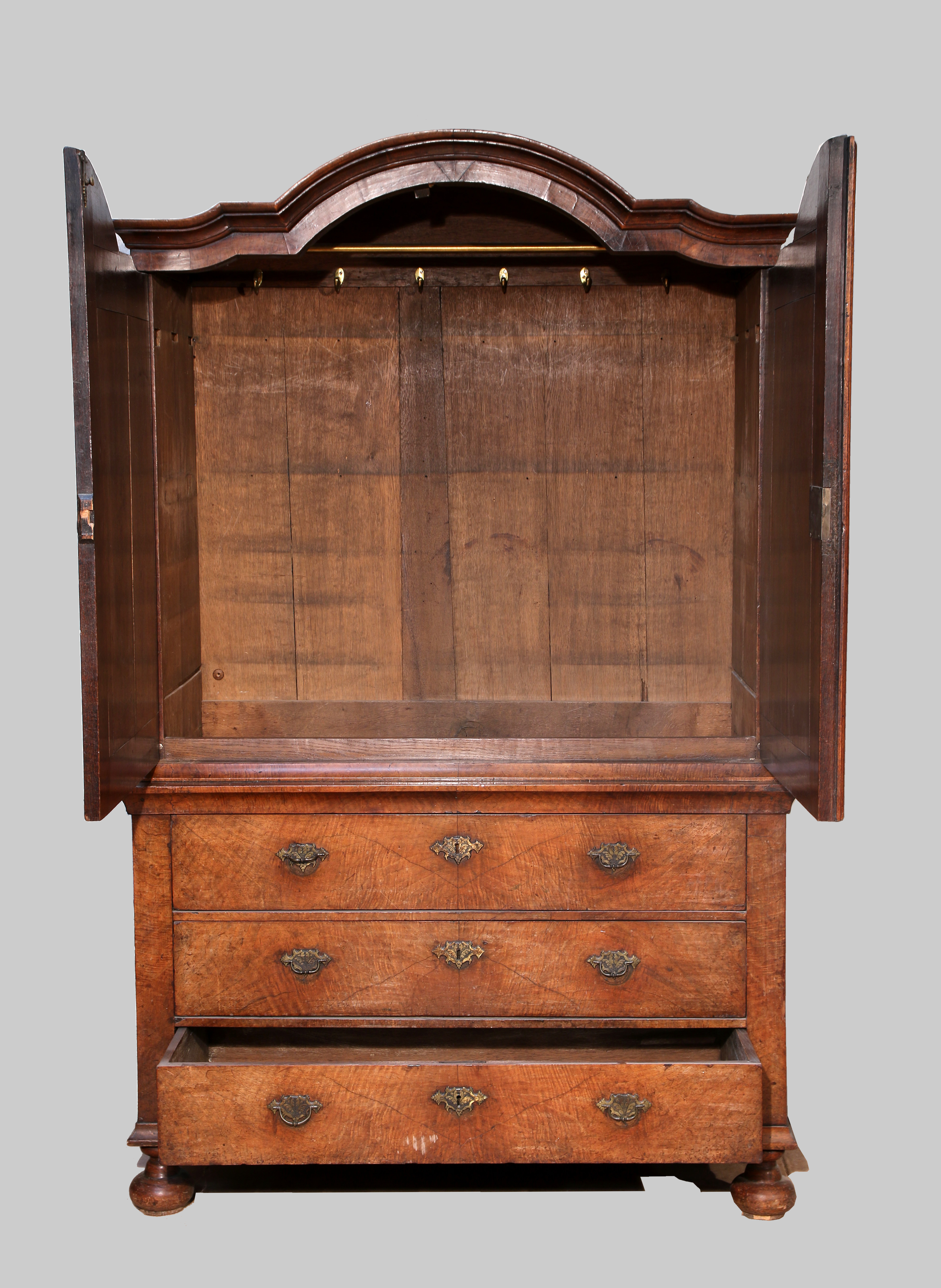 COMMODE EN ARMOIRE transformé en penderie à chapeau de gendarme en placage de noyer flammé et ronce de noyer. La partie haute ouvre à deux vantaux et la partie basse à un tiroir, les deux premiers étant simulés. Mains tombantes et entrées de serrure en laiton découpé et ciselé rapportées. Piètement en boule aplatie quadripode.