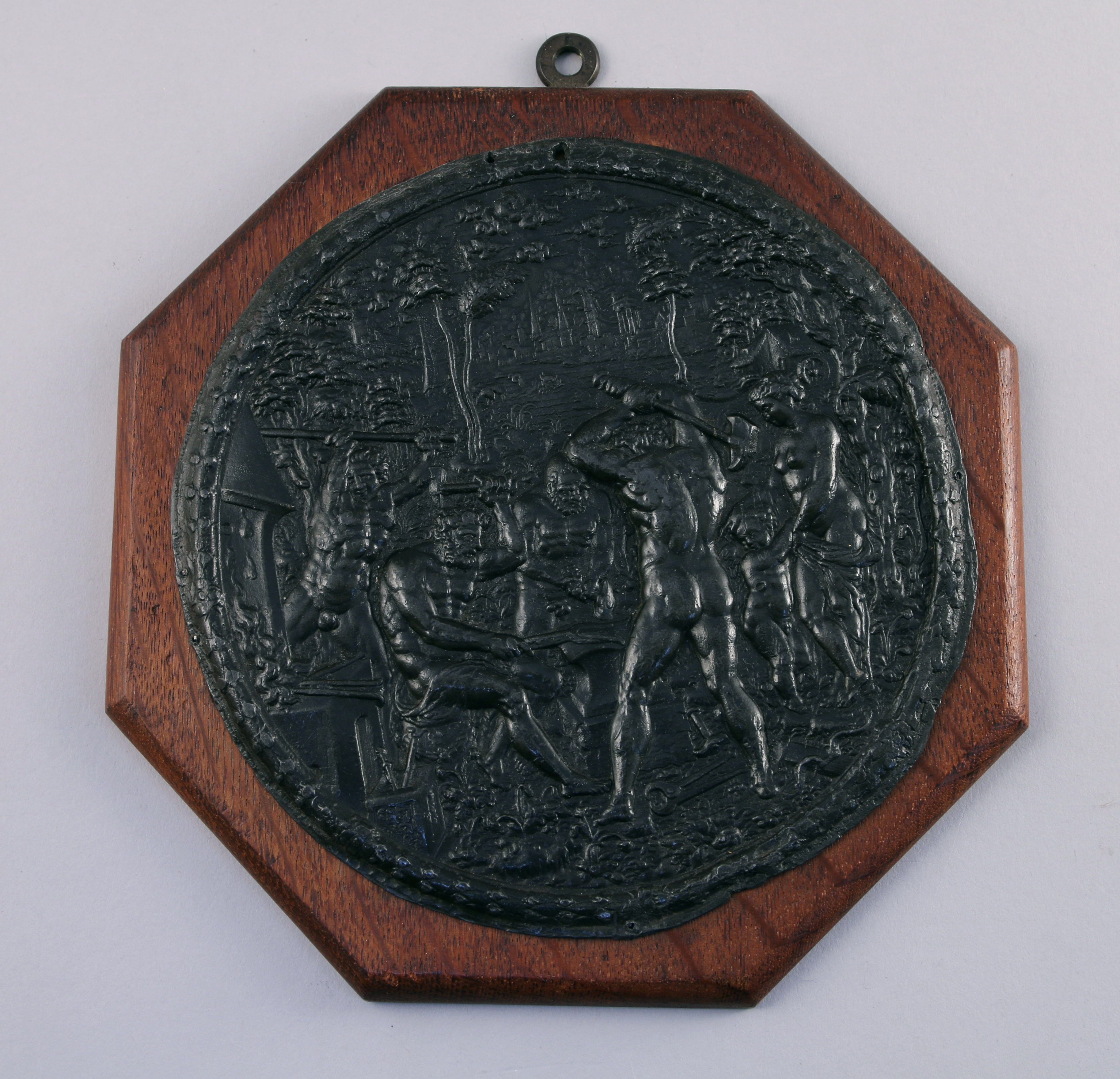 - d'après l'école du XVIe. Le Passage de la Mer Rouge. Plomb anciennement doré. Diam. 15,5 cm. Composition proche de l'oeuvre de Cosimo Rosselli "Passage de la Mer Rouge".