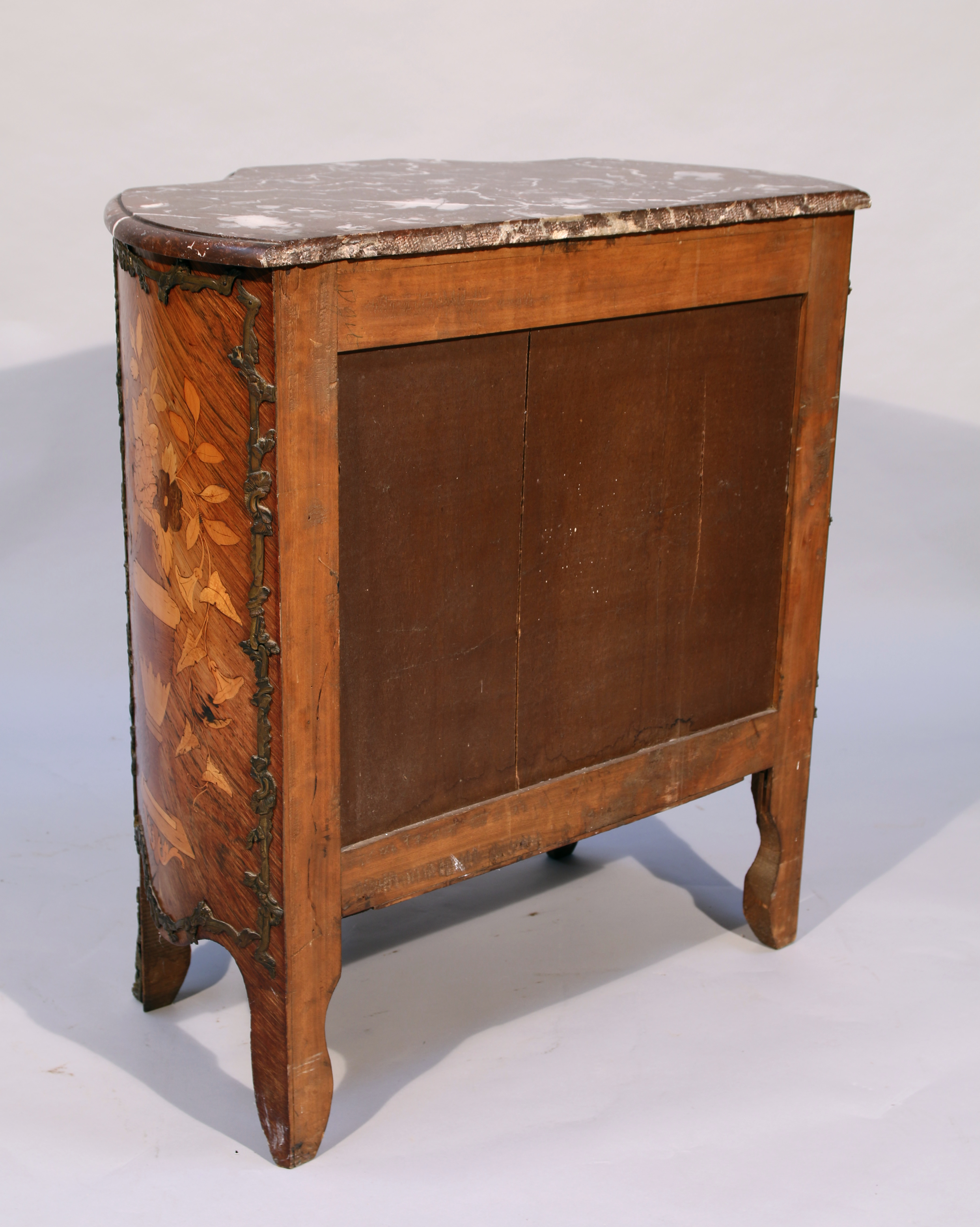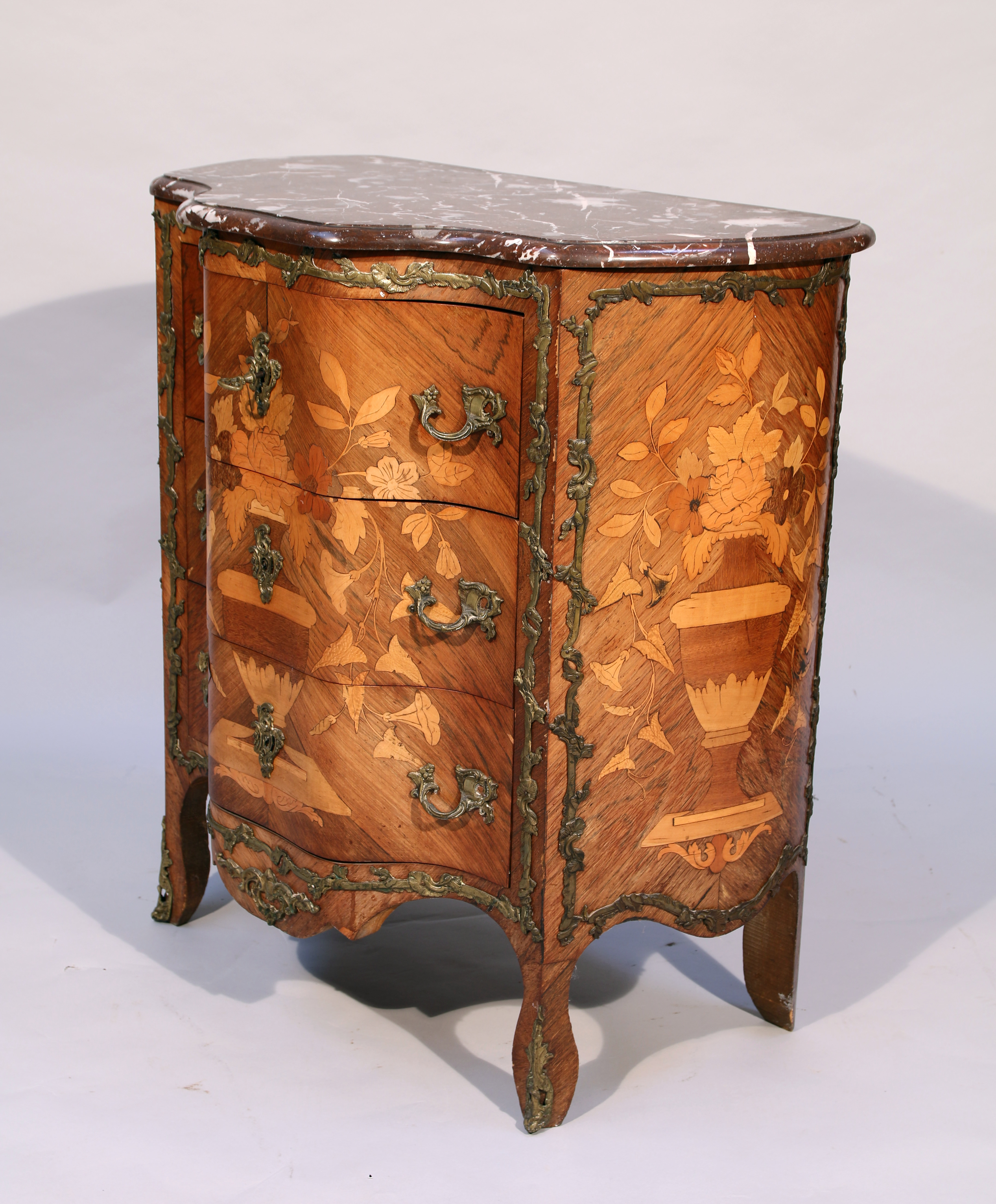 de forme mouvementée ouvrant en façade par trois tiroirs. Elle reçoit un riche décor marqueté de vases fleuris en façade et sur les côtés. Garniture de bronzes ciselés tels que entrées de serrure, poignées de tirage, frises feuillagées, sabots et tablier. Traverse basse chantournée à cul-de-lampe. Piètement quadripode. Dessus de marbre griotte rouge de Belgique.