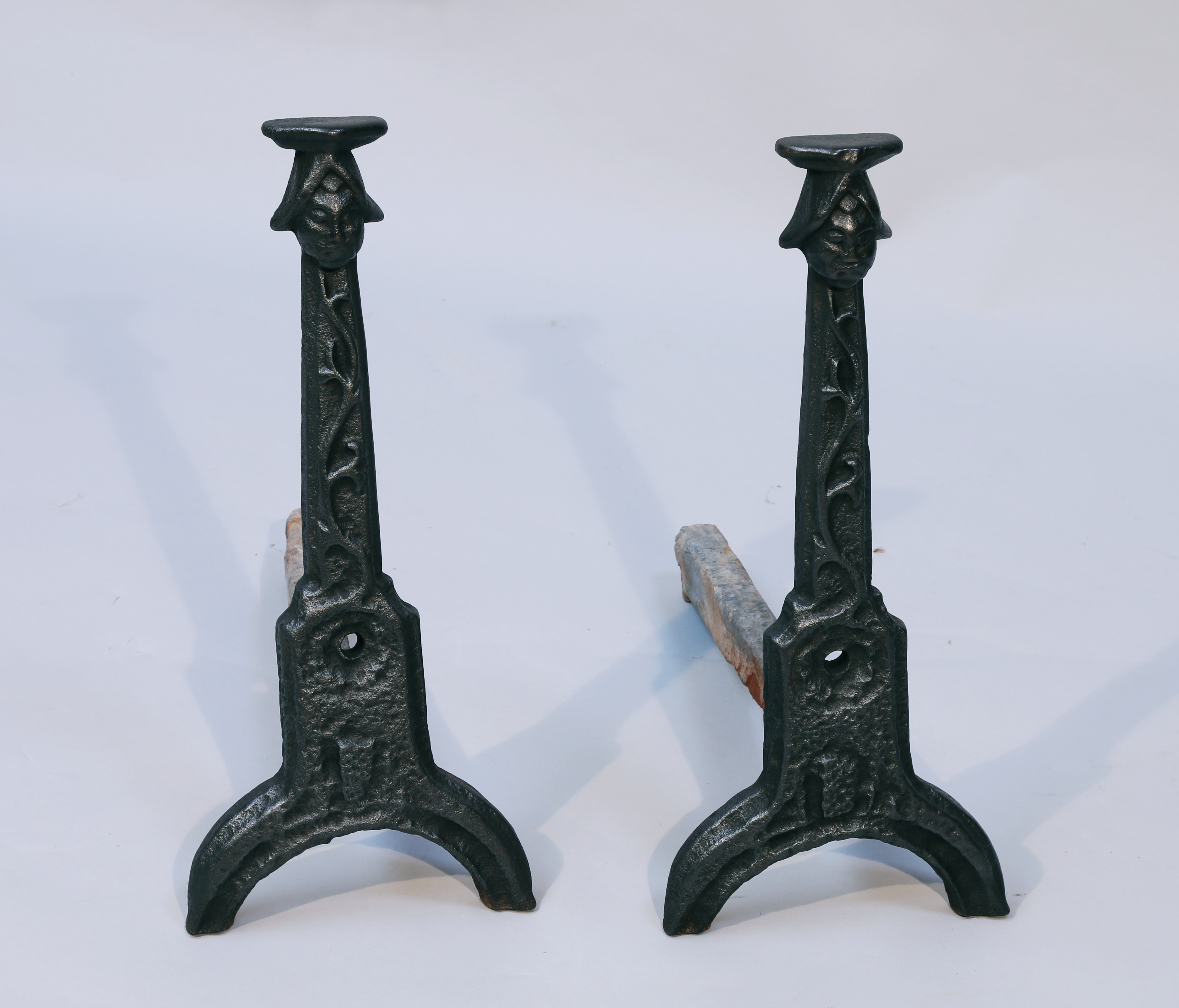 en fonte de fer, couronnés de têtes stylisées, coiffées d'un chapeau. Le fût est orné d'un rinceau de lierre grimpant. La base est percée d'un trou cerclé de rayons.