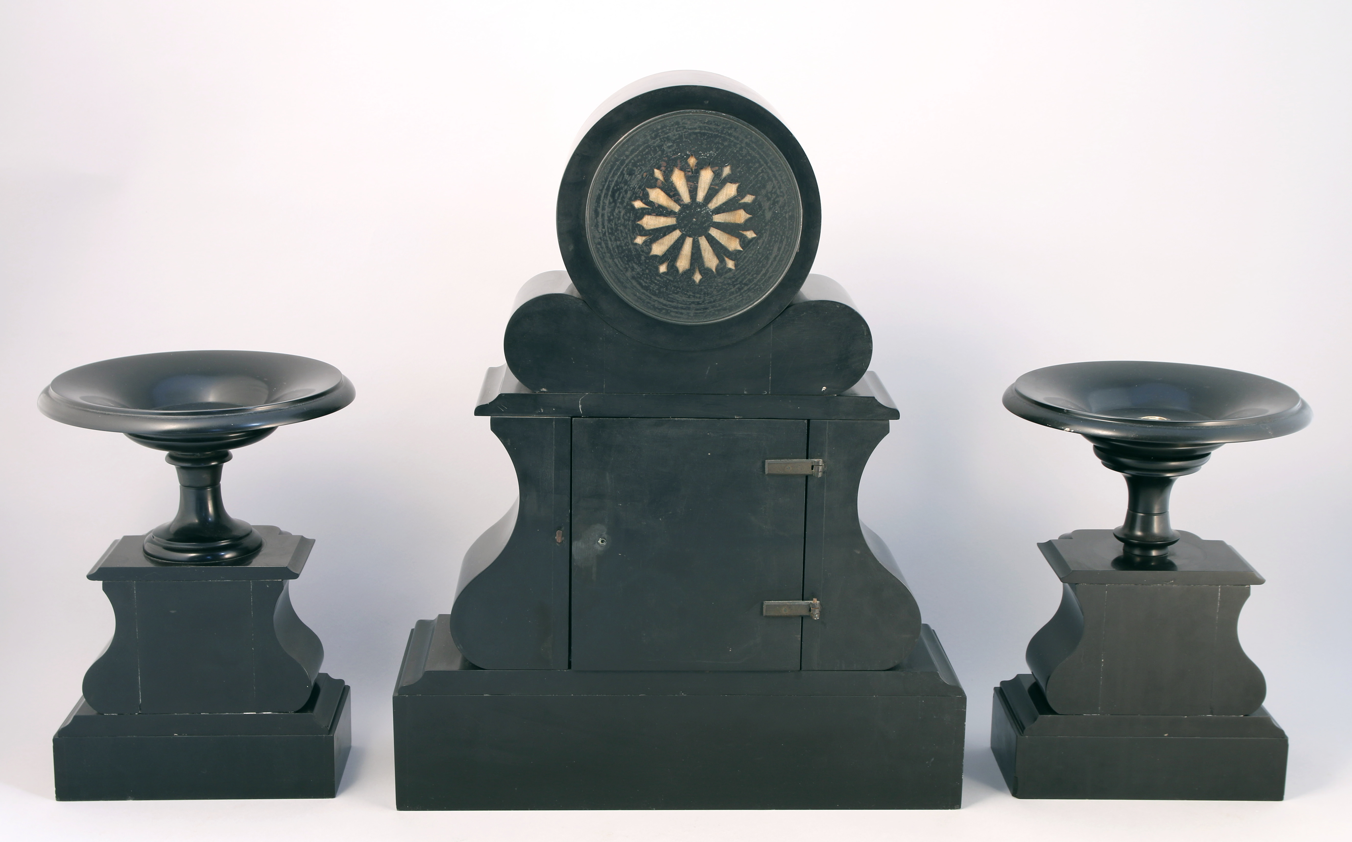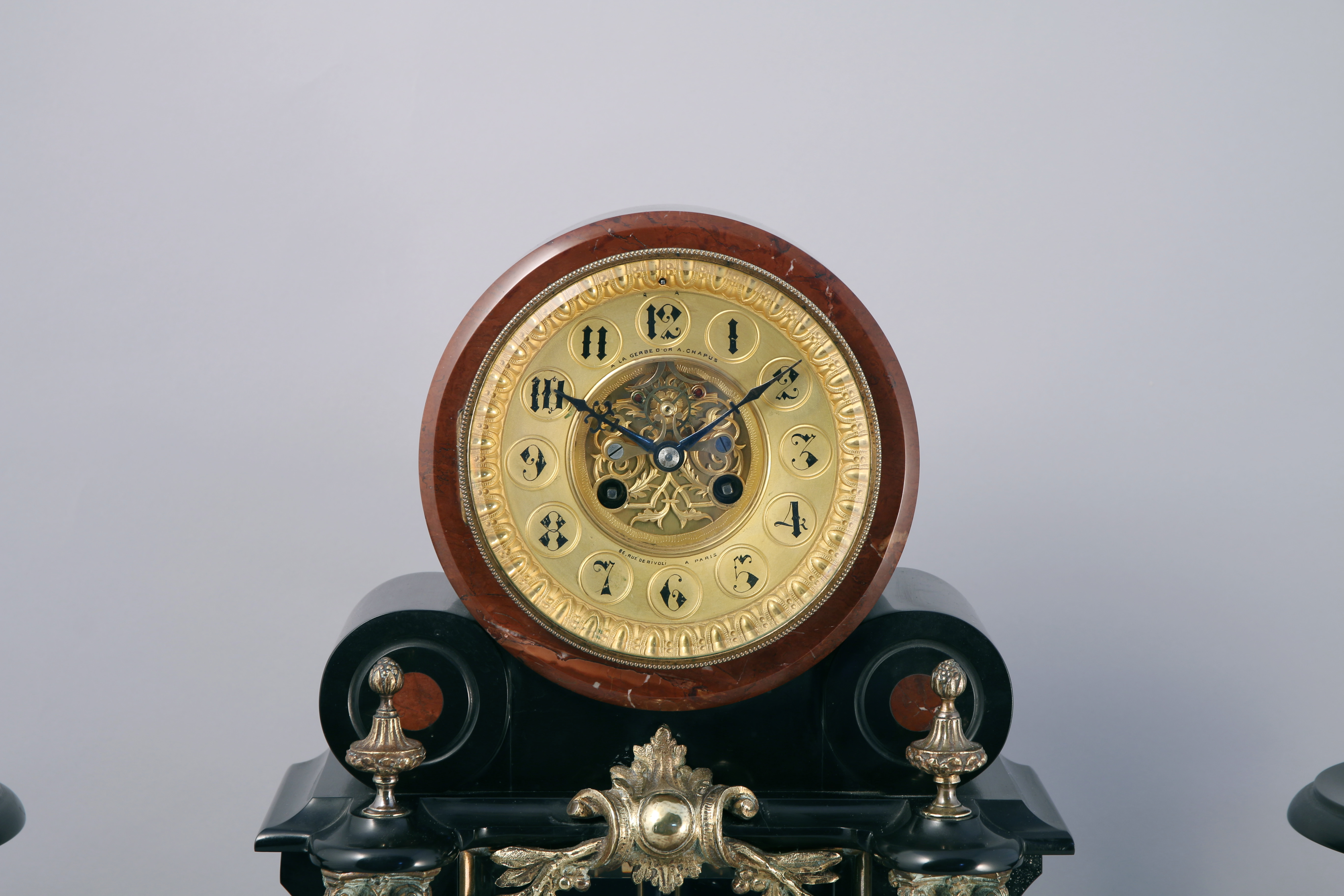 GARNITURE de CHEMINÉE en marbre noir incrusté de marbre rouge et bronzes ciselés et dorés.