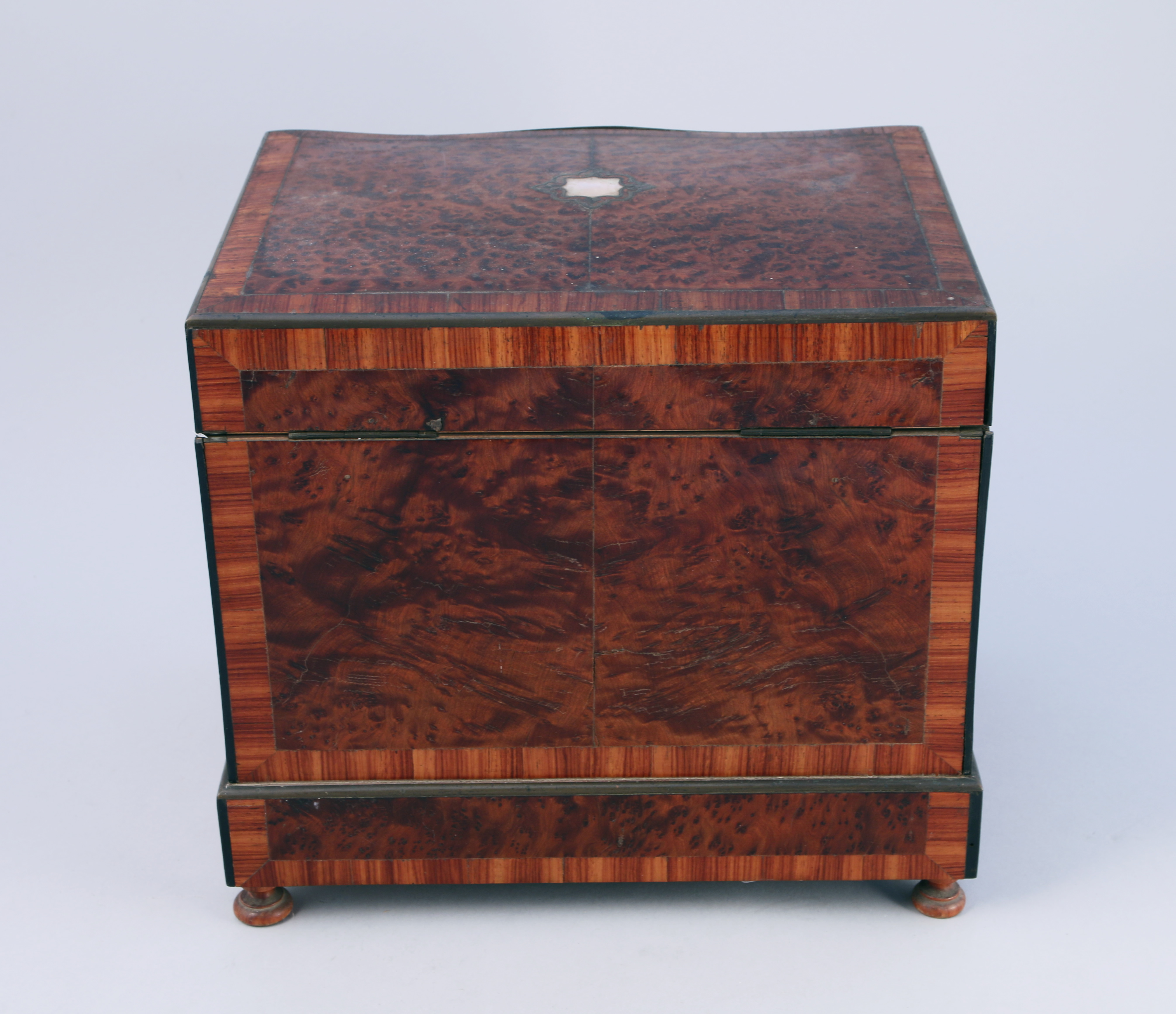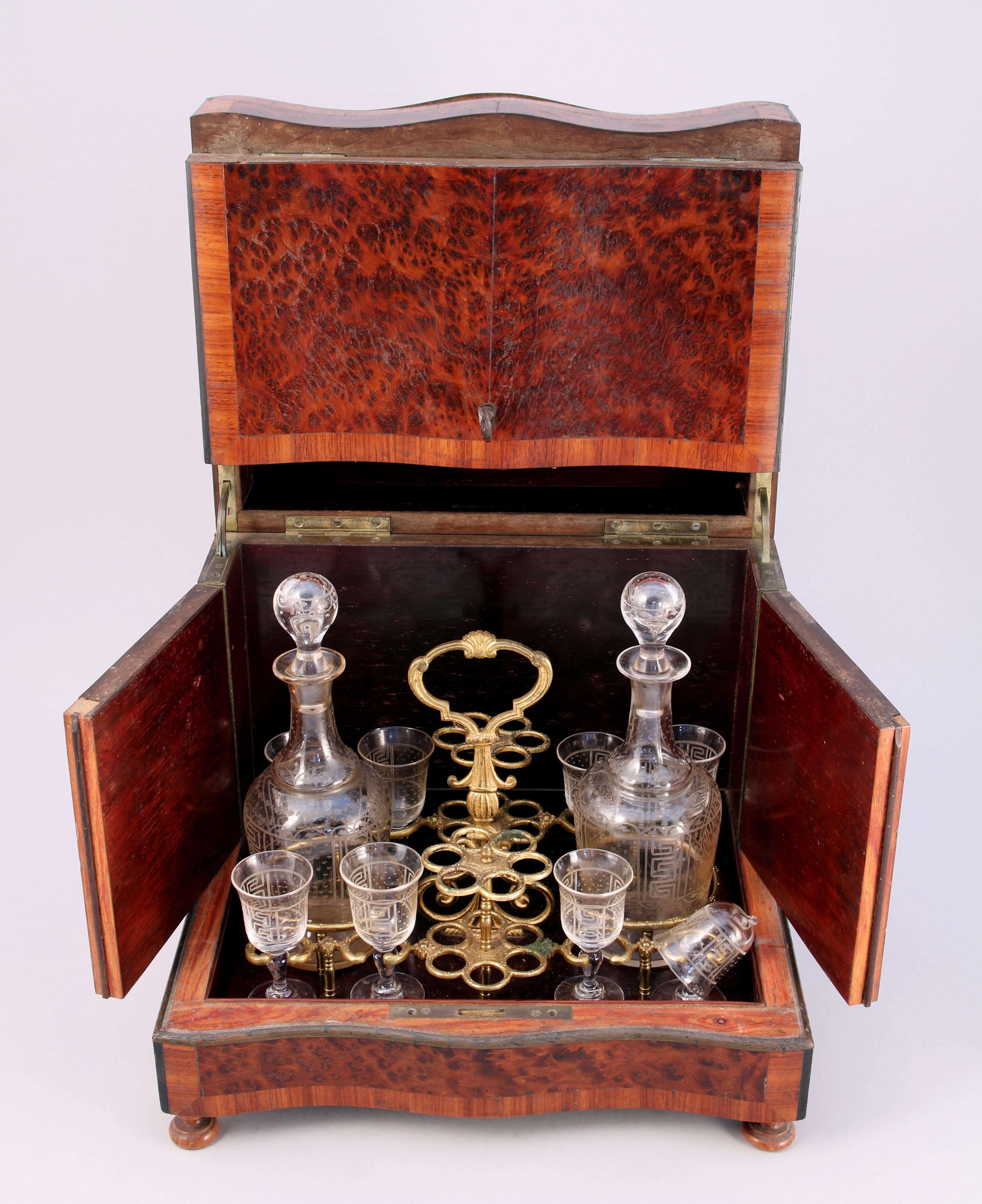 en placage de loupe de thuya, marqueterie de filets et incrustation de nacre, reposant sur quatre pieds. L'intérieur accueille un plateau amovible contenant deux carafons et huit verres à liqueurs en cristal gravé à motifs de méandres et de points.