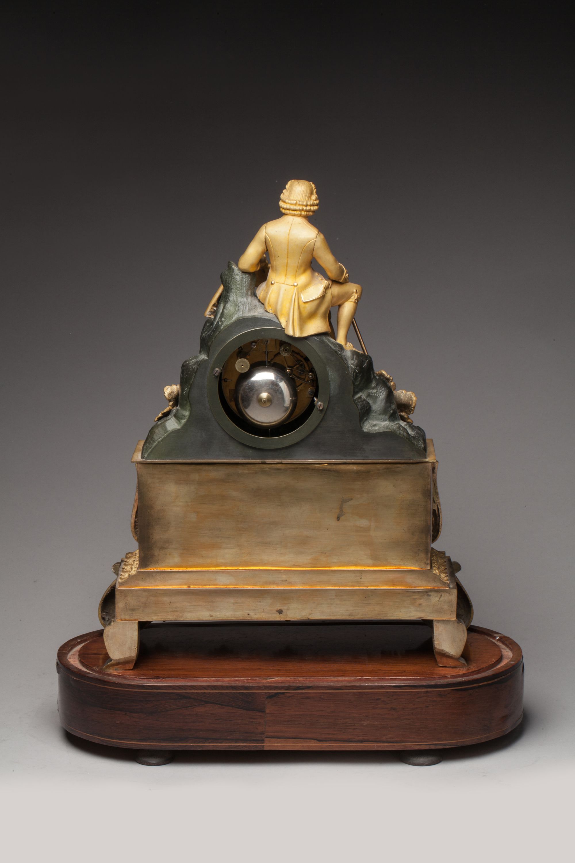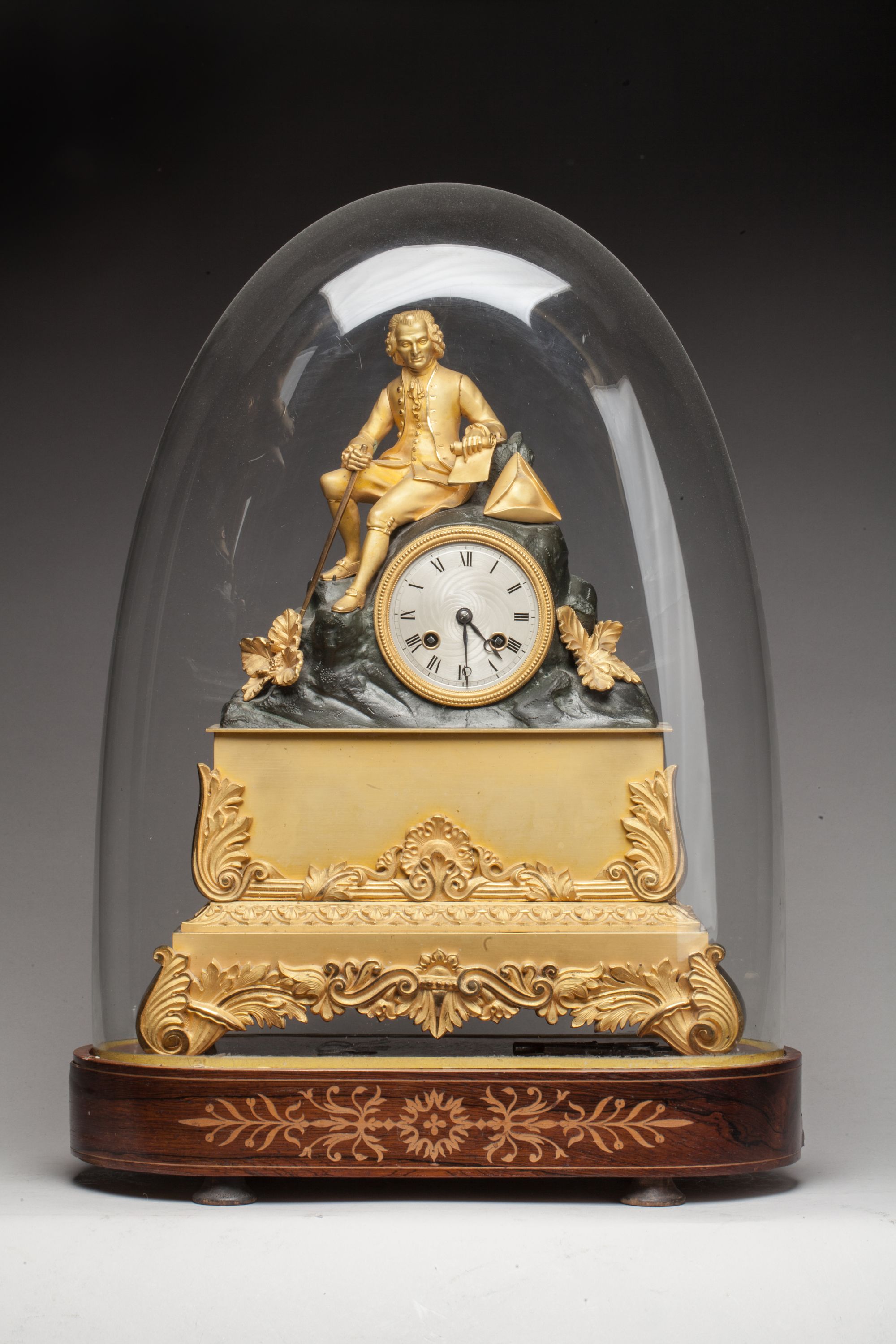 dite borne, en régule doré et patiné et en laiton figurant Jean-Jacques Rousseau assis, bâton de marche et rouleau manuscrit à la main, son chapeau tricorne posé sur les rochers. Le cadran métallique ondoyé est marqué des heures en chiffres romains et gradué pour les minutes. Elle repose sur un socle de forme rectangulaire à motifs d'acanthes sur une base à doucine ceinte d'une frise de lotus reposant sur quatre pieds à acanthe et frises feuillagées. Mouvement avec suspension à fil.