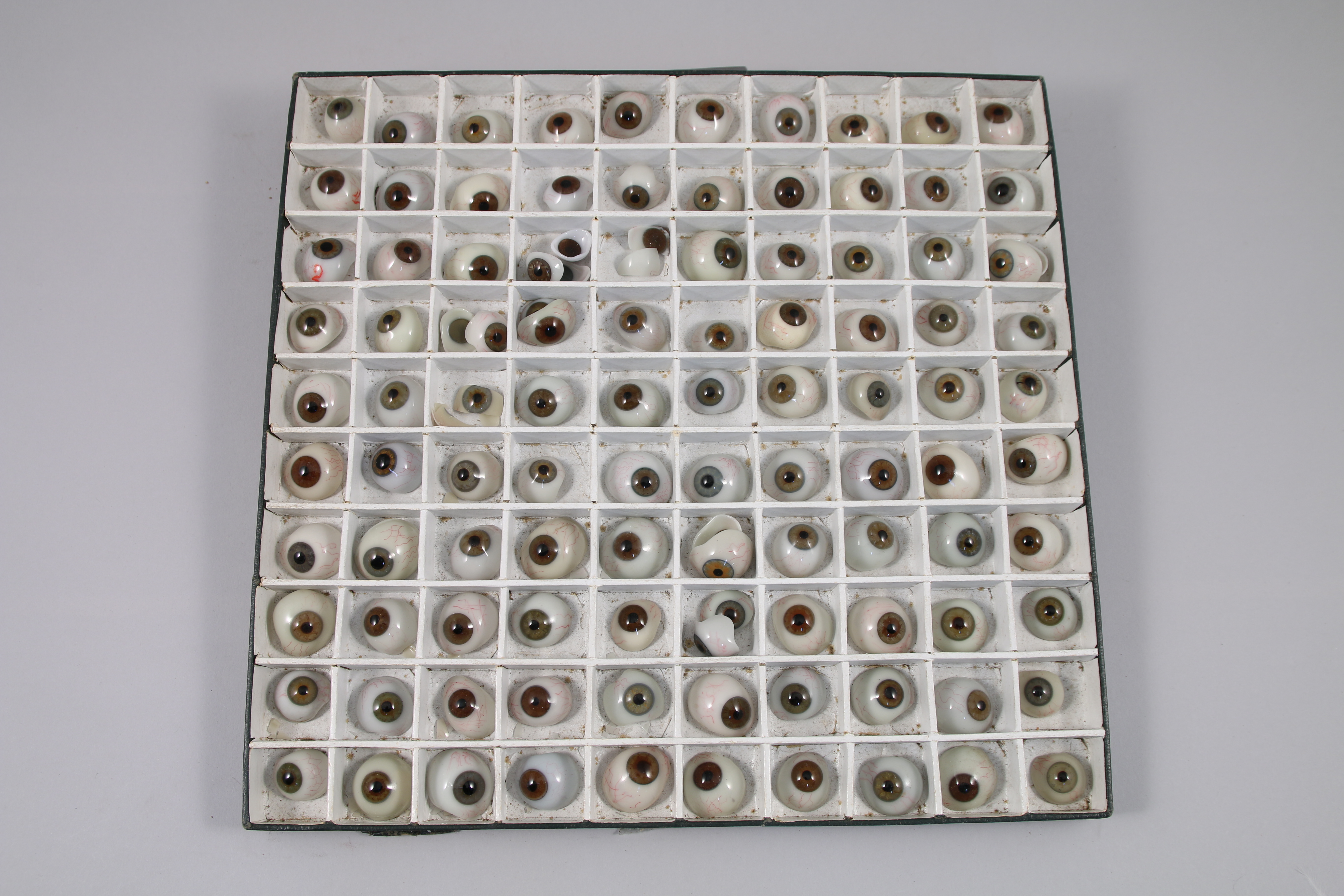 Environ une centaine de GLOBES OCULAIRES, simple ou double coque, dans un ou plusieurs coffrets gainés de chagrin. Les globes en verre teinté de différentes tailles, nuances de couleurs aux petits vaisseaux sanguins peints sur la conjonctive reproduisent l'iris grâce à des pigments de toutes teintes. Les formes des prothèses en demi-coquille sont irrégulières. Les tailles et couleurs diverses ont vocation à s'adapter aux patients ayant subi une énucléation.