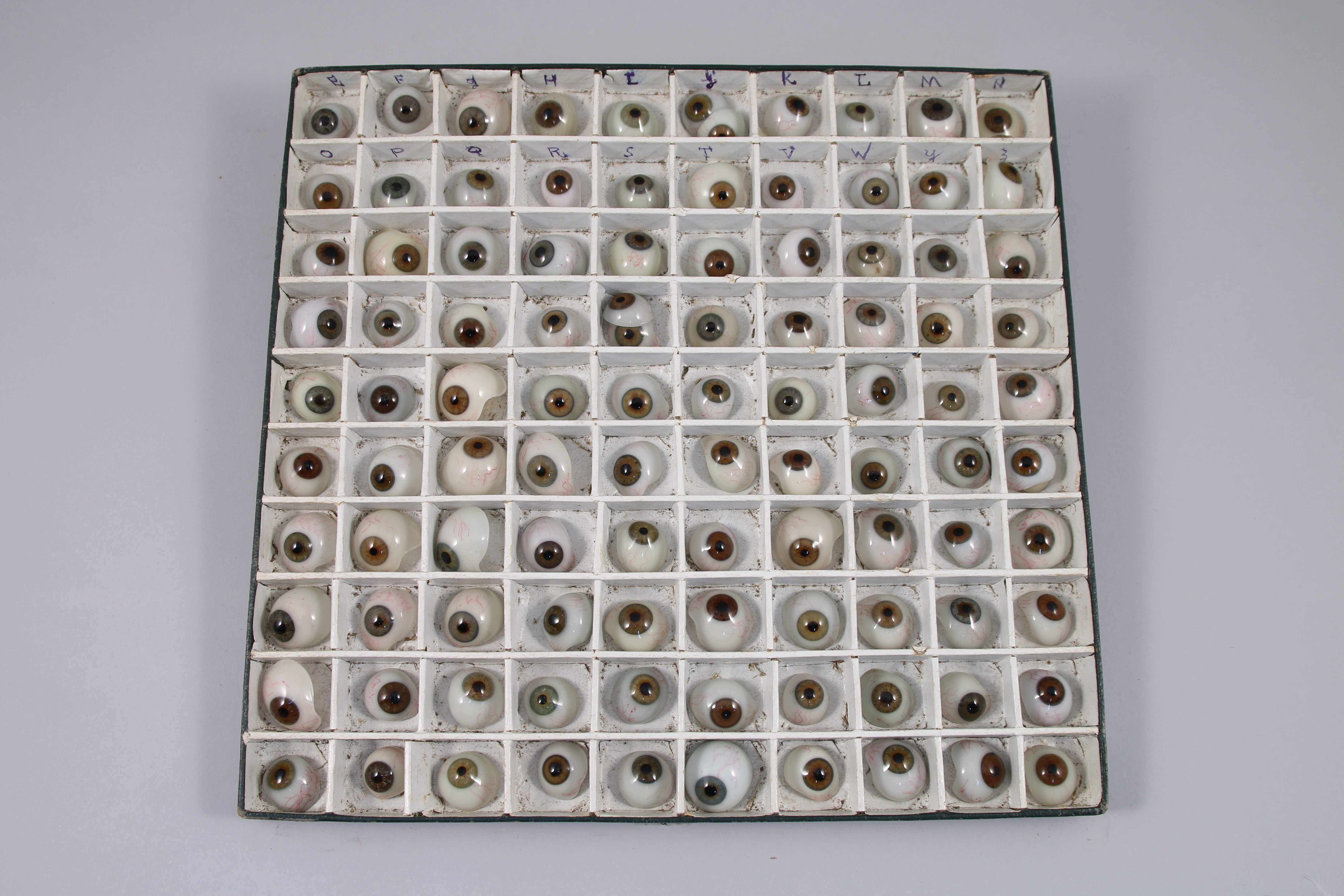 Environ une centaine de GLOBES OCULAIRES, simple ou double coque, dans un ou plusieurs coffrets gainés de chagrin. Les globes en verre teinté de différentes tailles, nuances de couleurs aux petits vaisseaux sanguins peints sur la conjonctive reproduisent l'iris grâce à des pigments de toutes teintes. Les formes des prothèses en demi-coquille sont irrégulières. Les tailles et couleurs diverses ont vocation à s'adapter aux patients ayant subi une énucléation.