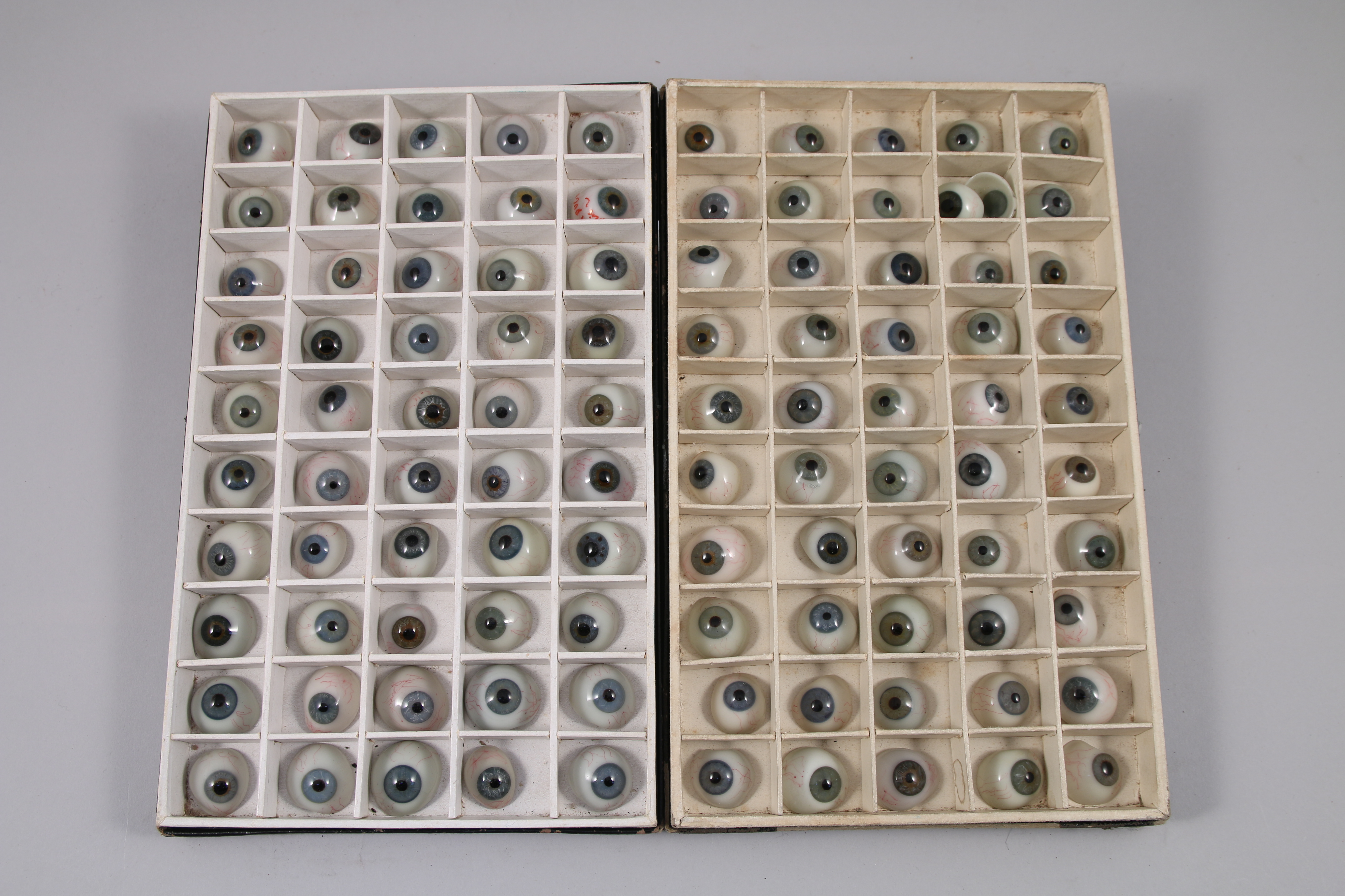 Environ une centaine de GLOBES OCULAIRES, simple ou double coque, dans un ou plusieurs coffrets gainés de chagrin. Les globes en verre teinté de différentes tailles, nuances de couleurs aux petits vaisseaux sanguins peints sur la conjonctive reproduisent l'iris grâce à des pigments de toutes teintes. Les formes des prothèses en demi-coquille sont irrégulières. Les tailles et couleurs diverses ont vocation à s'adapter aux patients ayant subi une énucléation.