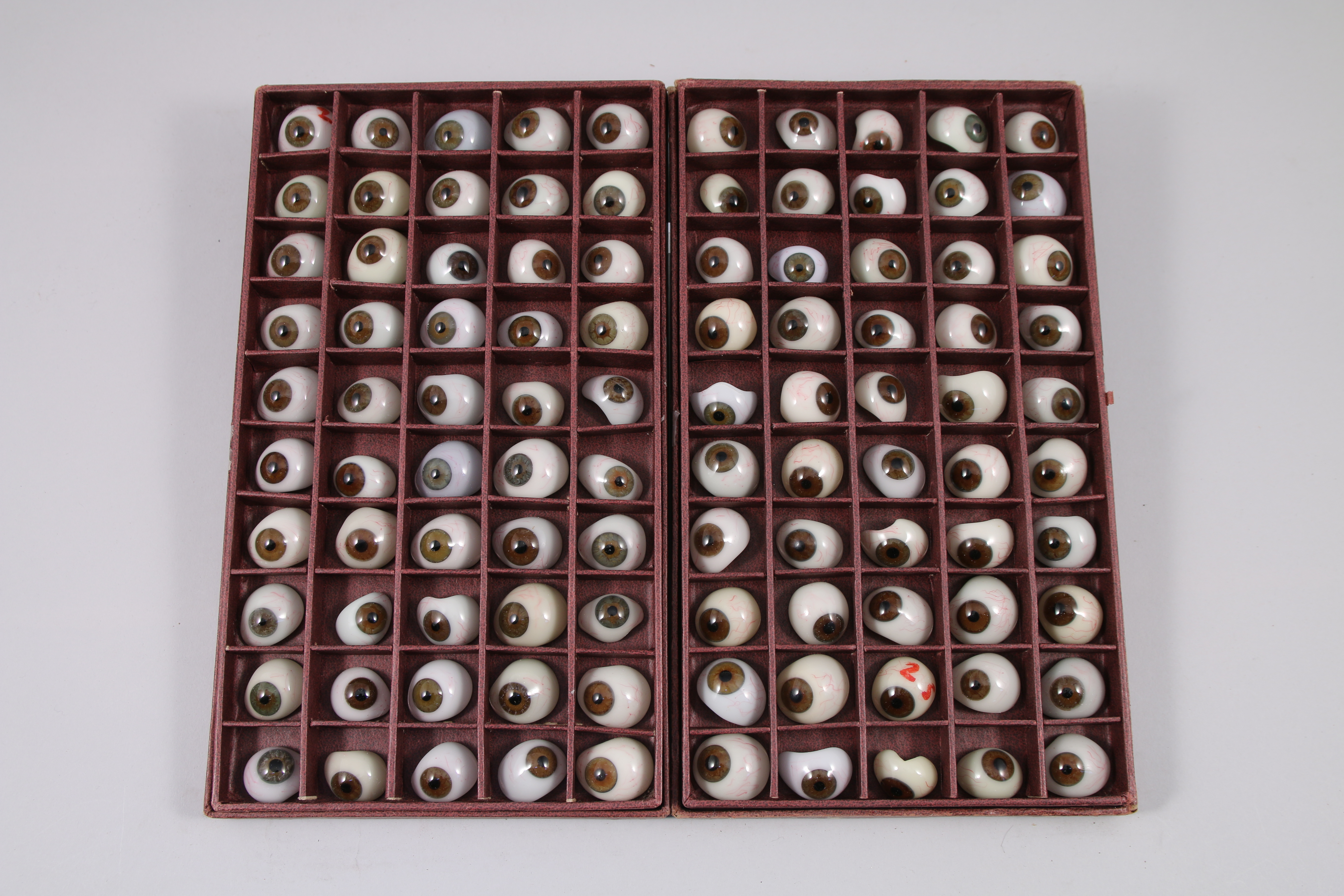 Environ une centaine de GLOBES OCULAIRES, simple ou double coque, dans un ou plusieurs coffrets gainés de chagrin. Les globes en verre teinté de différentes tailles, nuances de couleurs aux petits vaisseaux sanguins peints sur la conjonctive reproduisent l'iris grâce à des pigments de toutes teintes. Les formes des prothèses en demi-coquille sont irrégulières. Les tailles et couleurs diverses ont vocation à s'adapter aux patients ayant subi une énucléation au sortir de la première guerre mondiale.