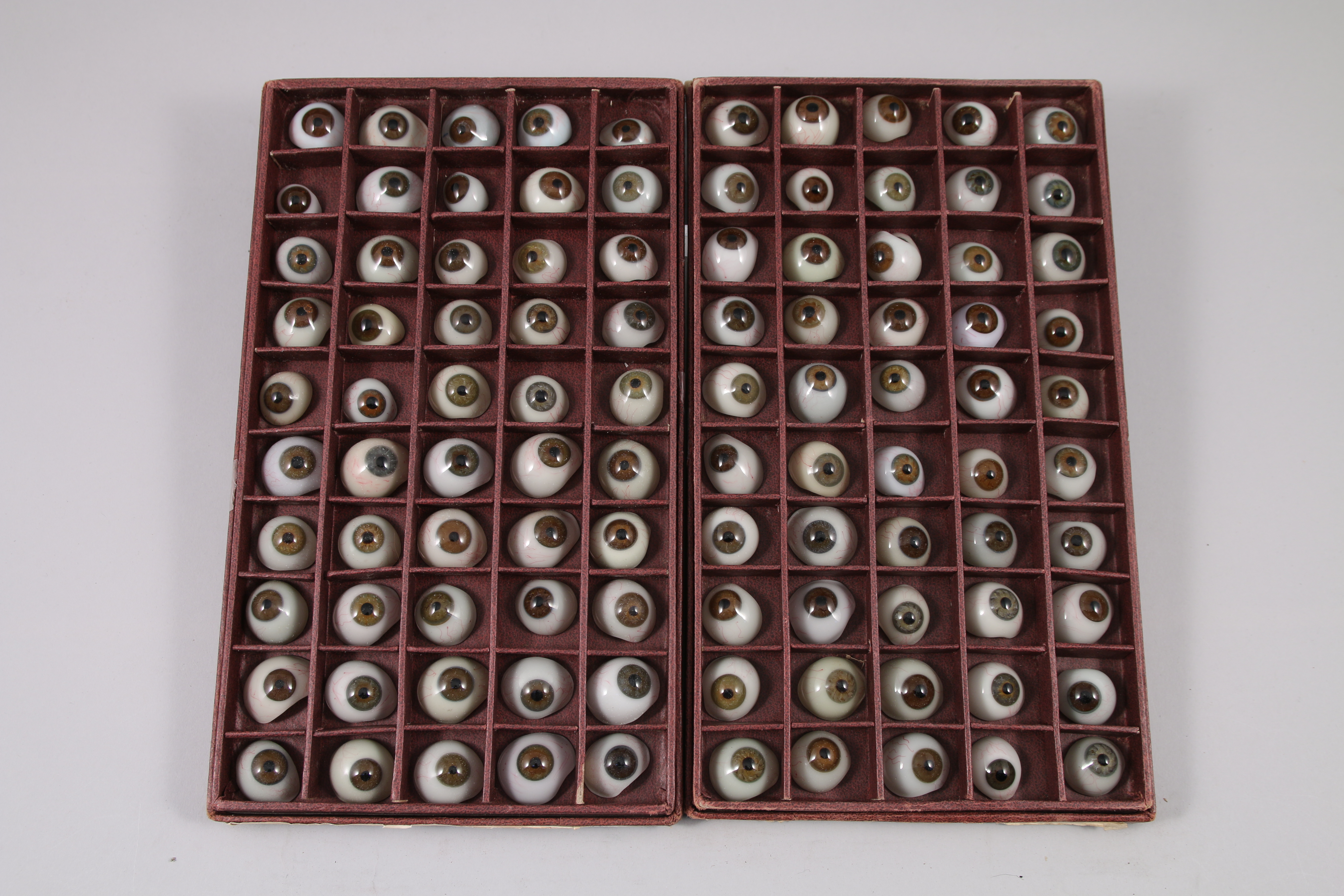 Environ une centaine de GLOBES OCULAIRES, simple ou double coque, dans un ou plusieurs coffrets gainés de chagrin. Les globes en verre teinté de différentes tailles, nuances de couleurs aux petits vaisseaux sanguins peints sur la conjonctive reproduisent l'iris grâce à des pigments de toutes teintes. Les formes des prothèses en demi-coquille sont irrégulières. Les tailles et couleurs diverses ont vocation à s'adapter aux patients ayant subi une énucléation au sortir de la première guerre mondiale.