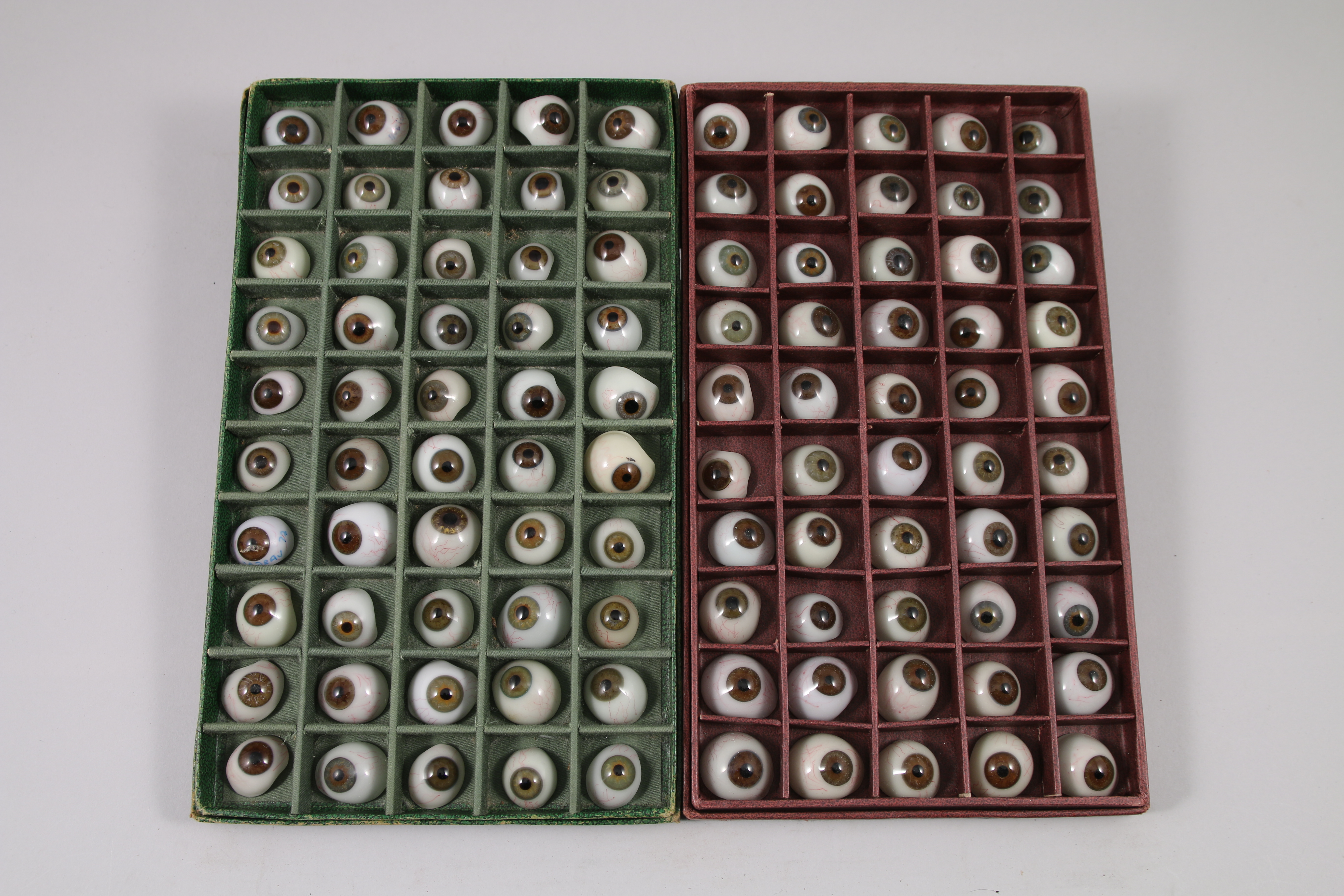Environ une centaine de GLOBES OCULAIRES, simple ou double coque, dans un ou plusieurs coffrets gainés de chagrin. Les globes en verre teinté de différentes tailles, nuances de couleurs aux petits vaisseaux sanguins peints sur la conjonctive reproduisent l'iris grâce à des pigments de toutes teintes. Les formes des prothèses en demi-coquille sont irrégulières. Les tailles et couleurs diverses ont vocation à s'adapter aux patients ayant subi une énucléation au sortir de la première guerre mondiale.