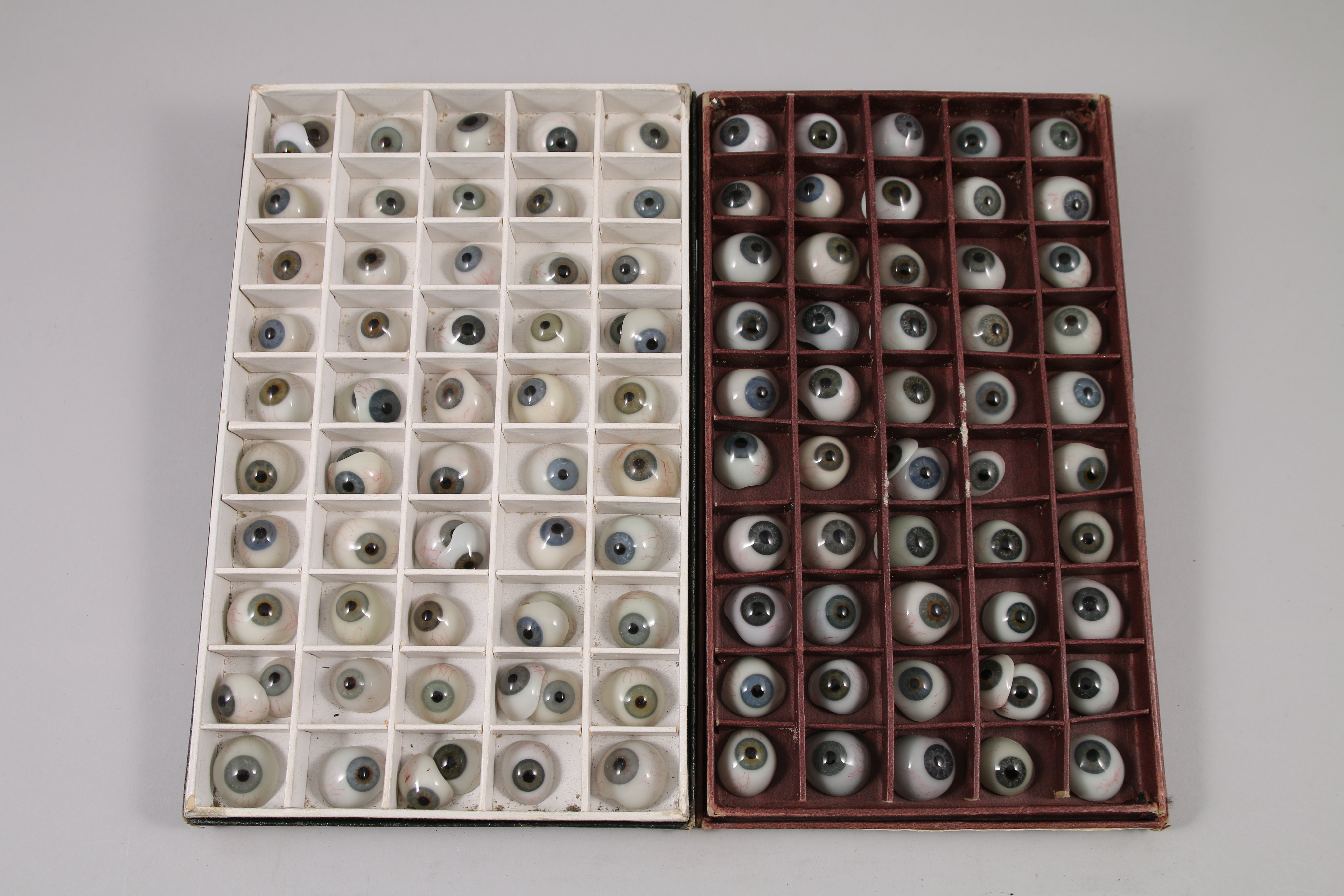 Environ une centaine de GLOBES OCULAIRES, simple ou double coque, dans un ou plusieurs coffrets gainés de chagrin. Les globes en verre teinté de différentes tailles, nuances de couleurs aux petits vaisseaux sanguins peints sur la conjonctive reproduisent l'iris grâce à des pigments de toutes teintes. Les formes des prothèses en demi-coquille sont irrégulières. Les tailles et couleurs diverses ont vocation à s'adapter aux patients ayant subi une énucléation au sortir de la première guerre mondiale.