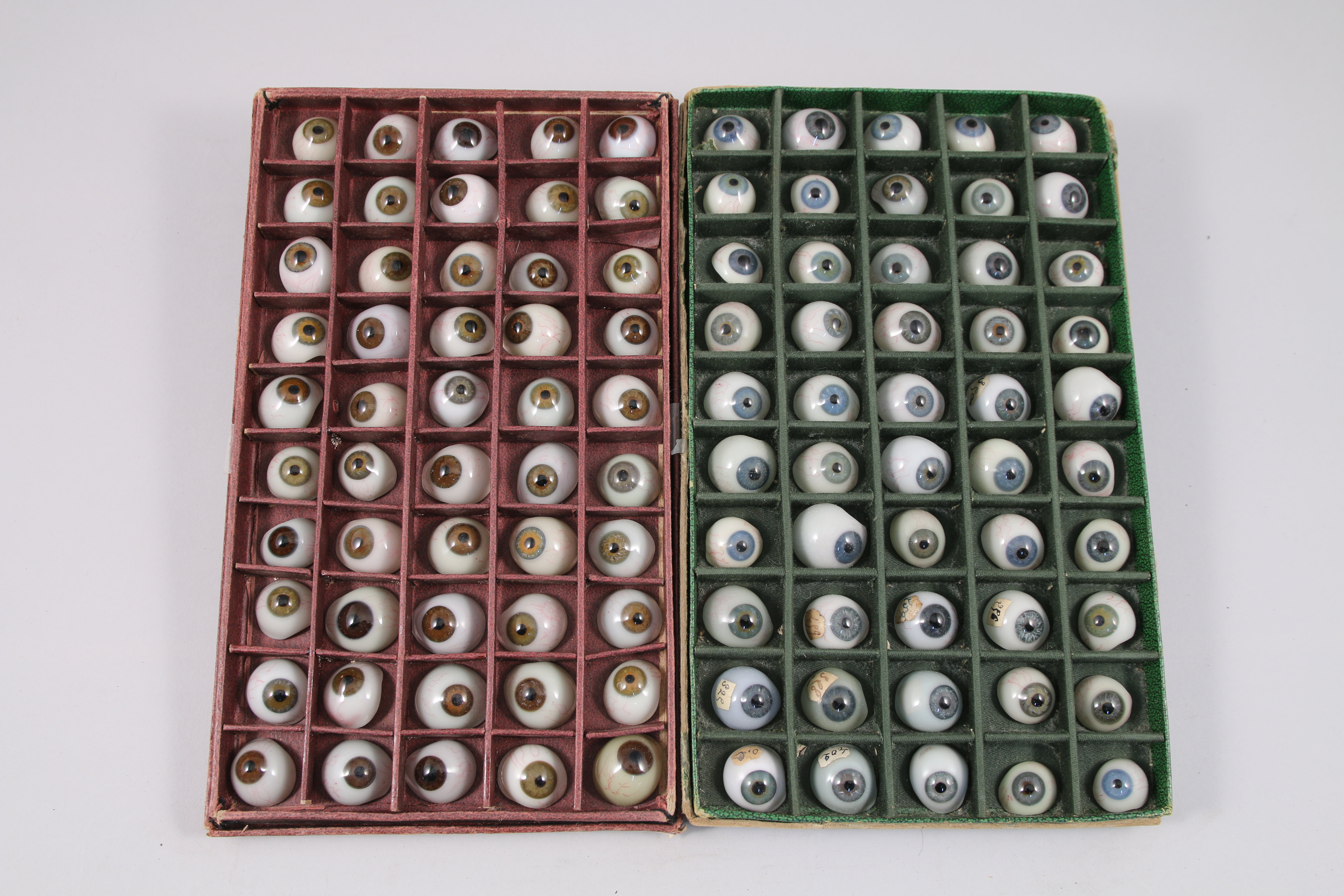 Environ une centaine de GLOBES OCULAIRES, simple ou double coque, dans un ou plusieurs coffrets gainés de chagrin. Les globes en verre teinté de différentes tailles, nuances de couleurs aux petits vaisseaux sanguins peints sur la conjonctive reproduisent l'iris grâce à des pigments de toutes teintes. Les formes des prothèses en demi-coquille sont irrégulières. Les tailles et couleurs diverses ont vocation à s'adapter aux patients ayant subi une énucléation.