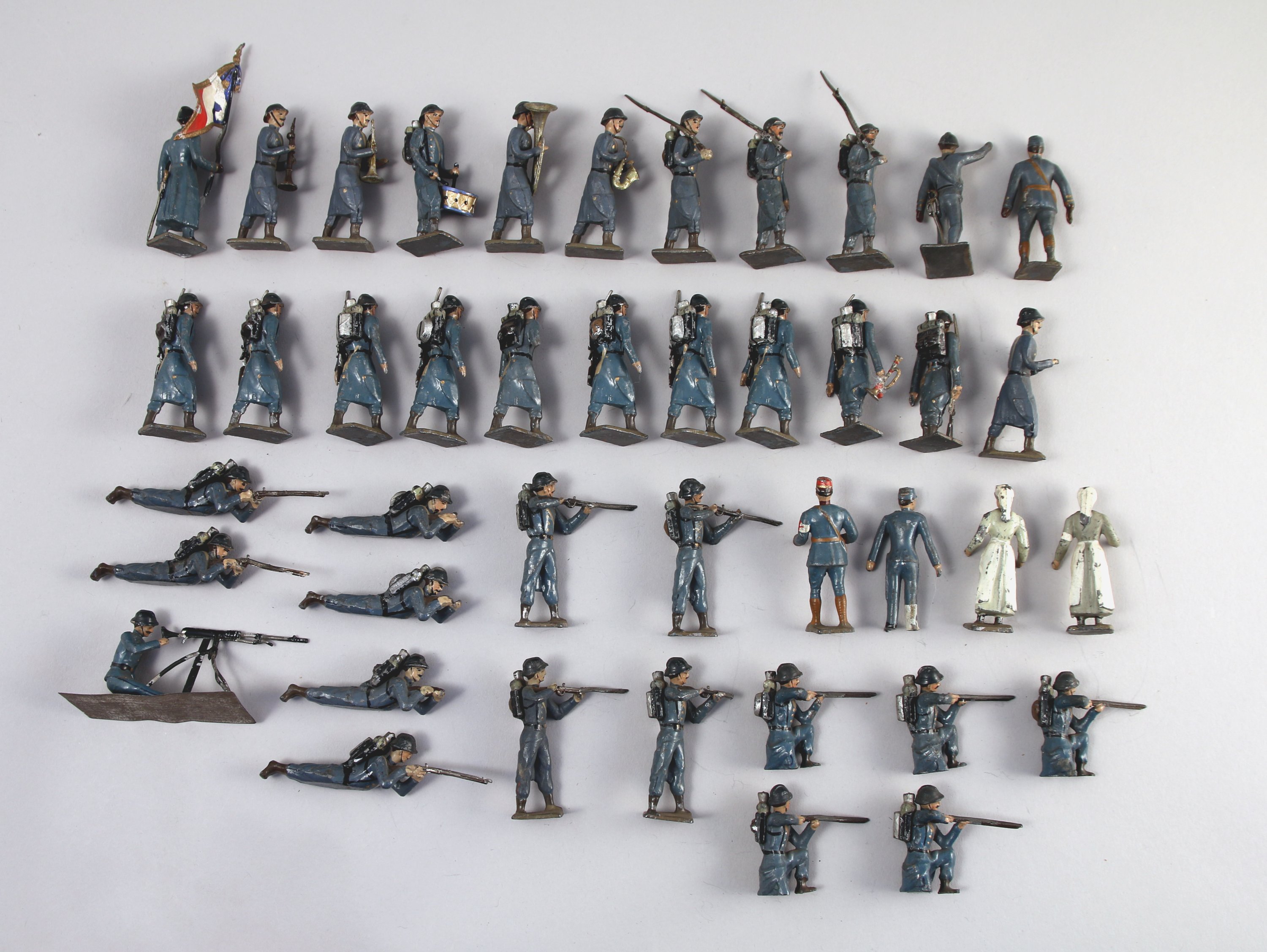 SOLDATS DE LA GRANDE GUERRE en plomb peint polychrome, 41 PIÈCES : 8 FANTASSINS au pas; 4 FANTASSINS épaulant debout; 5 FANTASSINS épaulant un genoux à terre; 6 FANTASSINS épaulant allongés; 3 FANTASSINS le fusil sur l'épaule; FANTASSIN au garde-à-vous; PORTE-DRAPEAU; 2 FANTASSINS dont un avec CLAIRON; 2 OFFICIERS; OFFICIER du service de santé; 2 INFIRMIÈRES; SOLDAT avec mitrailleuse; FANFARE : trompette, tuba, tambour, saxophone et clarinette.