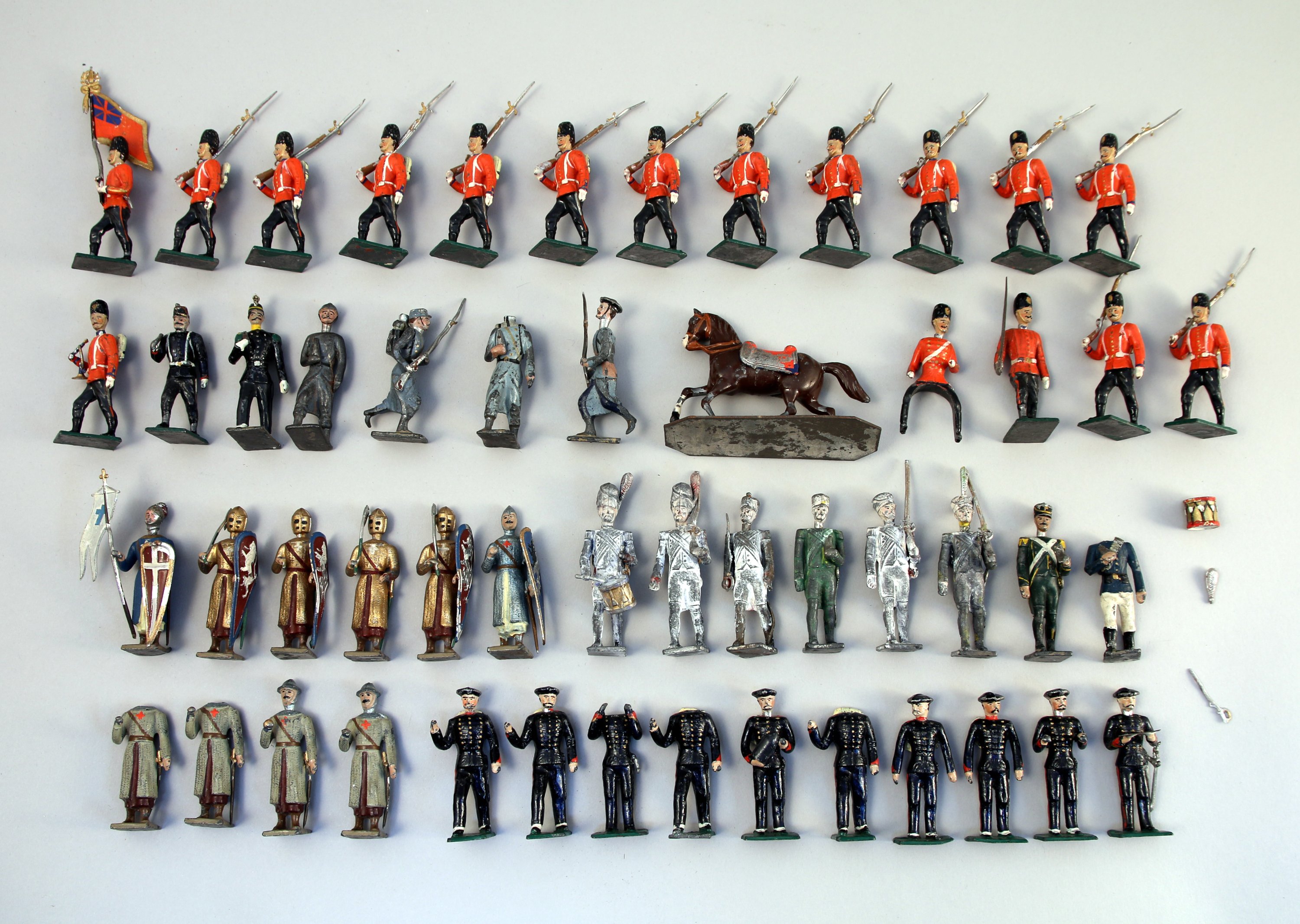 SOLDATS de PLOMB peints à la main. 52 pièces de divers époques, corps et pays. Certains à la tête escamotable.