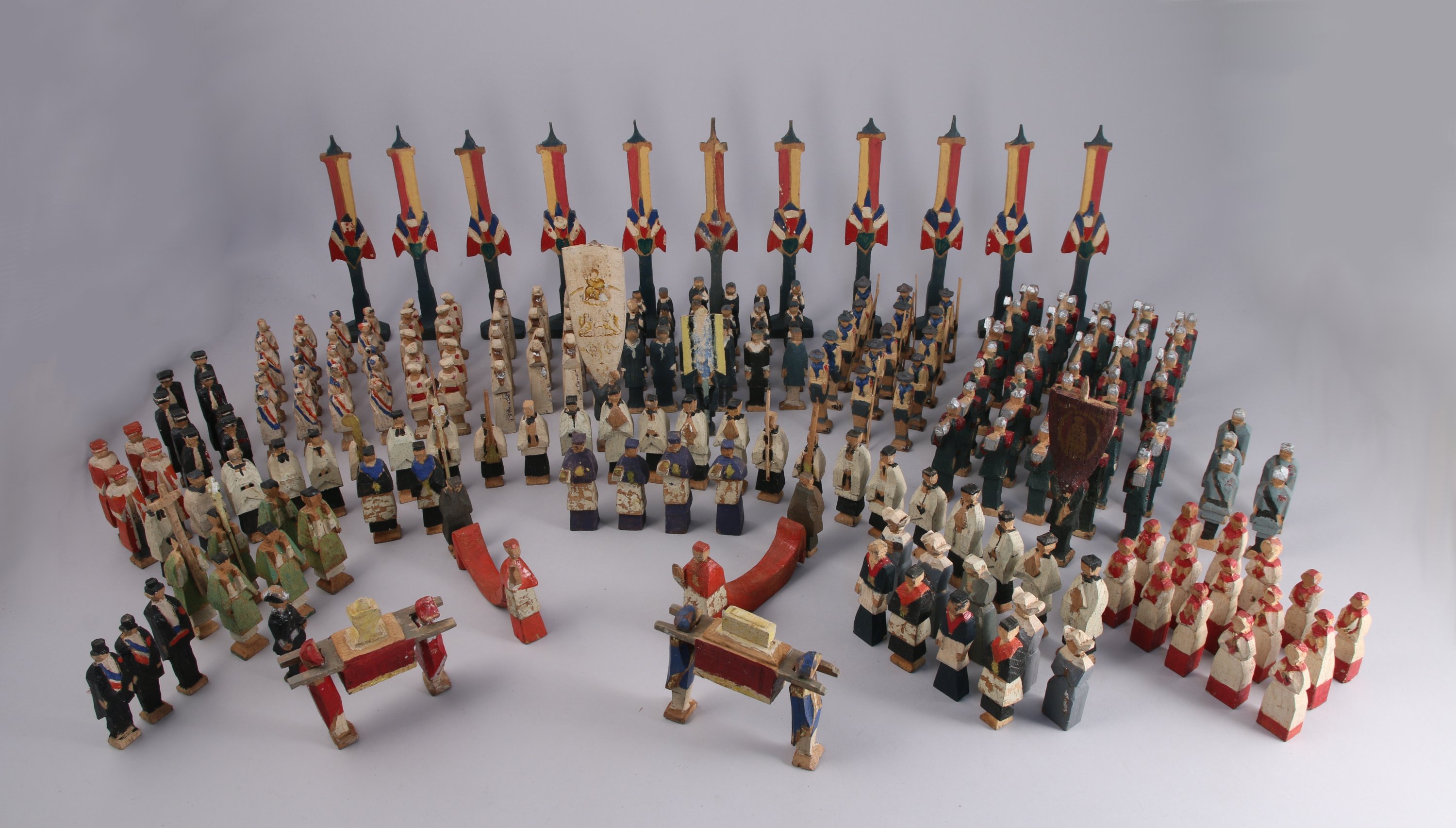 Ensemble d'environ 225 SUJETS en bois sculpté et peint représentant la PROCESSION des FÊTES de Ste JEANNE D'ARC du 8 mai à Orléans. La procession se compose de 4 suisses; 15 enfants de choeur; 24 prêtres et servants de messe dont des céroféraires; 6 cruciféraires (manque des croix); 6 chanoines; 4 évêques; 2 cardinaux; 22 religieuses; 2 moines; 2 châsses; l'étendart de Jeanne, un porte-bannière; 24 communiants ?; 12 magistrats; 3 grands élus; un prefét; 35 sapeurs-pompiers dont des musiciens de la fanfare municipale ; 5 soldats; 15 scouts; 20 jeunes filles de l'institution Serenne; 10 infirmières et 11 mâts pavoisés.