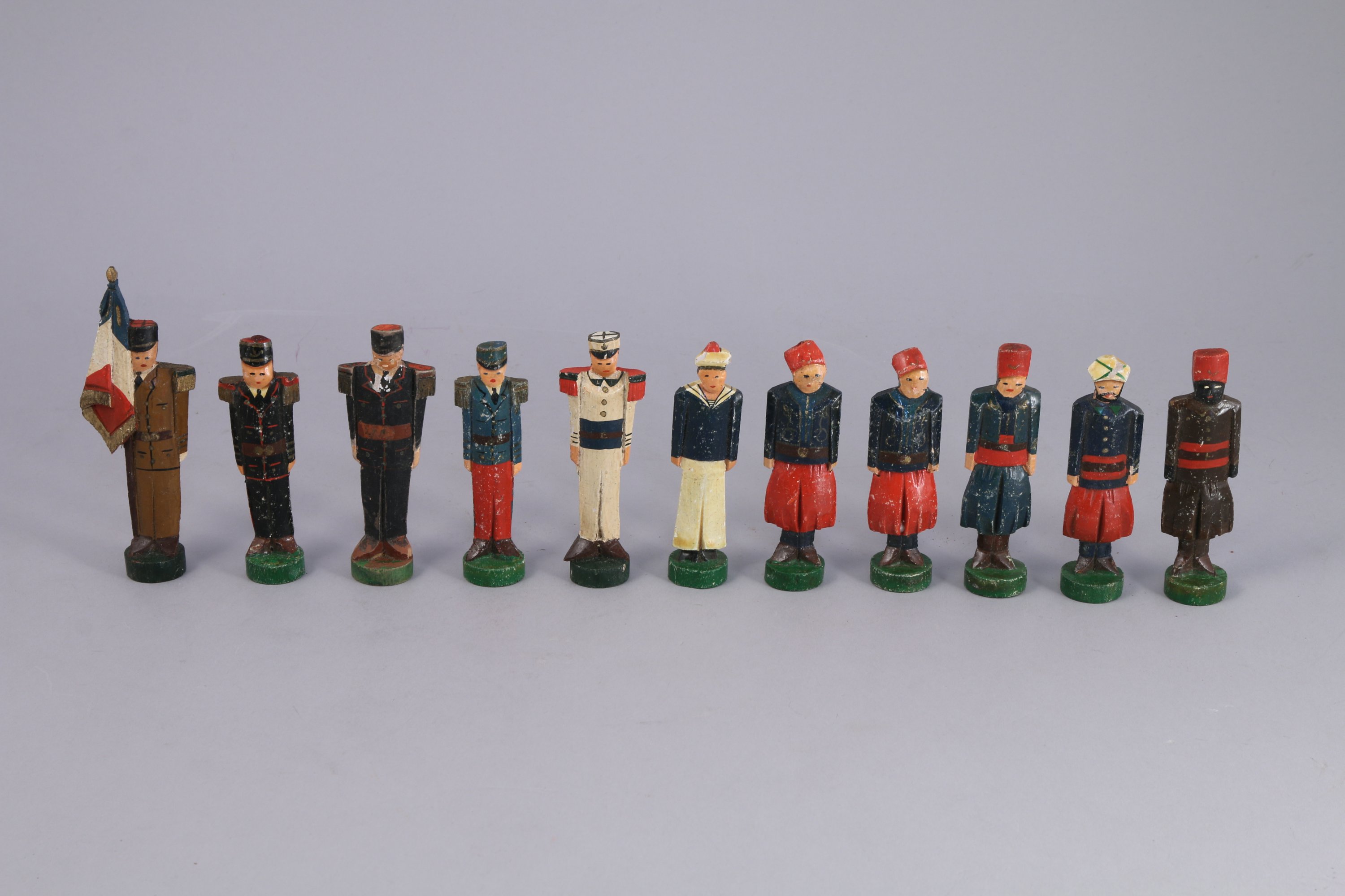 - 11 MILITAIRES en bois sculpté et peint, dont troupes coloniales.