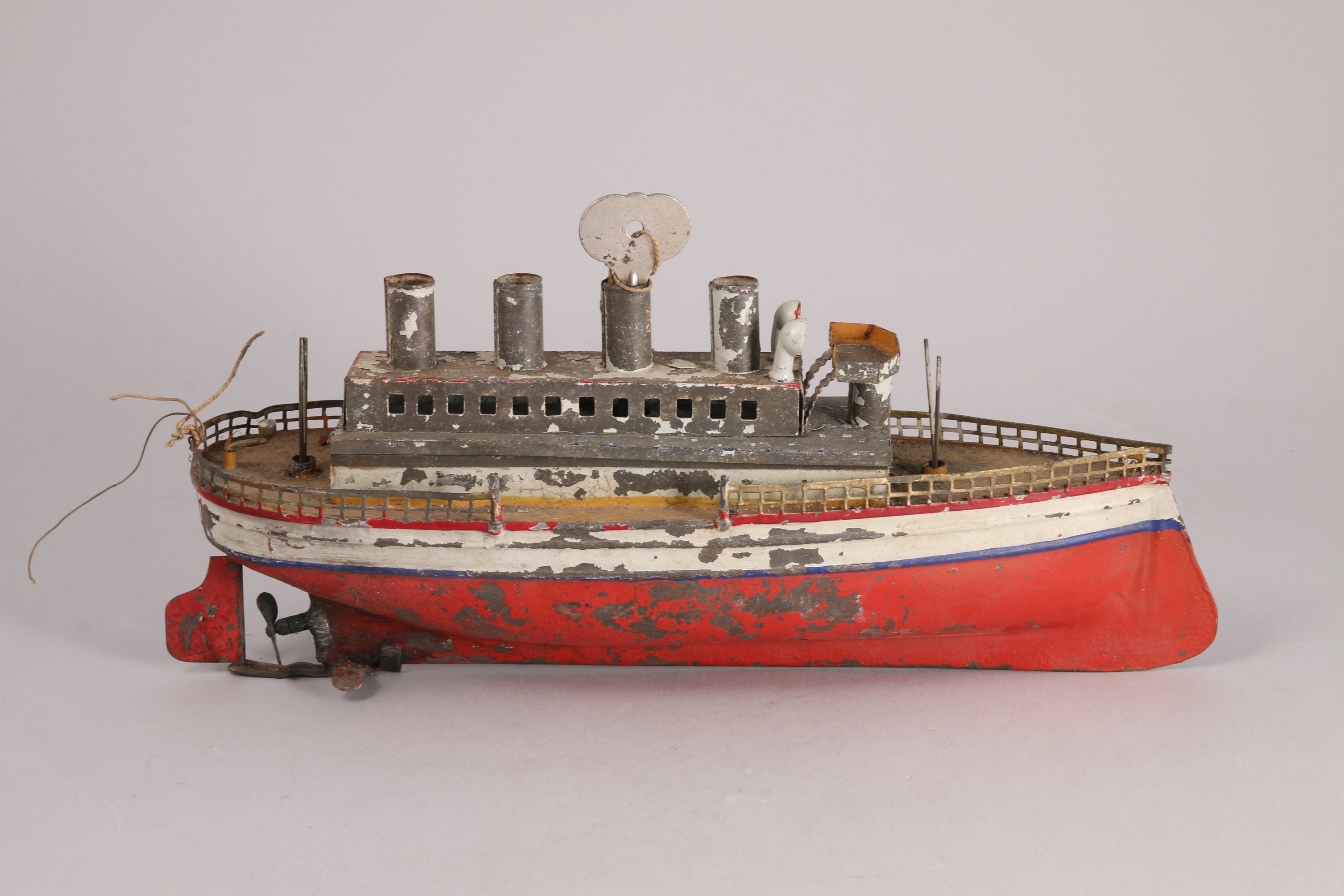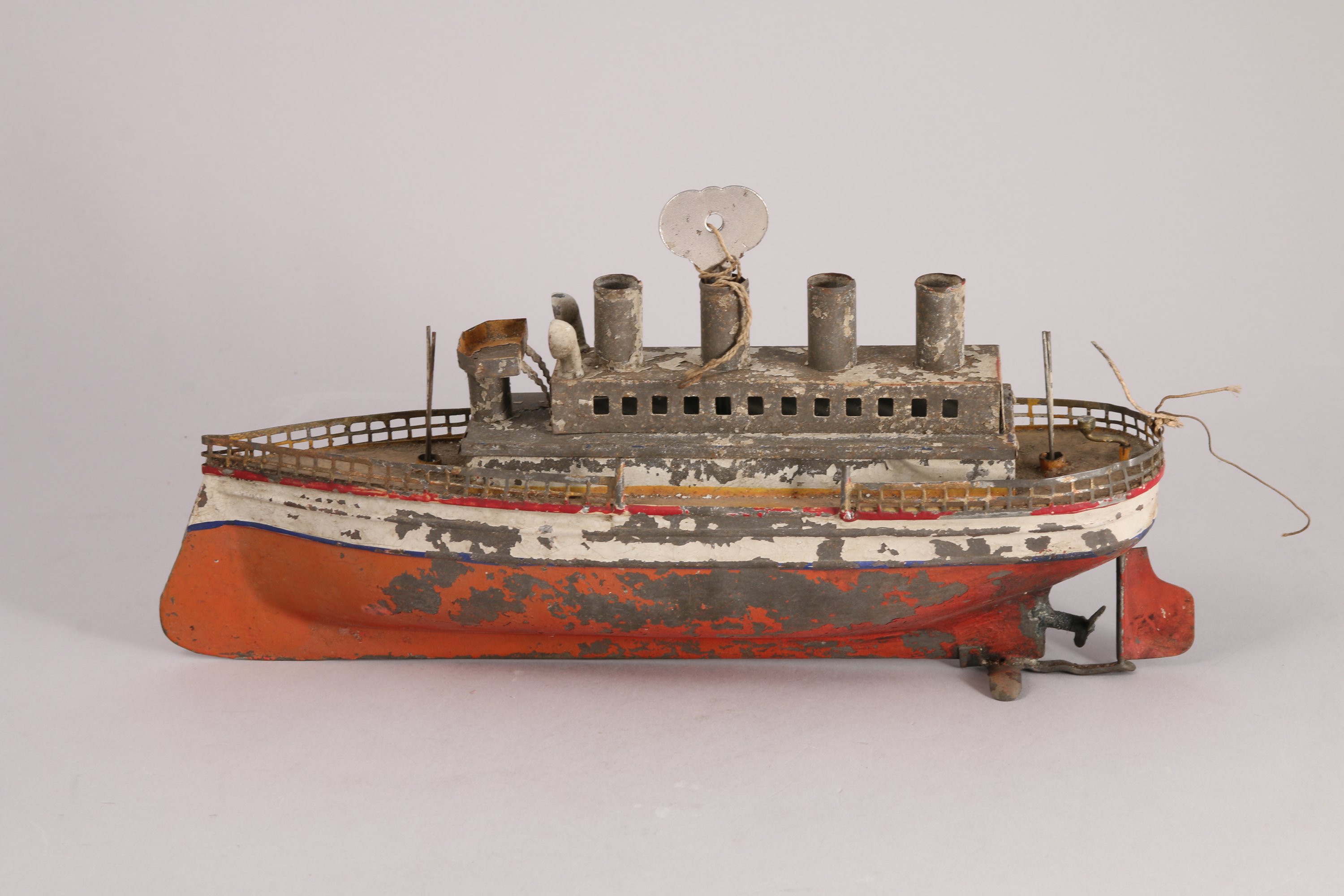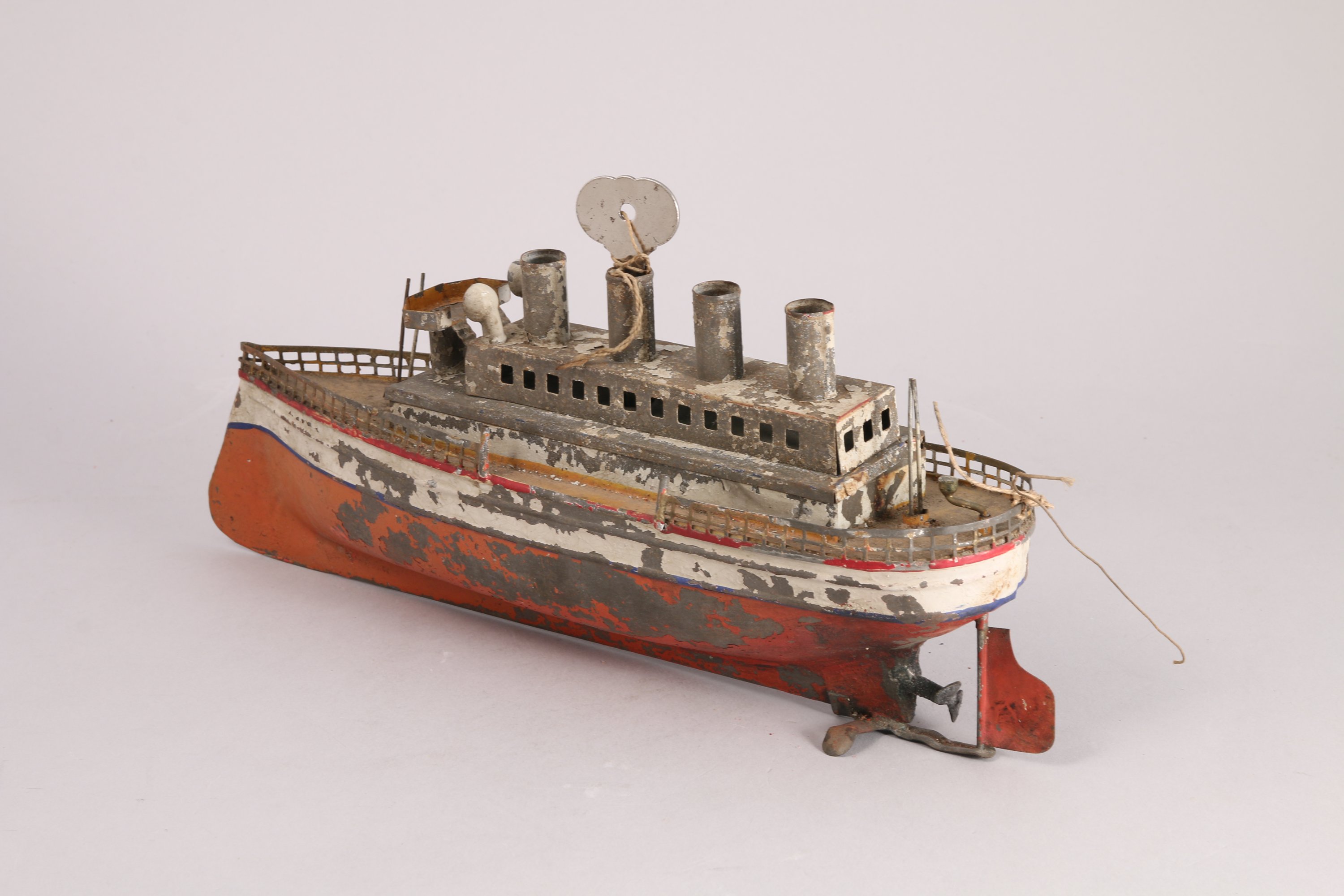 BATEAU MÉCANIQUE en tôle peinte (manques). Long. 33 cm. (ne fonctionne pas)