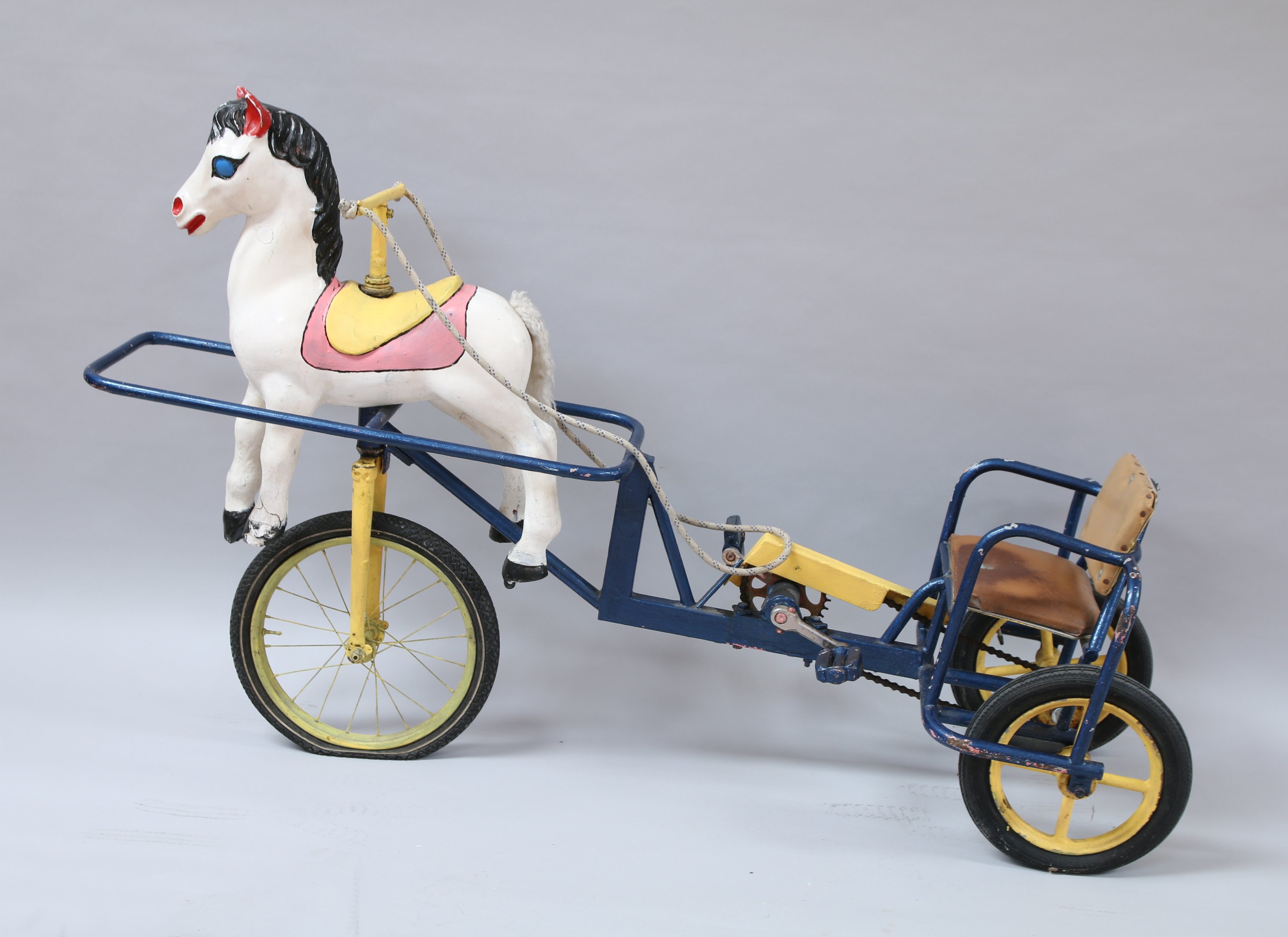 TRICYCLE D'ENFANT en métal. Il est tiré par un cheval en résine polychrome.