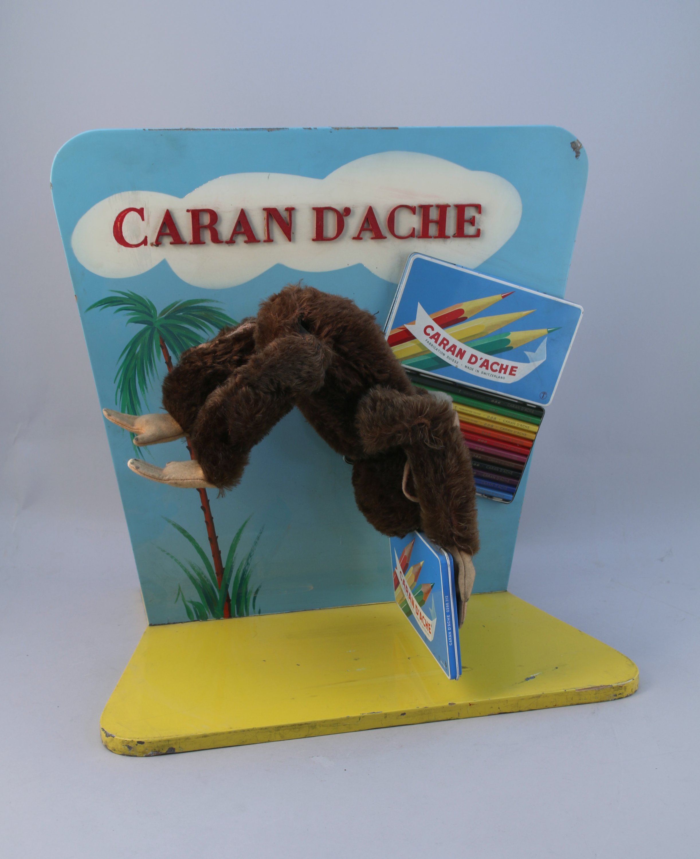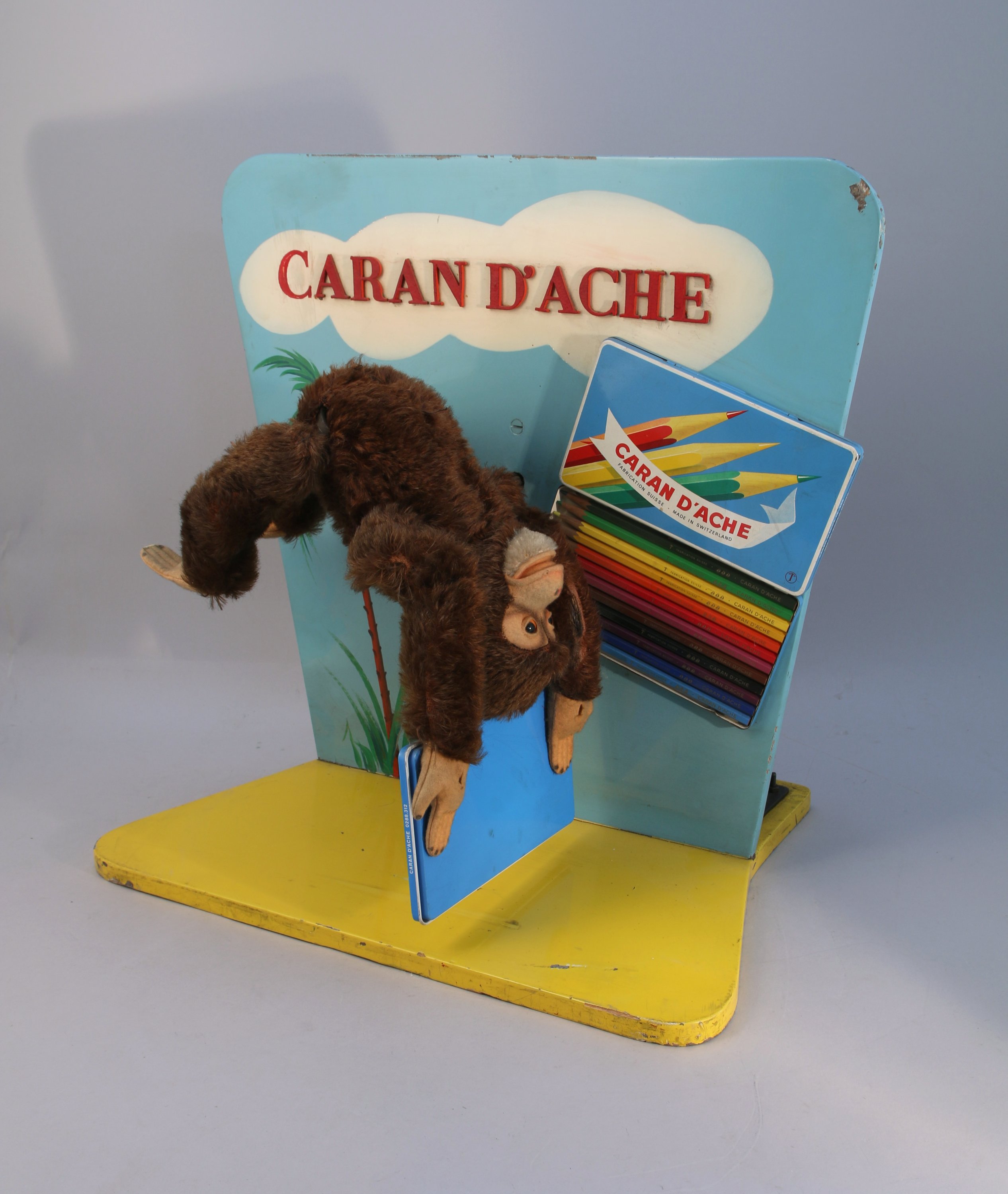 CARAN D'ACHE. SINGE ACROBATE PUBLICITAIRE. Un peluche articulée tenant une boite de 12 crayons de couleurs effectuant des cabrioles à la renverse sur un fond bleu azur décoré d'un palmier et d'une autre boite de ces crayons d'excellence. Un moteur élecrique en état de fonctionnement, 110/220 volts, par Bugnon à Genève est dissimiulé à l'arrière.