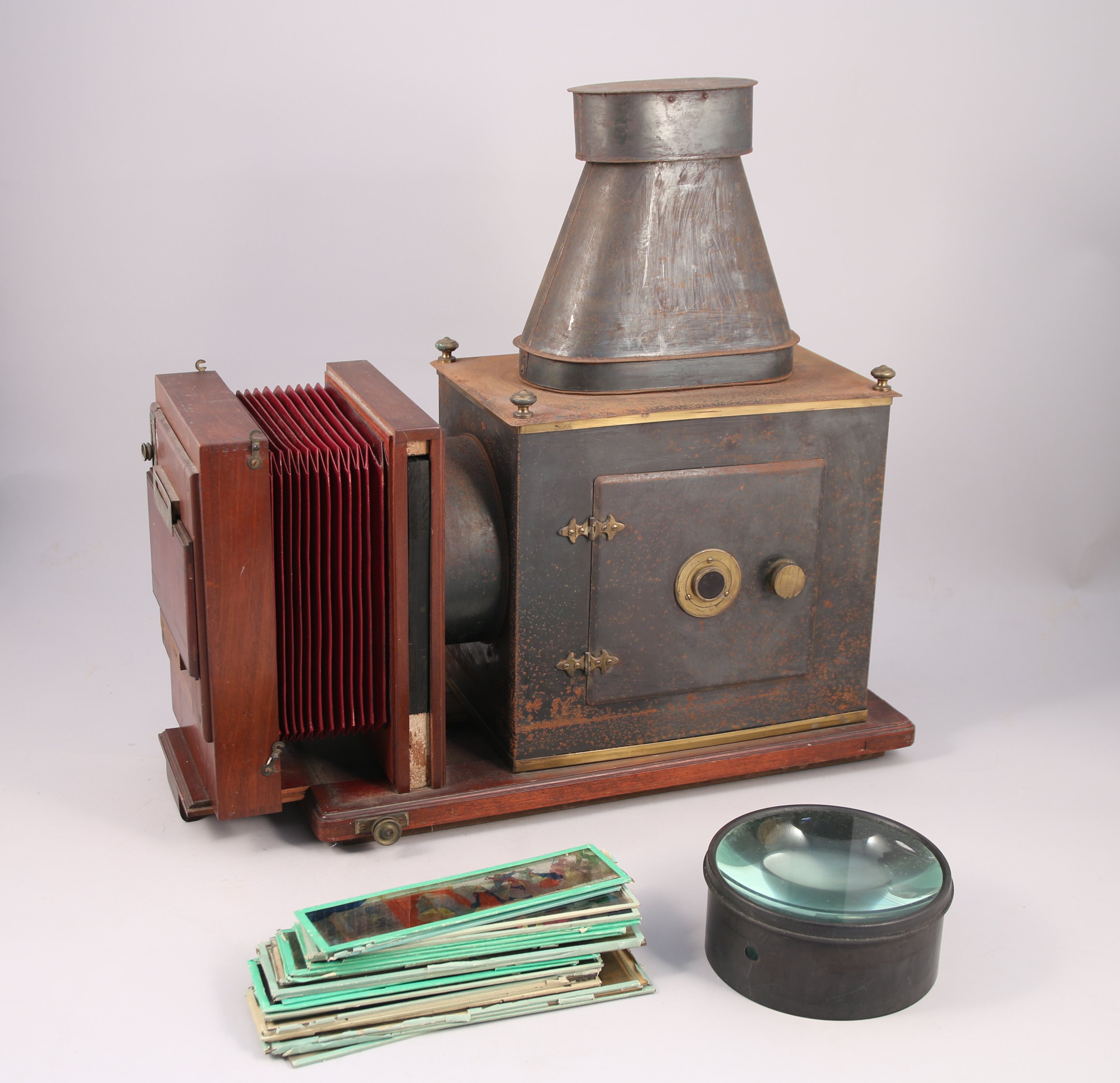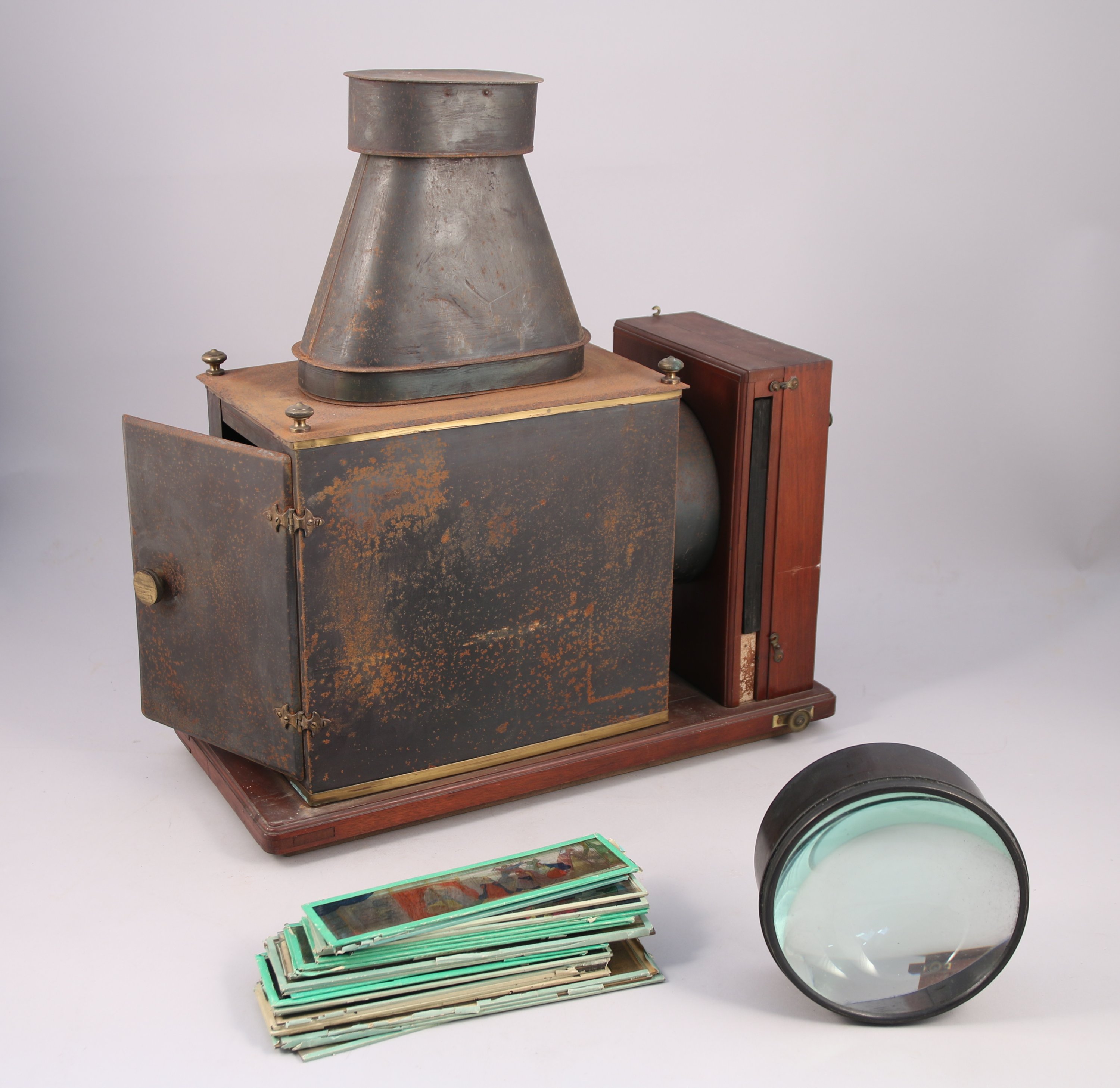 PROJECTEUR "LANTERNE MAGIQUE" en tôle avec un lot de 25 plaques de verre imprimées de représentations d'images d'Epinal sur le thème de contes et diverses caricatures. Lentille en bon état.