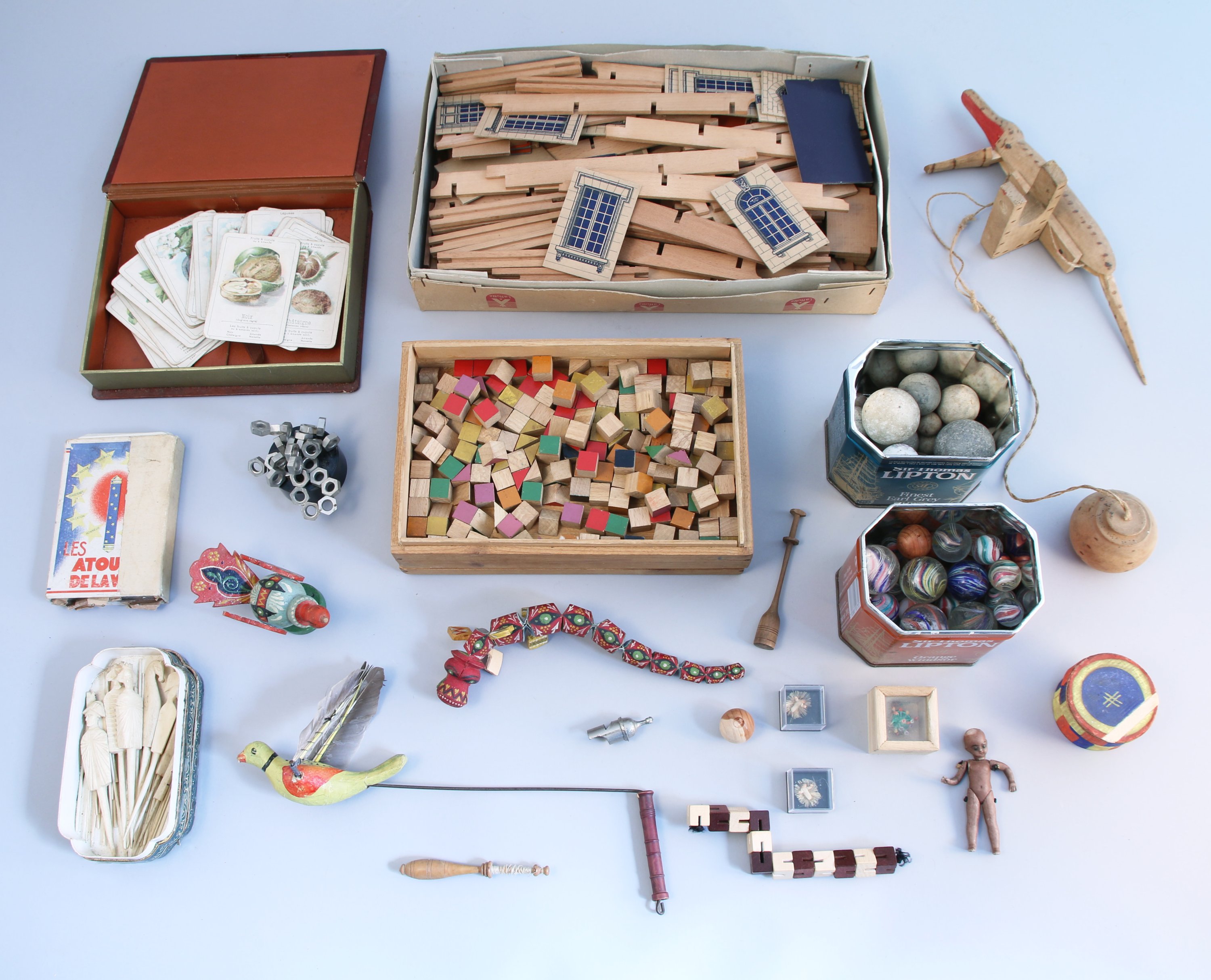 JOINT : Divers petits jouets dont billes, jeu de mosaïque, jeux de cartes.