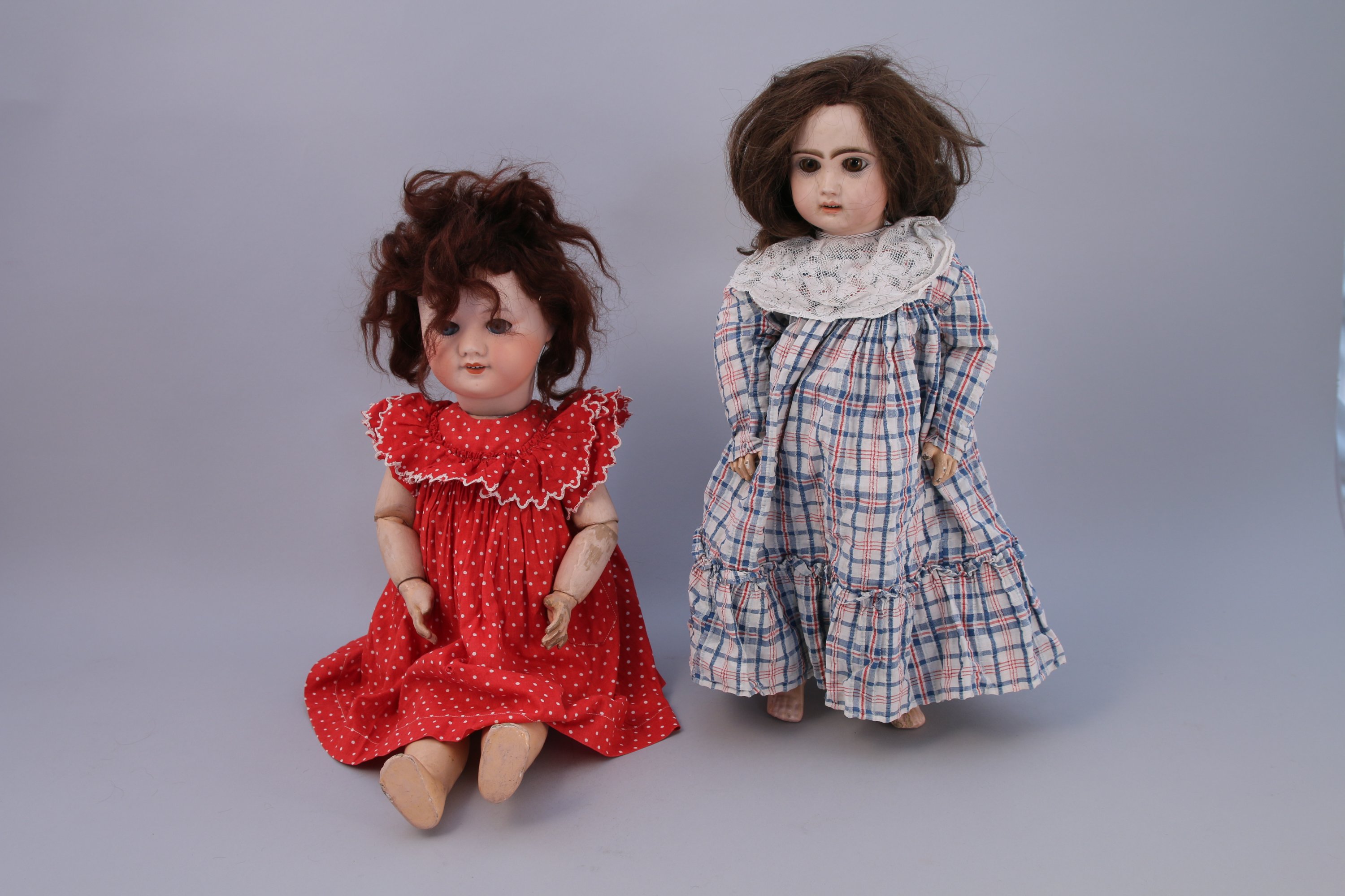 POUPÉE articulée, tête en porcelaine, yeux bleus mobiles en sulfure, bouche ouverte, cheveux châtains. Corps en composition. Vêtue d'une robe rouge à pois blancs. Marque sous les pieds "600-7".