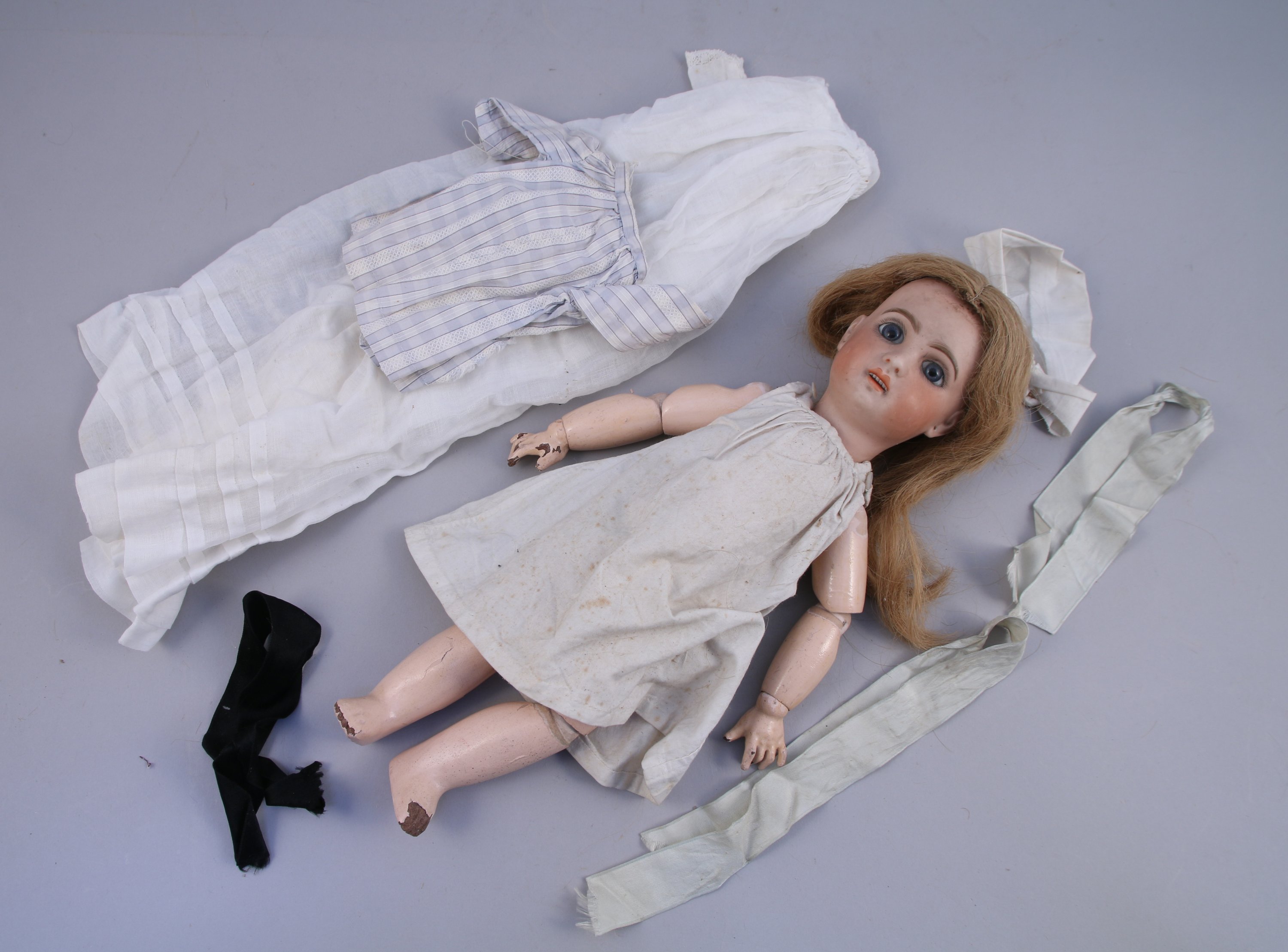 POUPÉE, tête en porcelaine (5) marquée "TÊTE JUMEAU" au tampon rouge. Bouche ouverte, yeux sulfure bleus, oreilles percées. Corps articulé en bois laqué portant une étiquette "Bébé Jumeau / Diplôme d'H[onneur]".