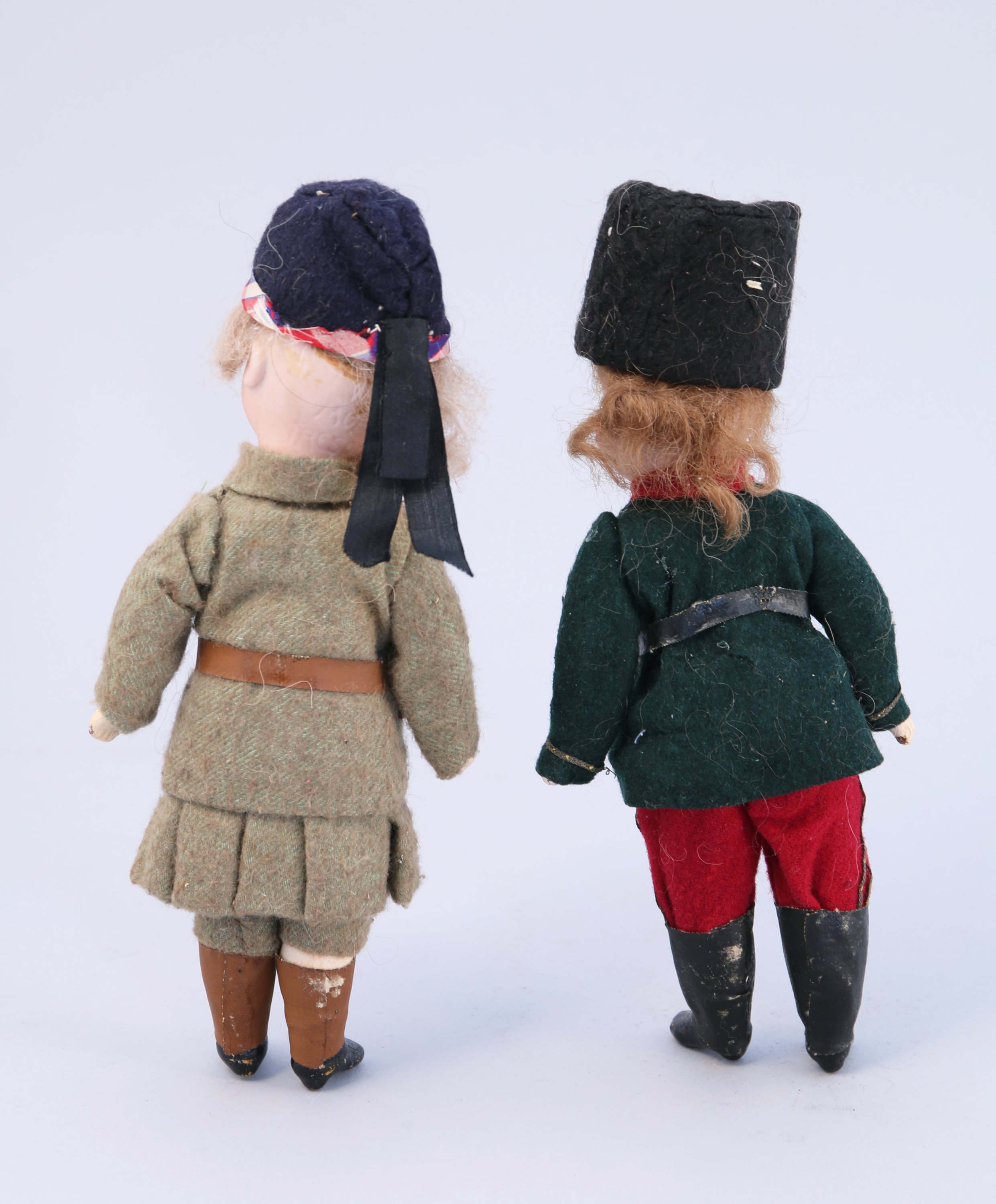Deux MIGNONNETTES SOLDATS figurant une COSAQUE et une ÉCOSSAISE. Les têtes en biscuit signé pour l'une " MON TRÉSOR ", yeux bleus et marrons, bouches ouvertes. Corps en composition.