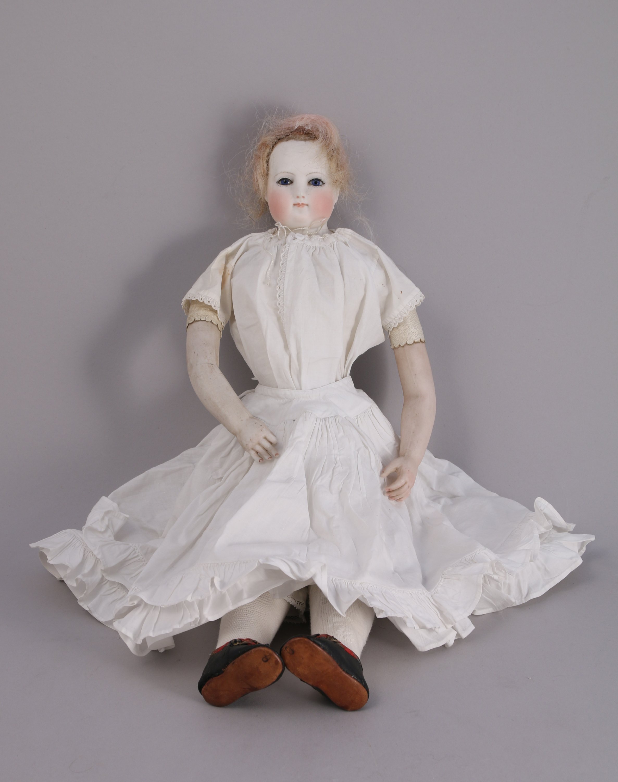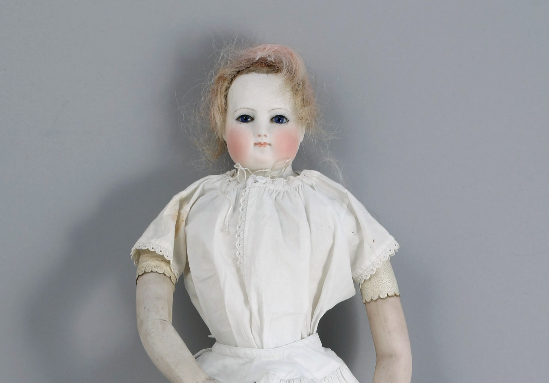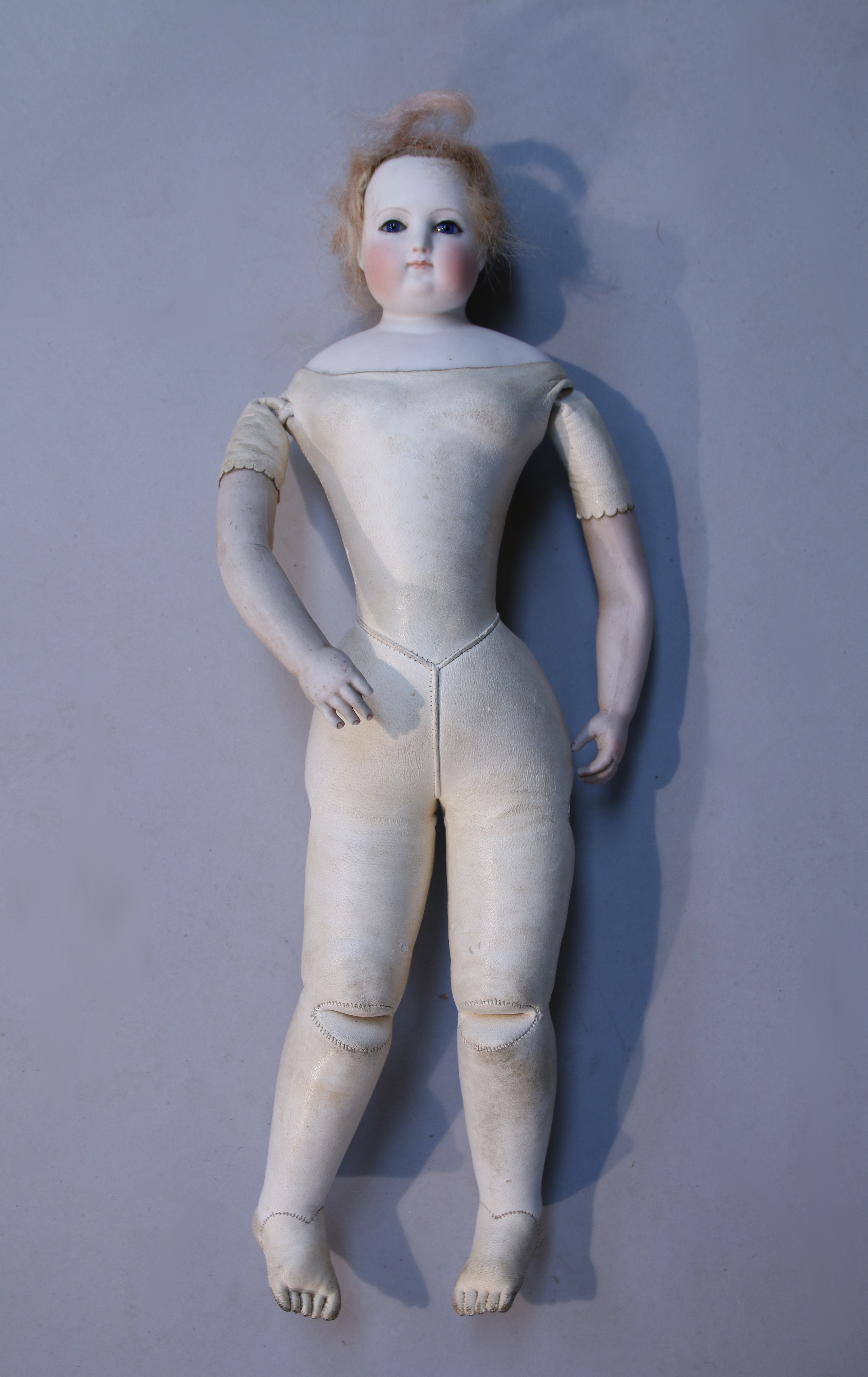 POUPÉE, tête-buste et bras en porcelaine. Bouche fermée, yeux bleus en sulfure. Corps rembourré en cuir. Habits, perruque.