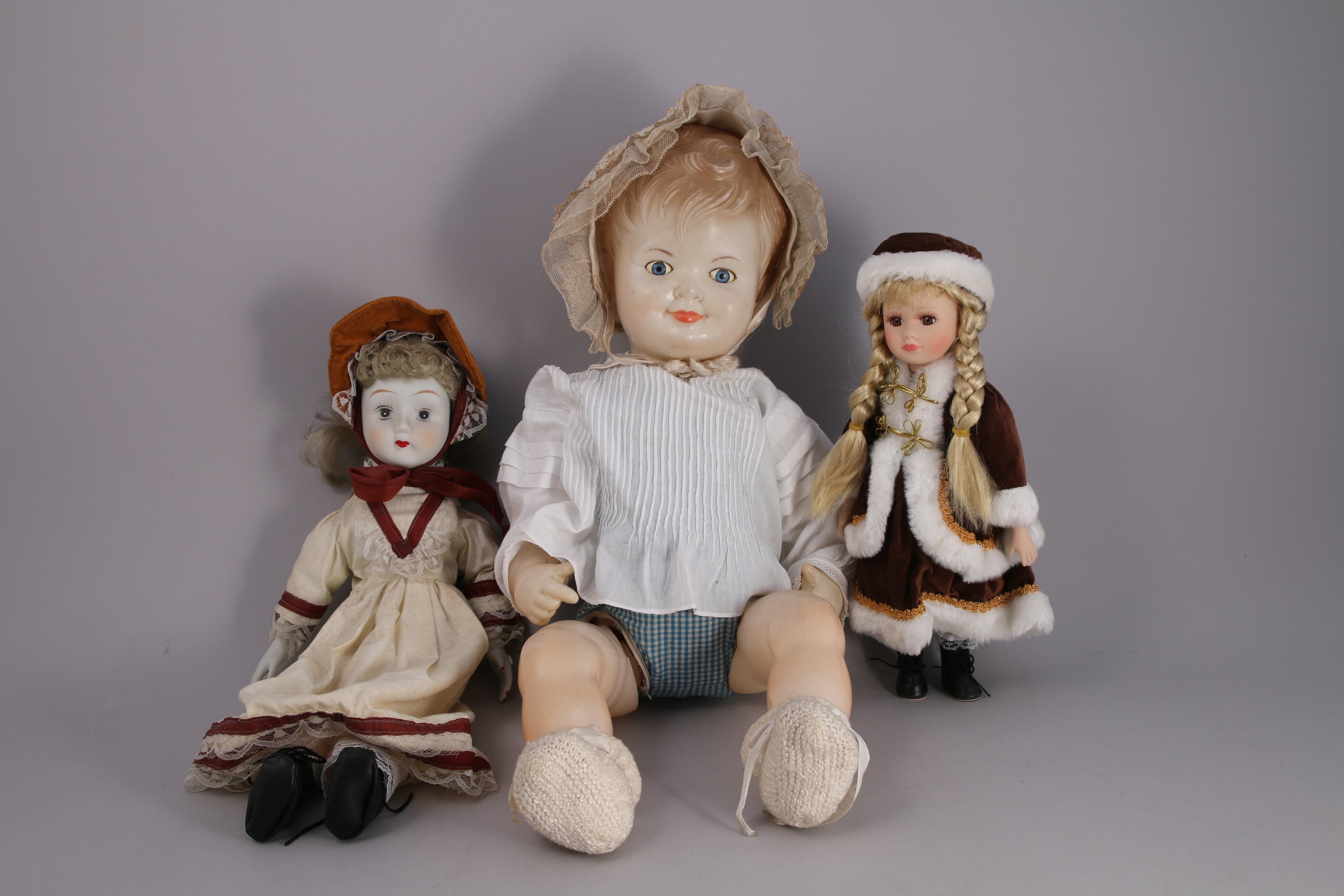 Réunion de deux POUPÉES en porcelaine et d'un BAIGNEUR en celluloïd.