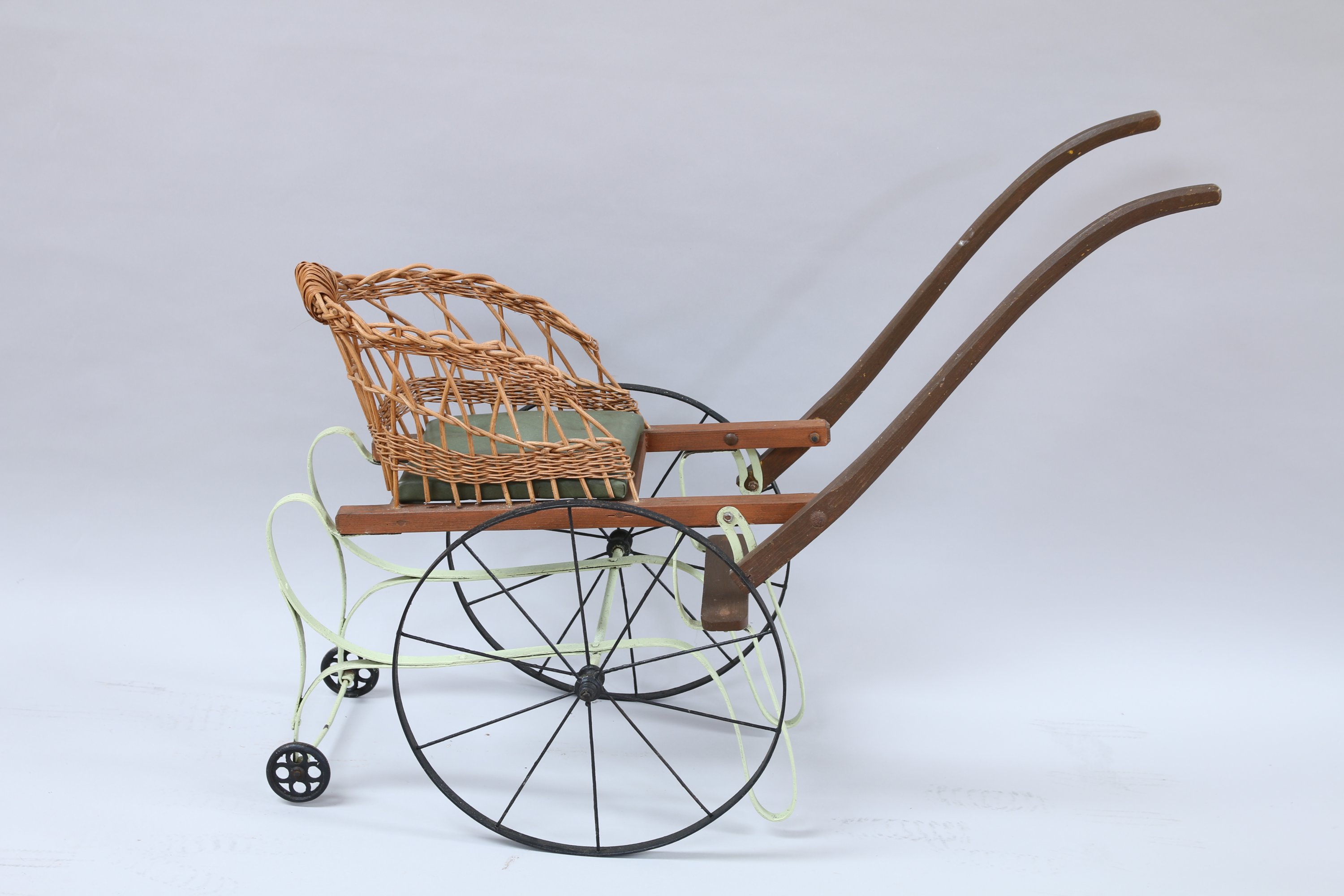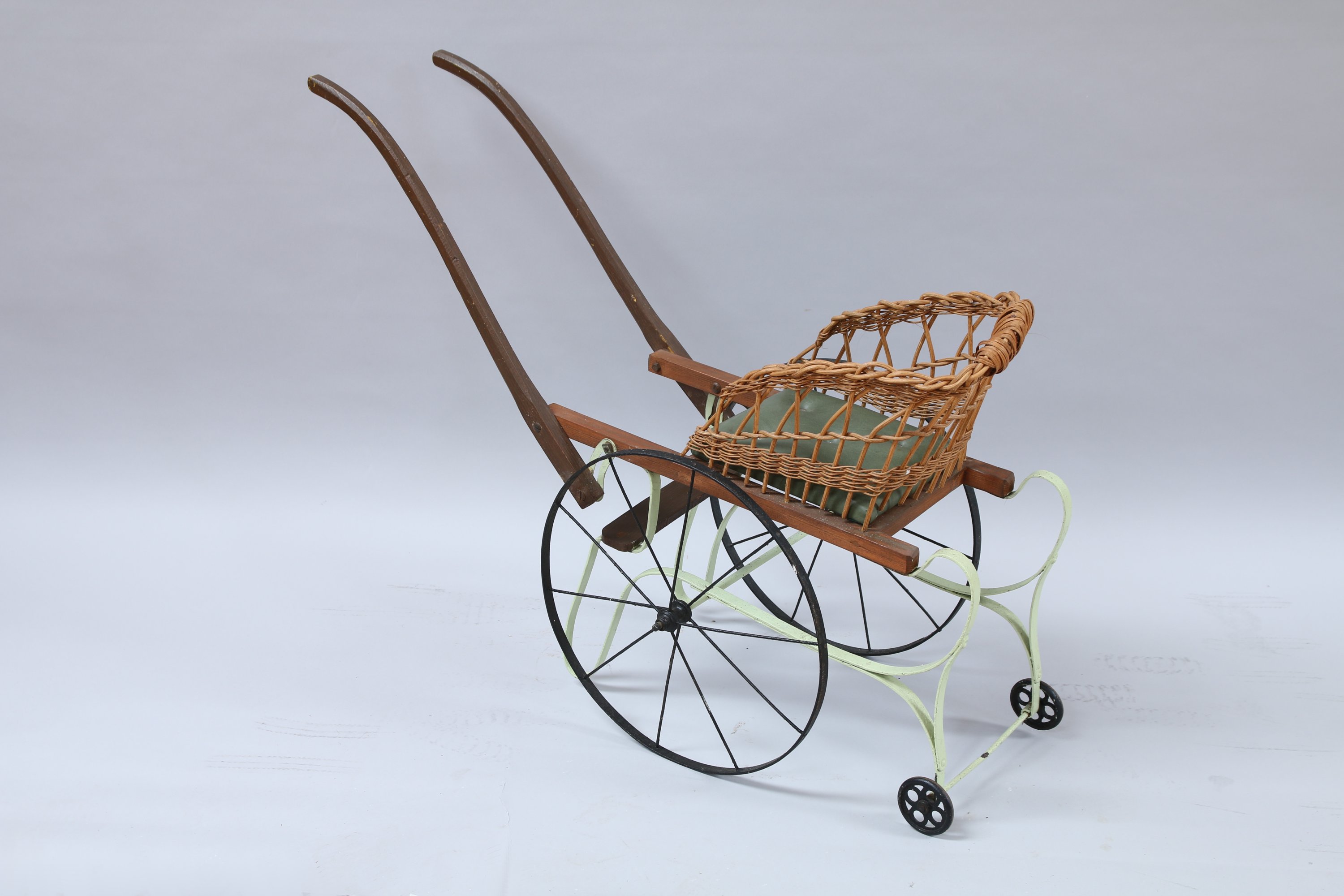 POUSSETTE en osier, bois et fer peint en vert reposant sur quatre roues. Coussin d'assise en skaï.