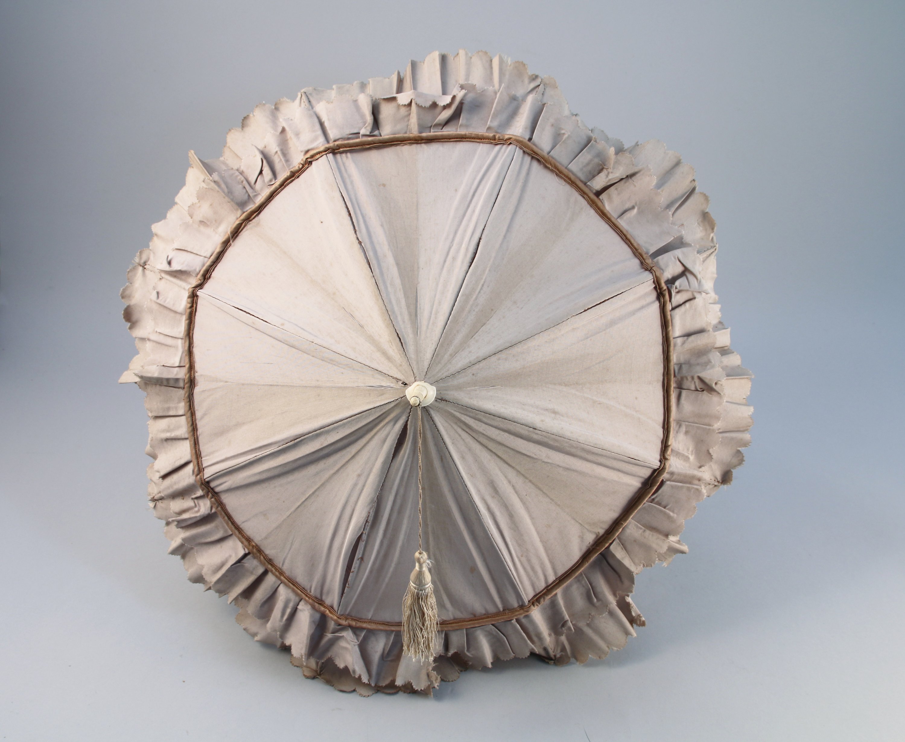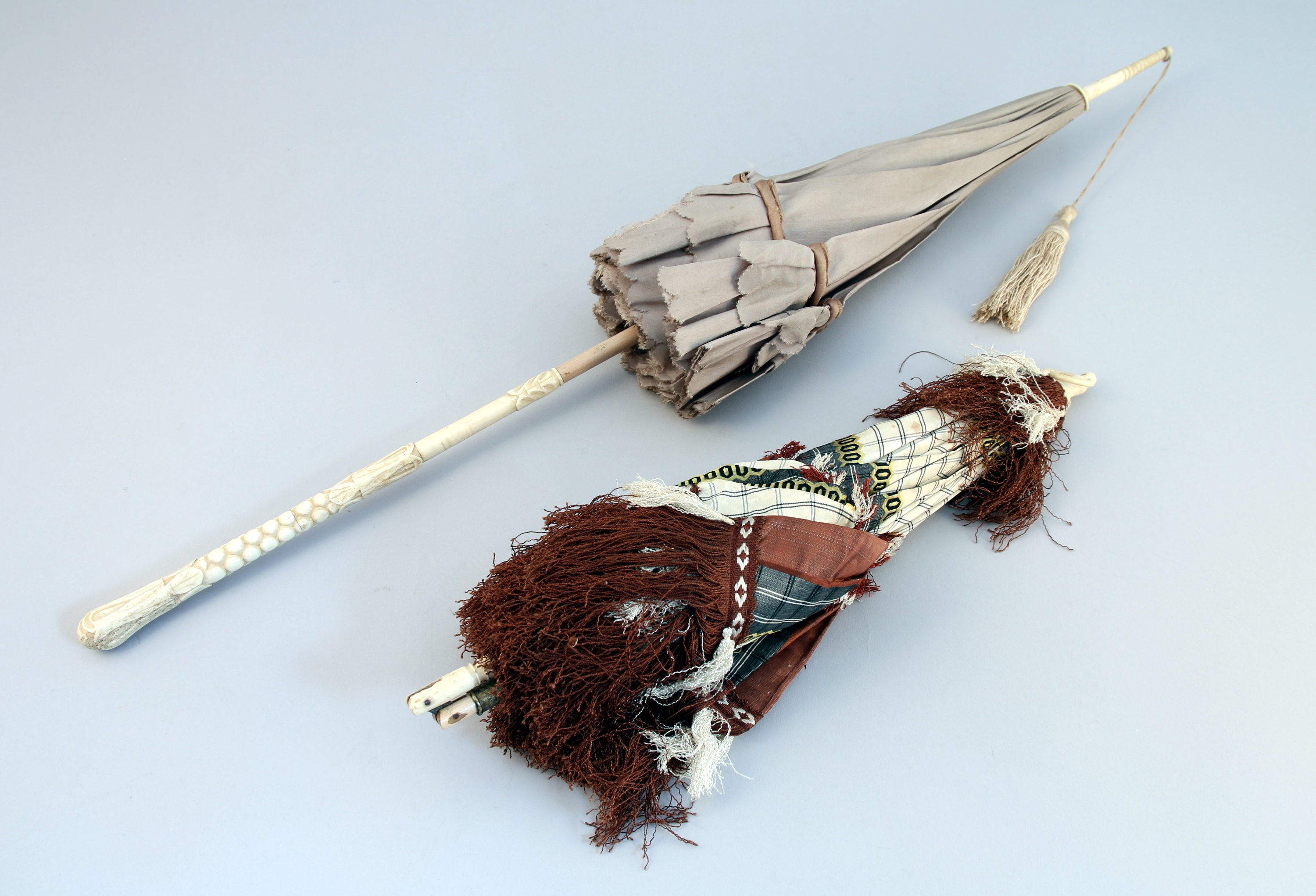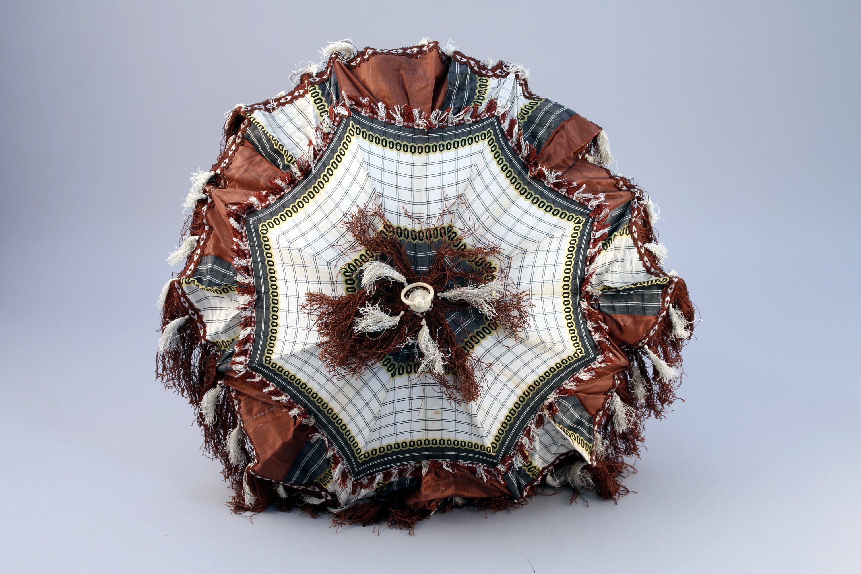 OMBRELLE à manche repliable en os sculpté. Couverture en soie à motifs géométriques et bords frangés.
