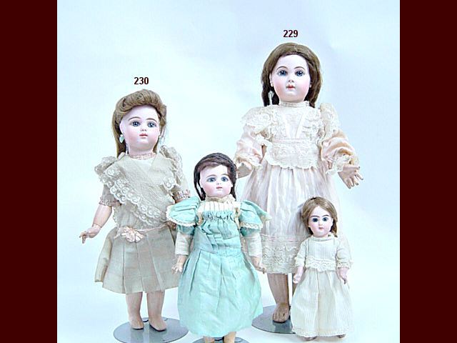 Bouche fermée, yeux de sulfure bleu, oreilles percées, corps articulé à poignets fixes (accidents aux doigts), robe en partie ancienne, perruque. 34 cm.