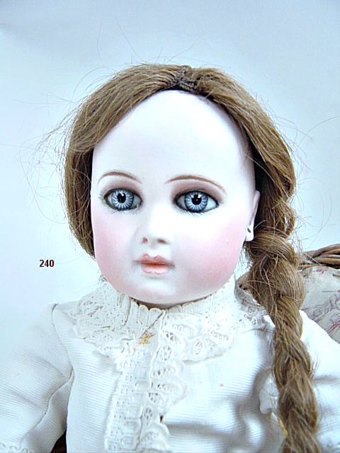 Bouche fermée, yeux de sulfure bleu à rayons, oreilles percées, corps articulé à 8 boules et poignets fixes, marqué au tampon bleu "Jumeau Médaille d'Or Paris", manteau blanc d'époque et perruque. (grain de beauté sur la joue gauche). 46 cm.