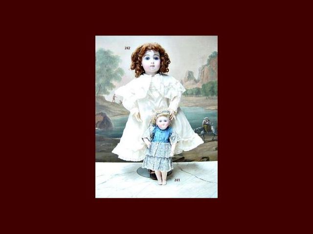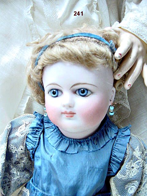 Bouche fermée, yeux de sulfure bleu à rayons, oreilles percées avec boucles d'oreilles, beau corps articulé d'origine à fessier plat portant l'Écusson. Robe de style ancien, perruque blonde en mohair. 36 cm.